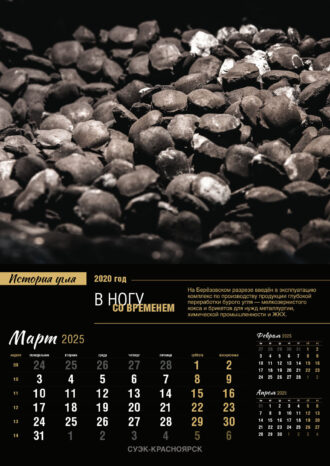 В серии календарей (настенный и настольный) сделанные в разное время суток фотографии за счет игры теней и солнечного цвета передают простор и мощь угольных разрезов, совершенство горной техники и красоту сибирской природы. Усиленные антрацитовым блеском обложки внушают уважение к угольной отрасли и говорят о ее великом прошлом и ясных перспективах.