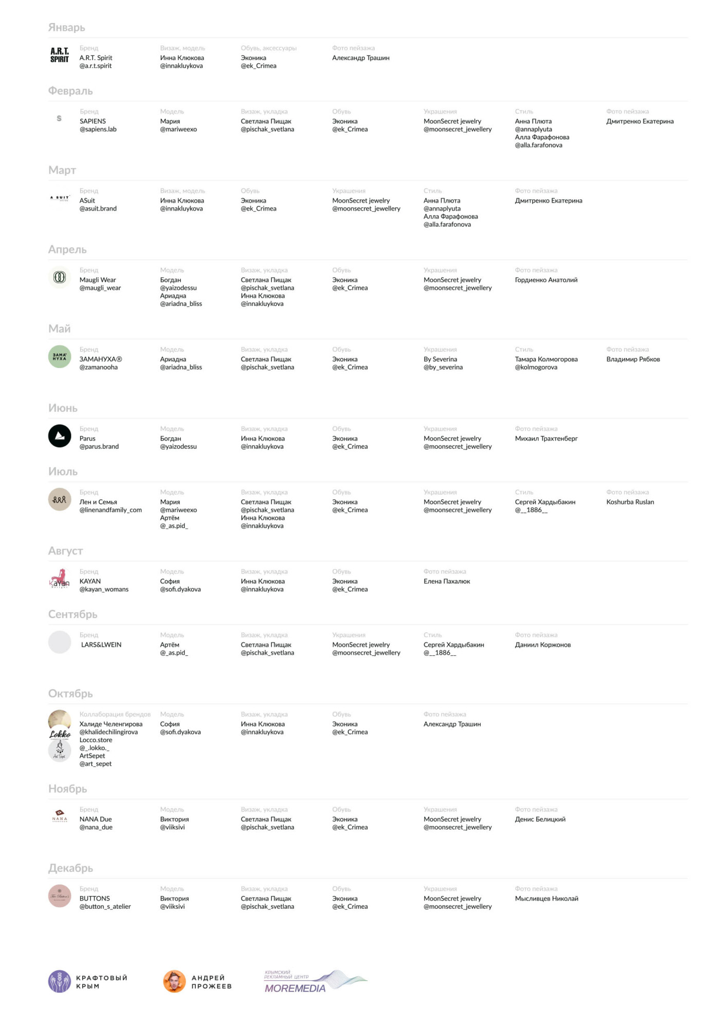 В проекте представлены коллекции региональных марок одежды. Стилистическая концепция выстроена как визуальный диалог моды и природы. Каждый месяц – это самостоятельная художественная сцена с собственным настроением и характером.