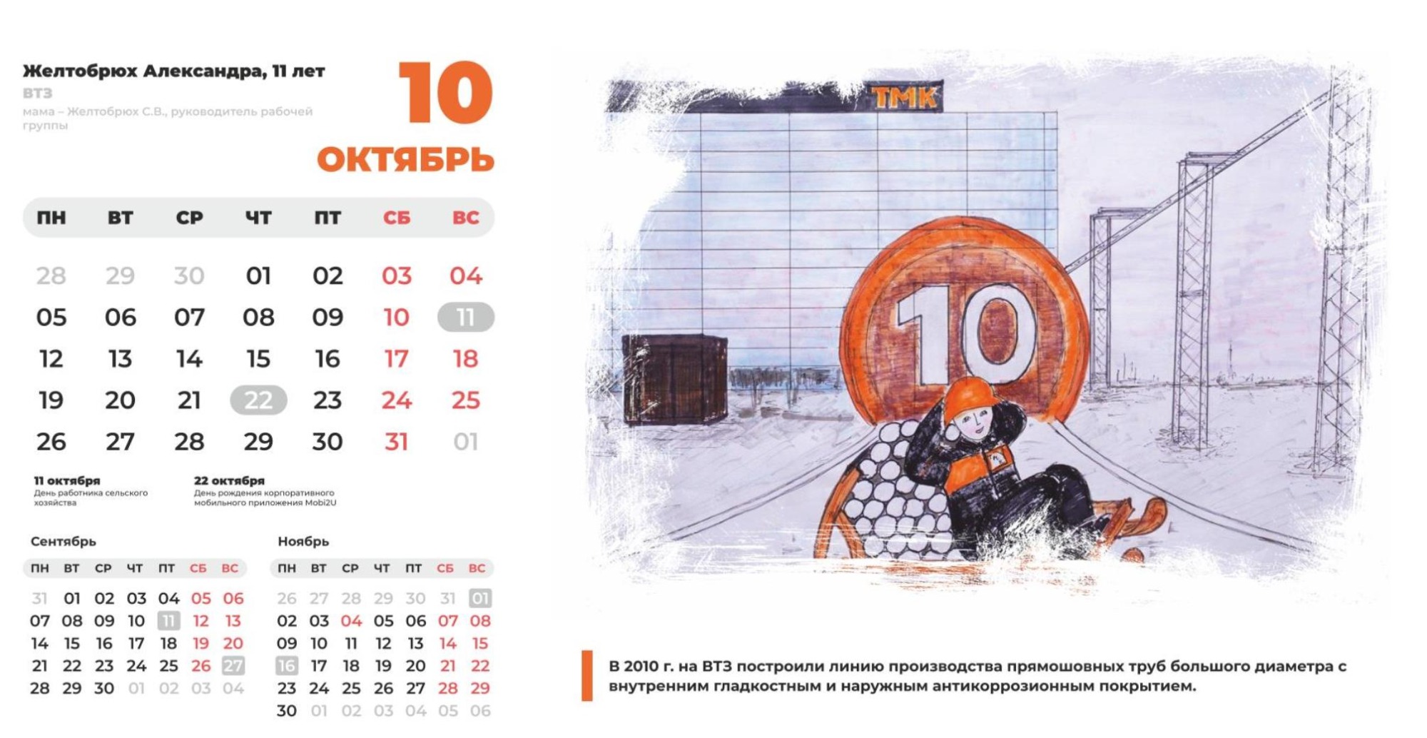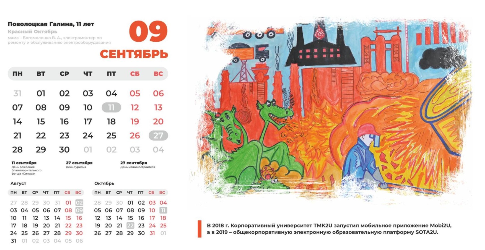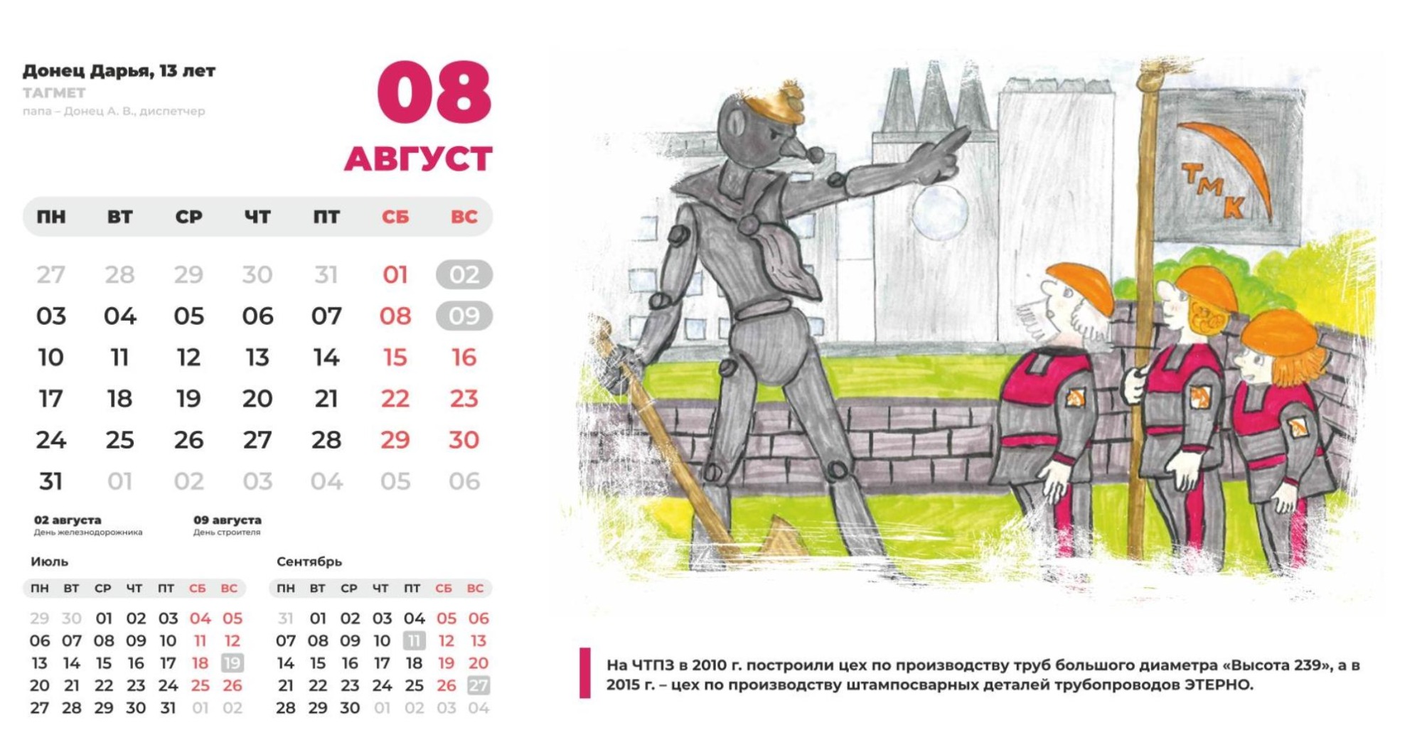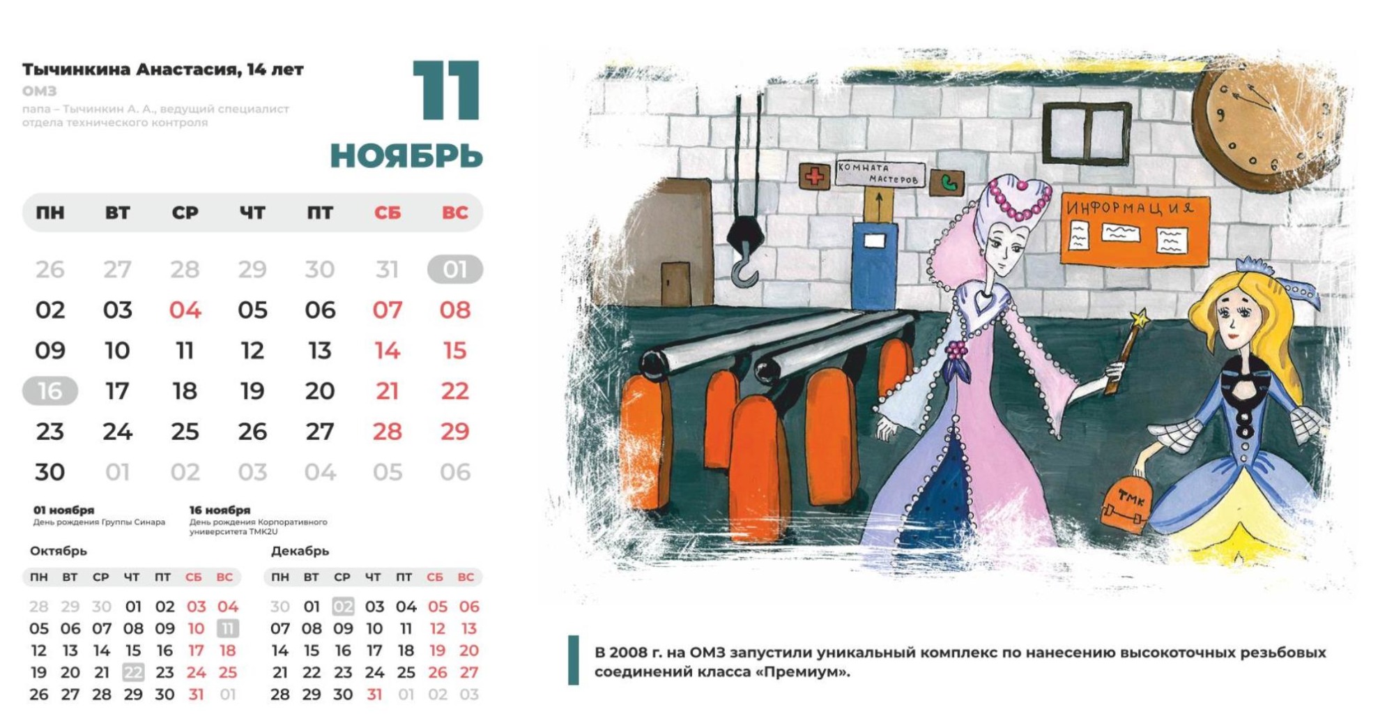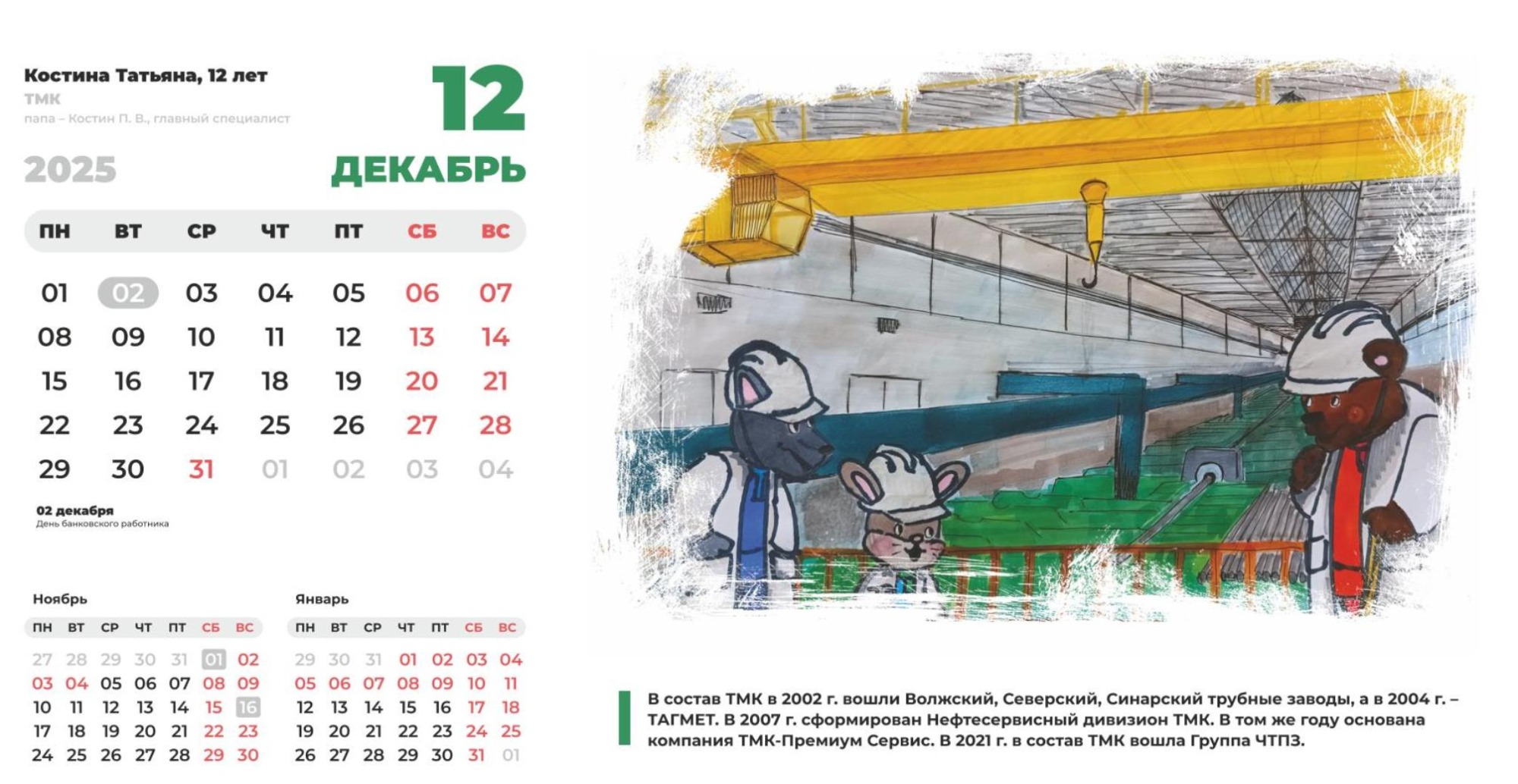 Особенность календаря в том, что все иллюстрации создают дети сотрудников предприятий ТМК. Настольный календарь с рисунками юных художников выпускается с 2021 года. Проект позволяет ребятам приобщиться к той части жизни родителей, которая от них обычно закрыта, познакомиться с заводами и рабочими специальностями.