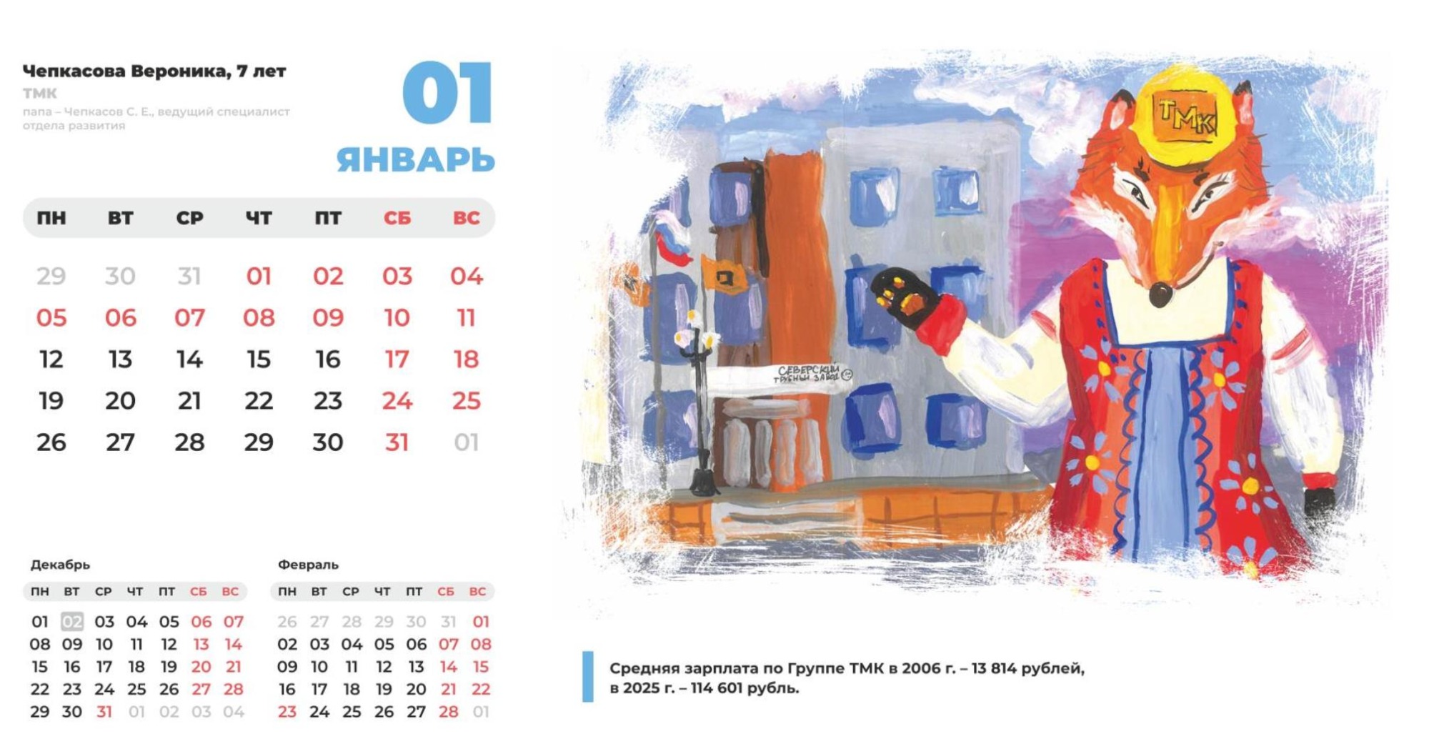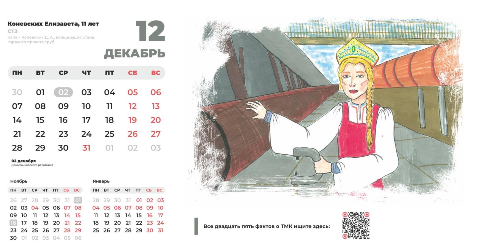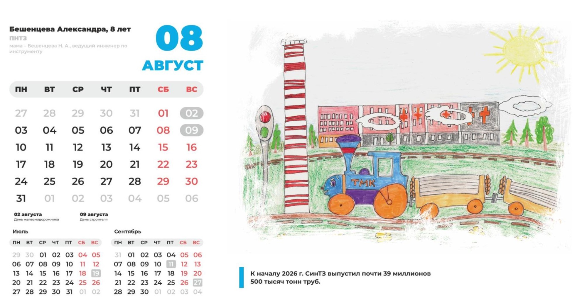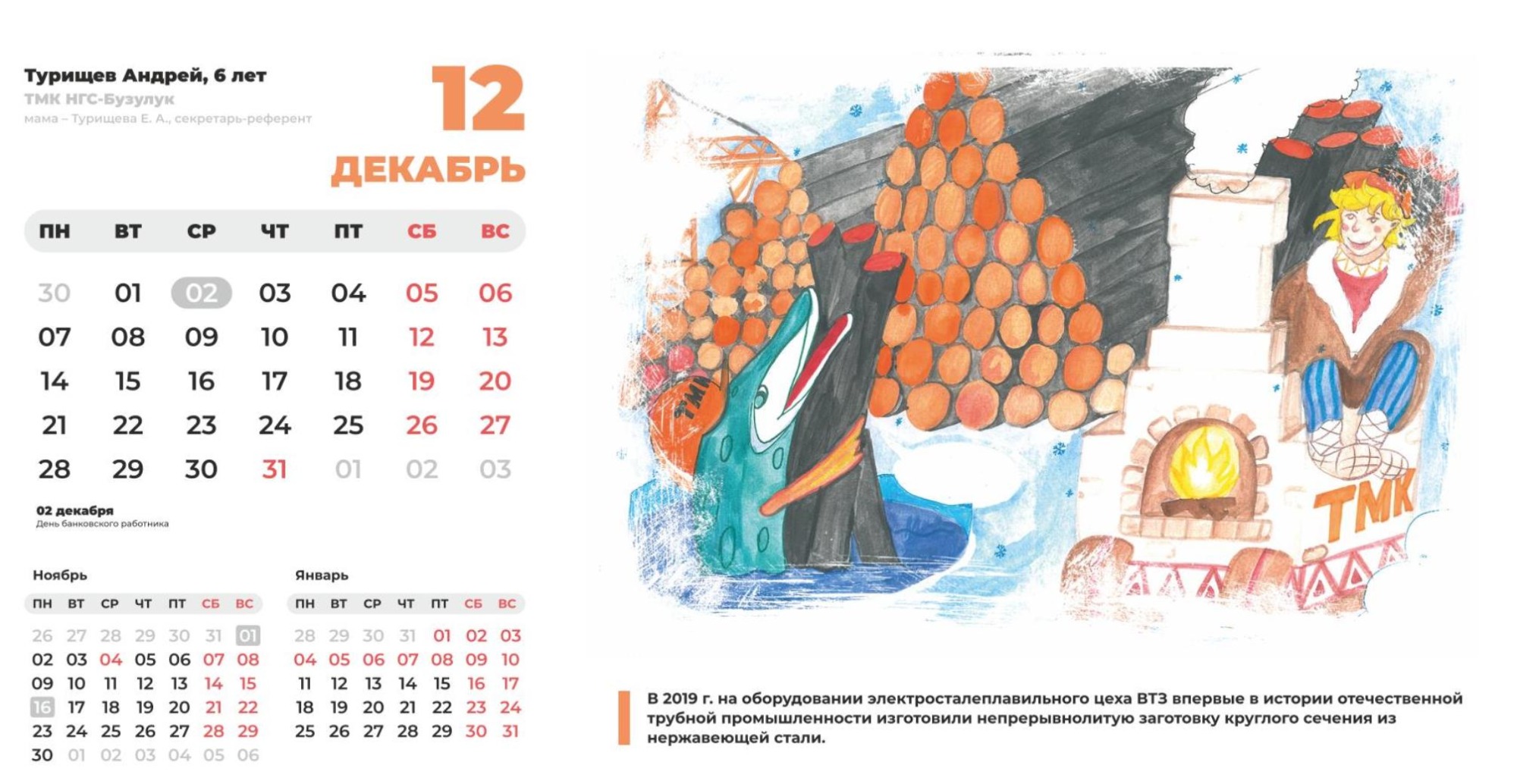 Особенность календаря в том, что все иллюстрации создают дети сотрудников предприятий ТМК. Настольный календарь с рисунками юных художников выпускается с 2021 года. Проект позволяет ребятам приобщиться к той части жизни родителей, которая от них обычно закрыта, познакомиться с заводами и рабочими специальностями.
