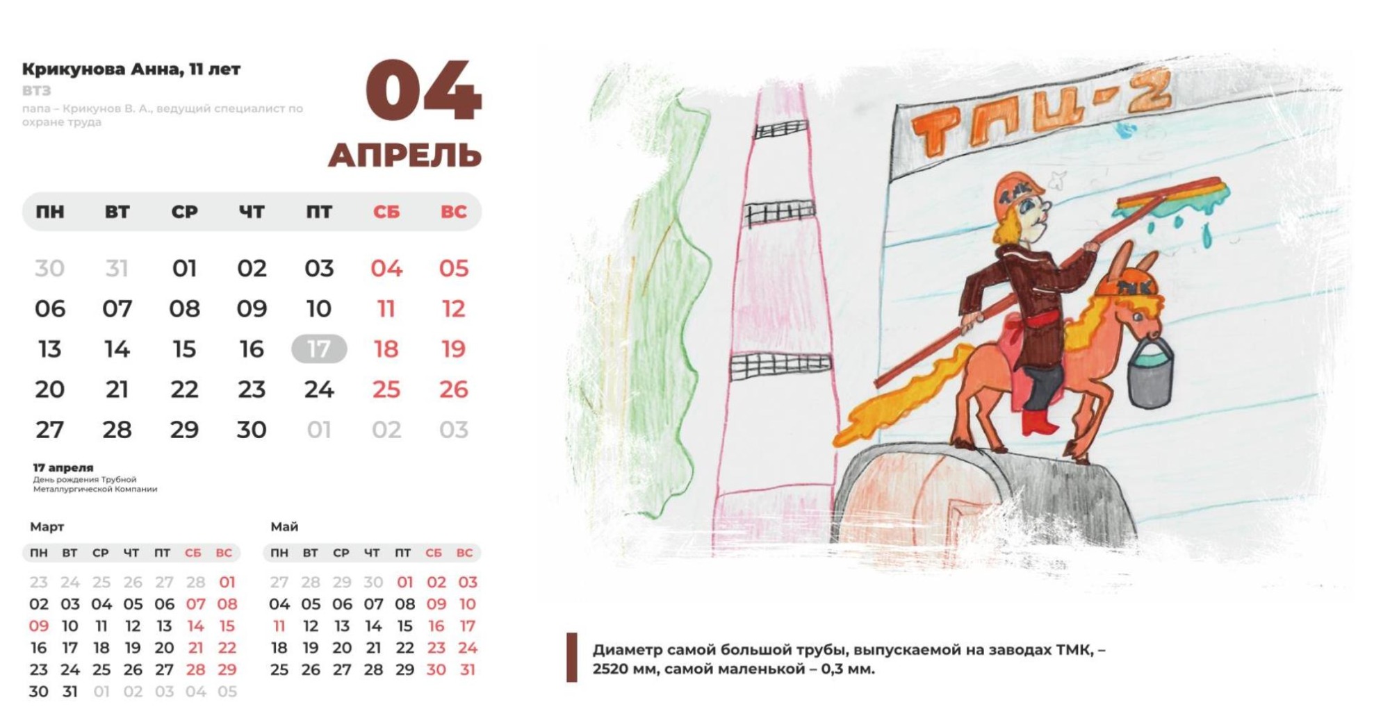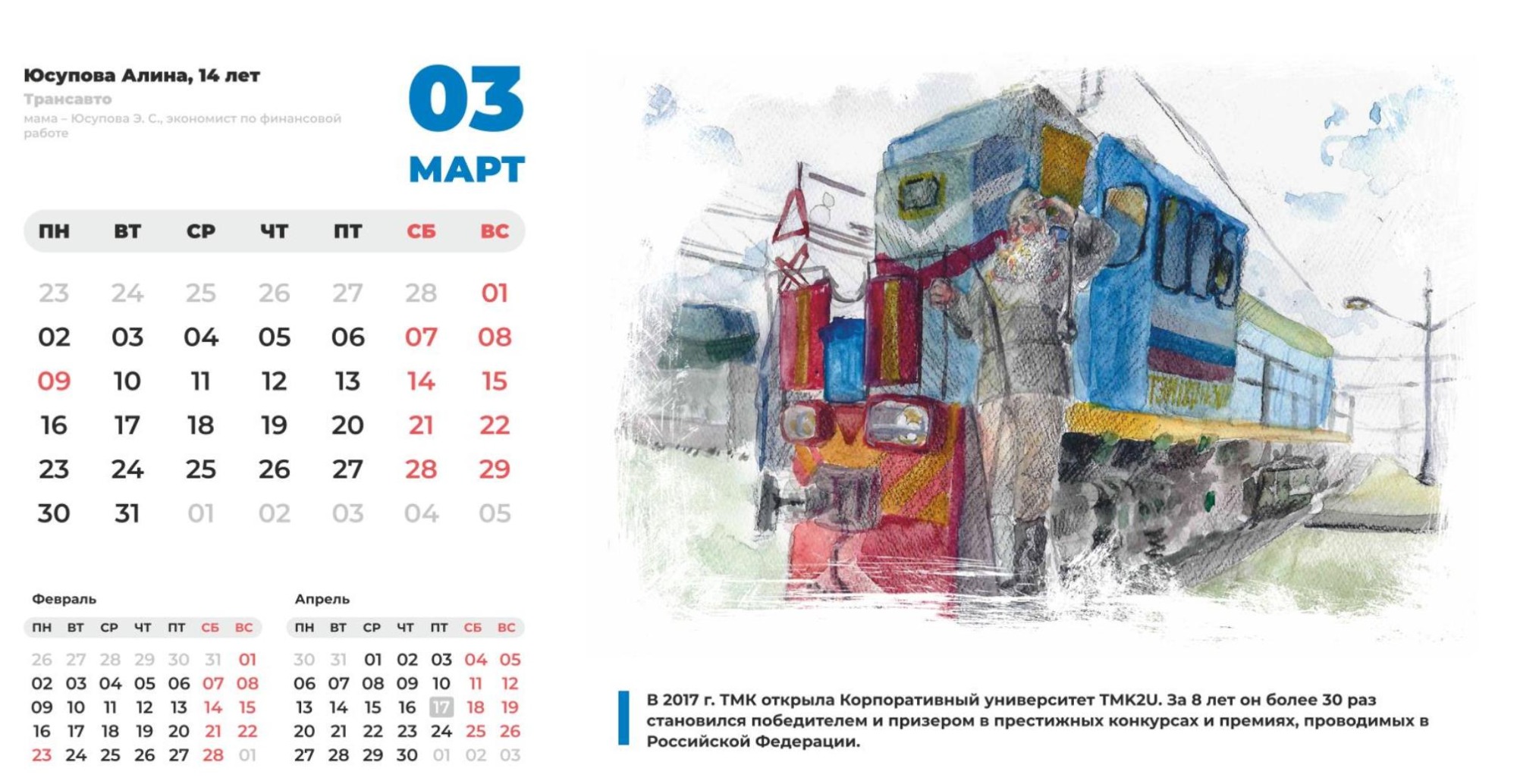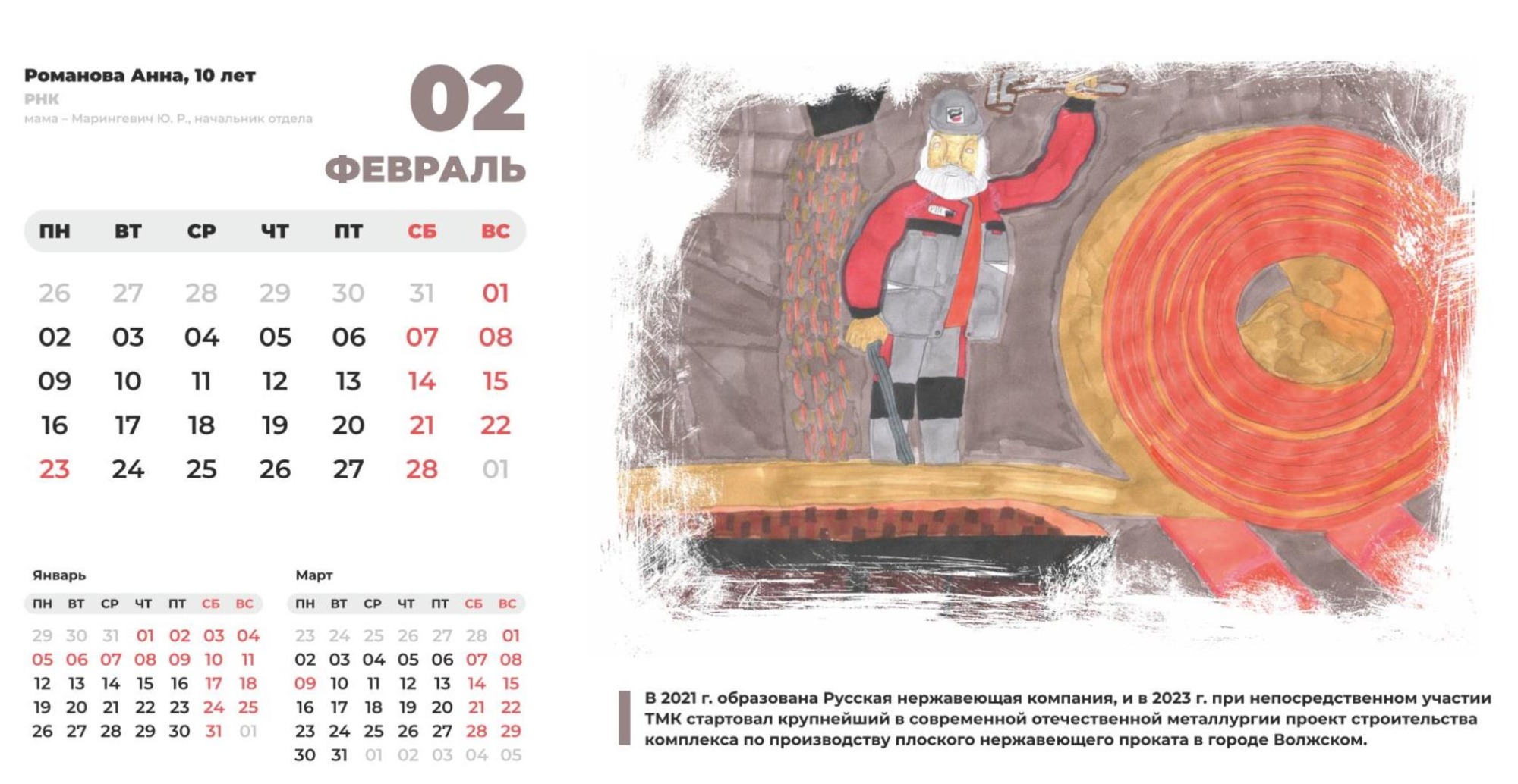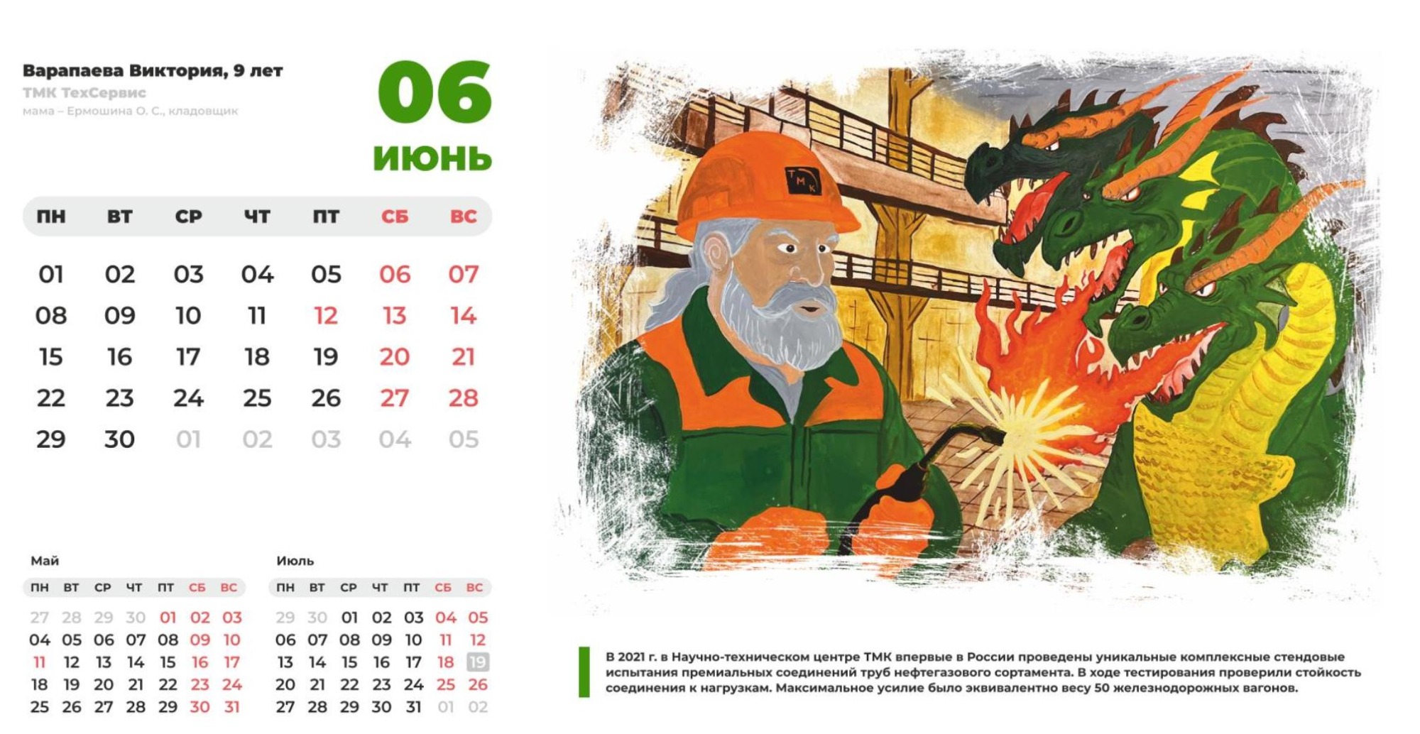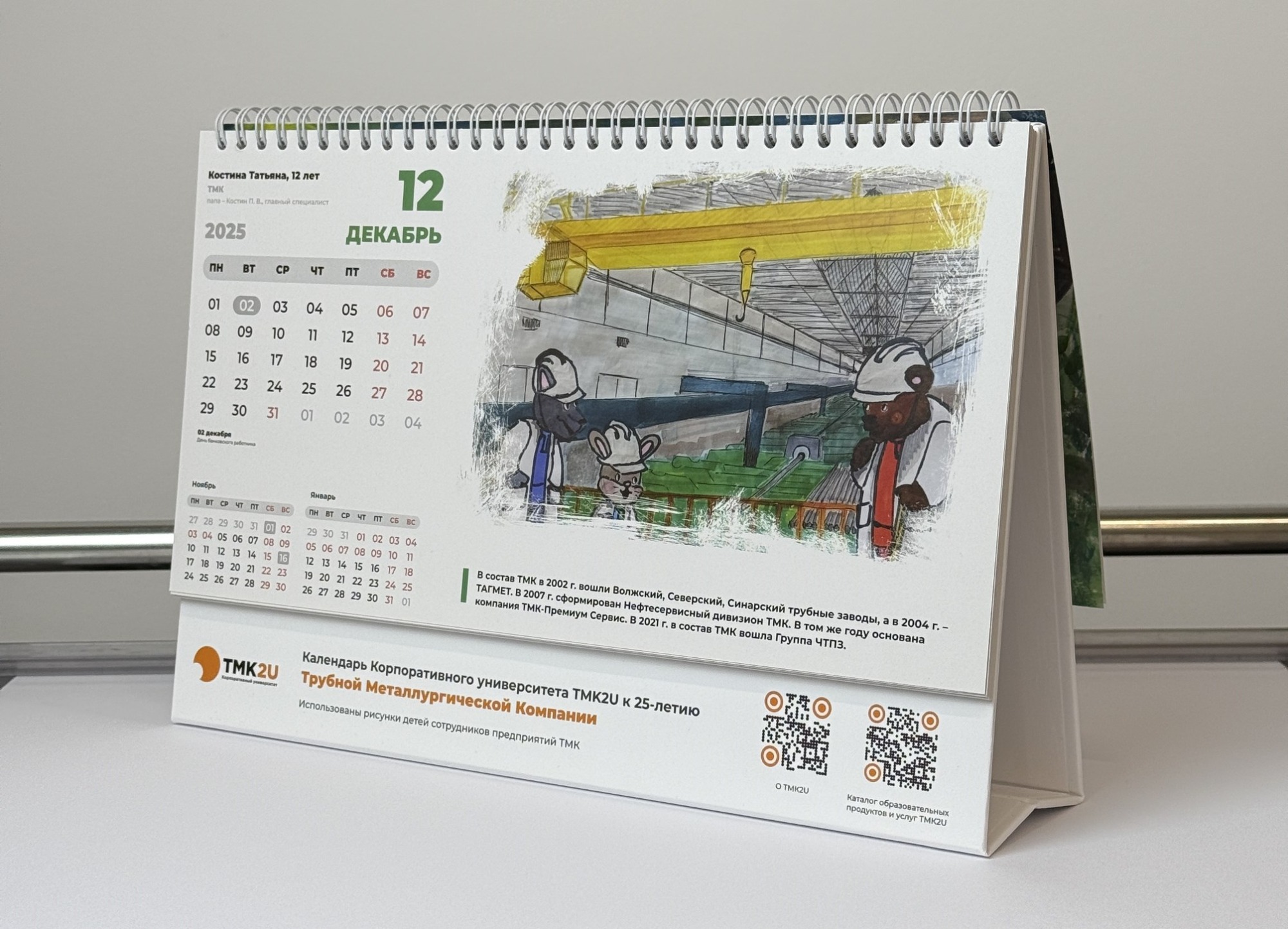 Особенность календаря в том, что все иллюстрации создают дети сотрудников предприятий ТМК. Настольный календарь с рисунками юных художников выпускается с 2021 года. Проект позволяет ребятам приобщиться к той части жизни родителей, которая от них обычно закрыта, познакомиться с заводами и рабочими специальностями.