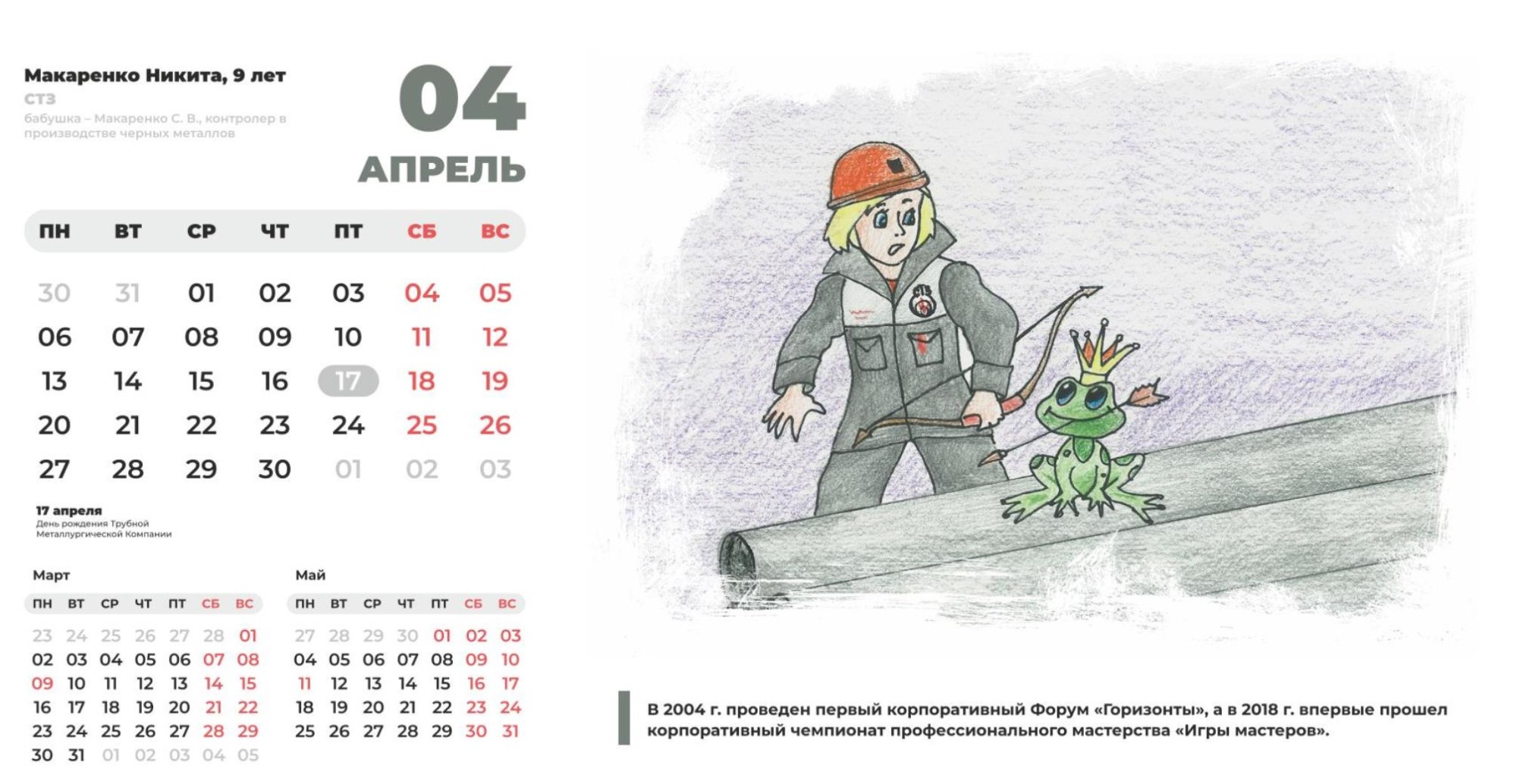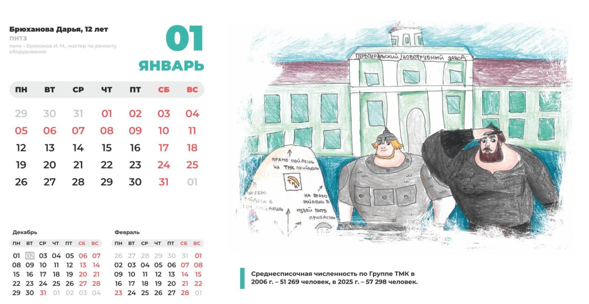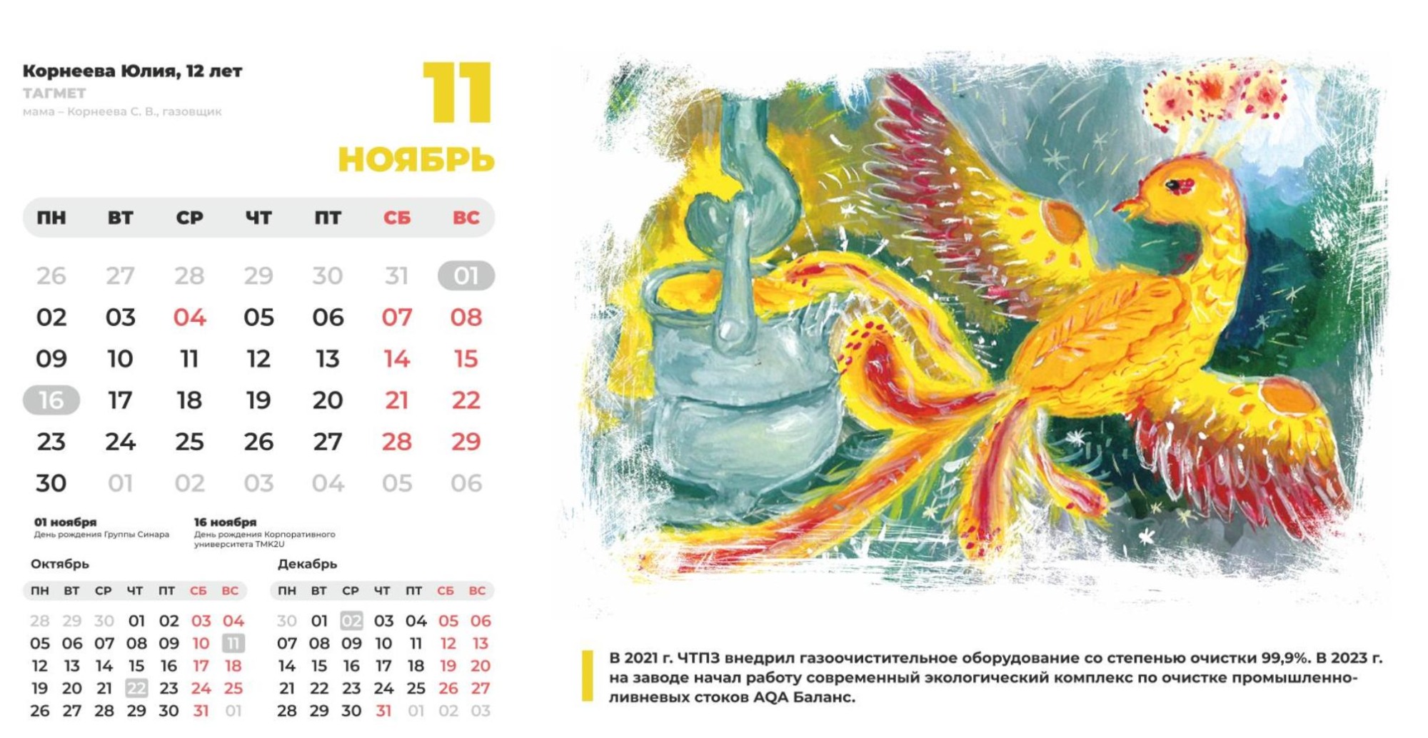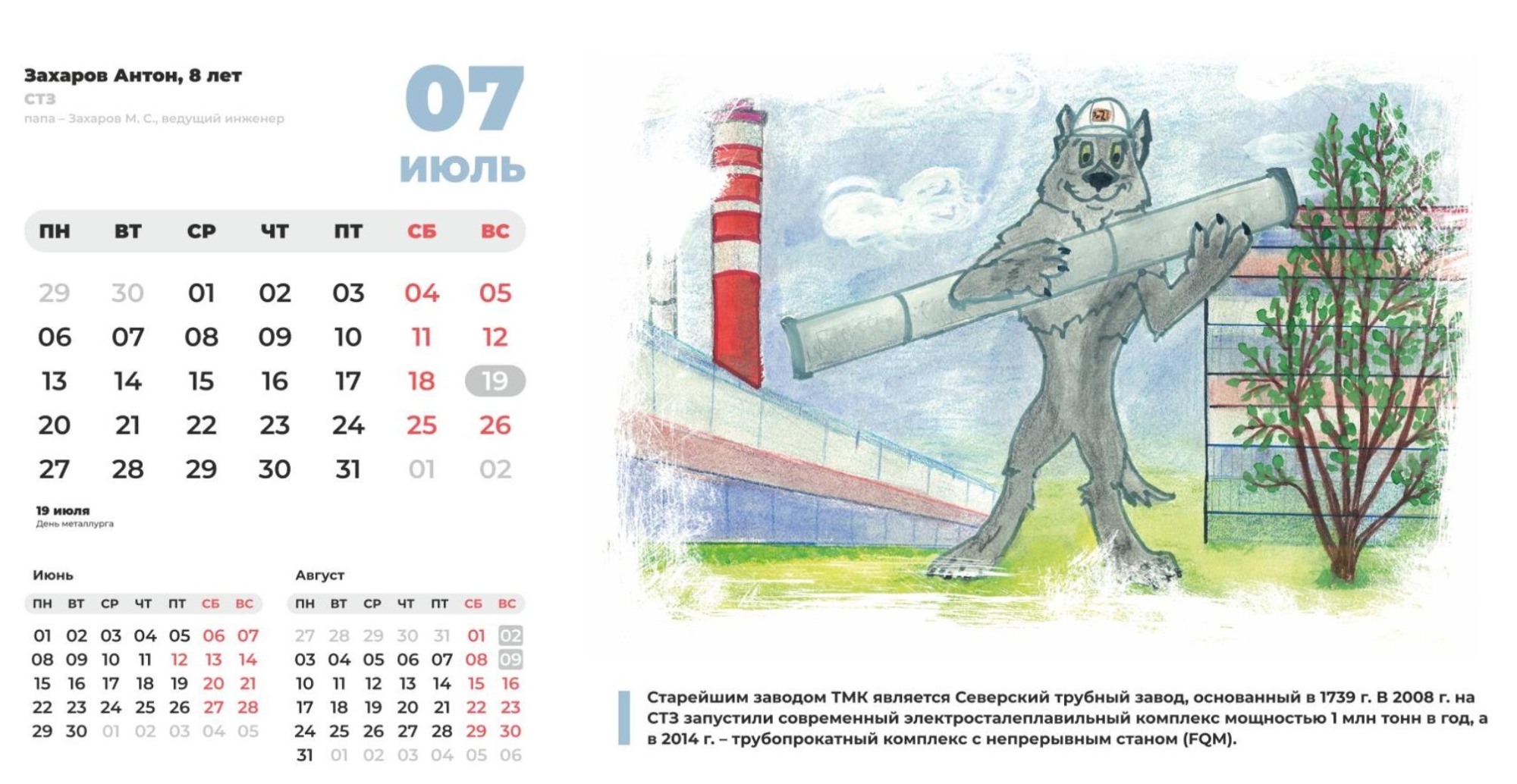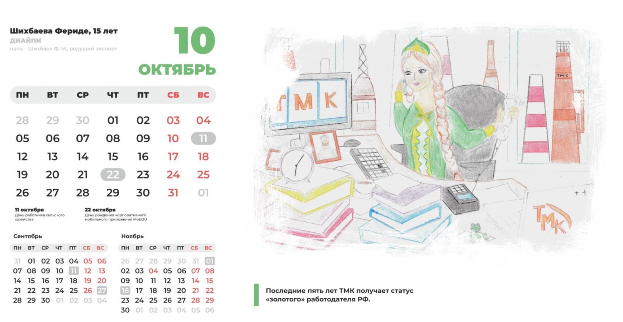 Особенность календаря в том, что все иллюстрации создают дети сотрудников предприятий ТМК. Настольный календарь с рисунками юных художников выпускается с 2021 года. Проект позволяет ребятам приобщиться к той части жизни родителей, которая от них обычно закрыта, познакомиться с заводами и рабочими специальностями.