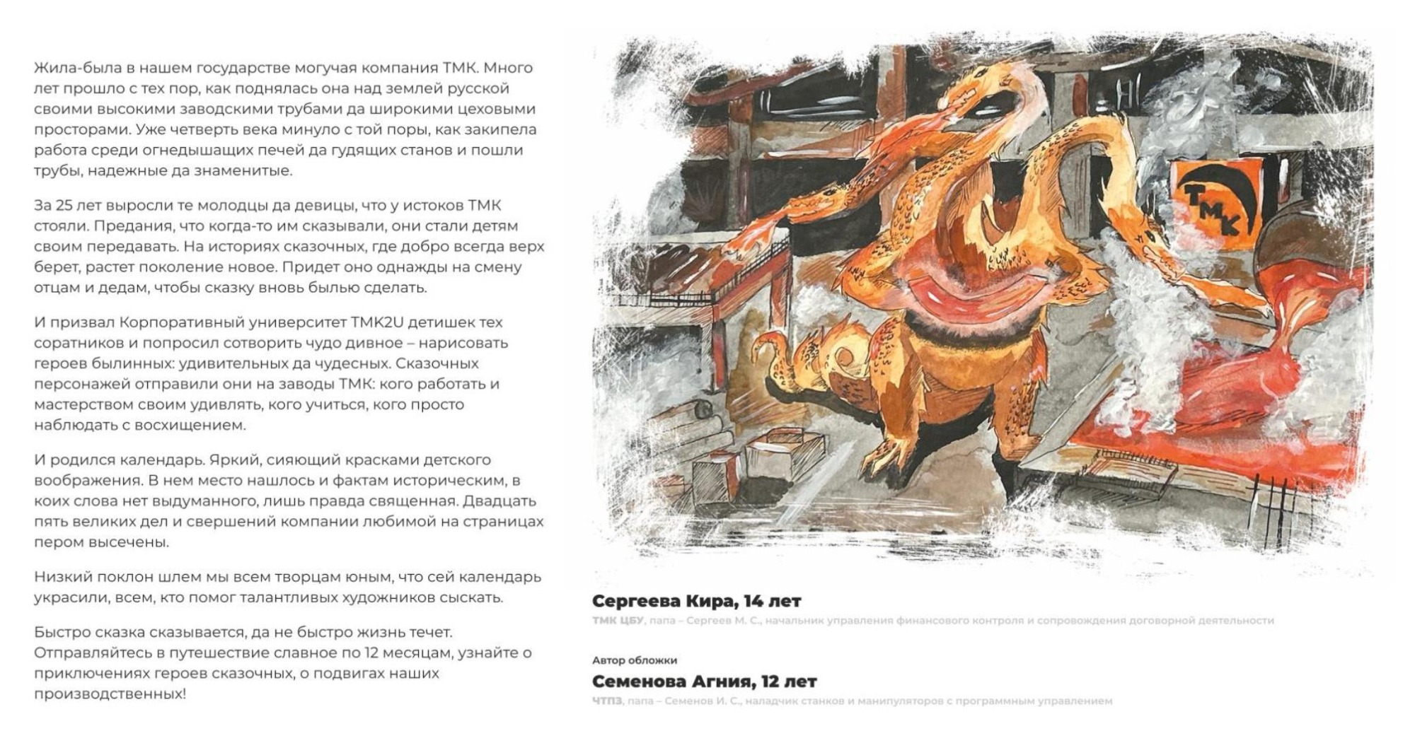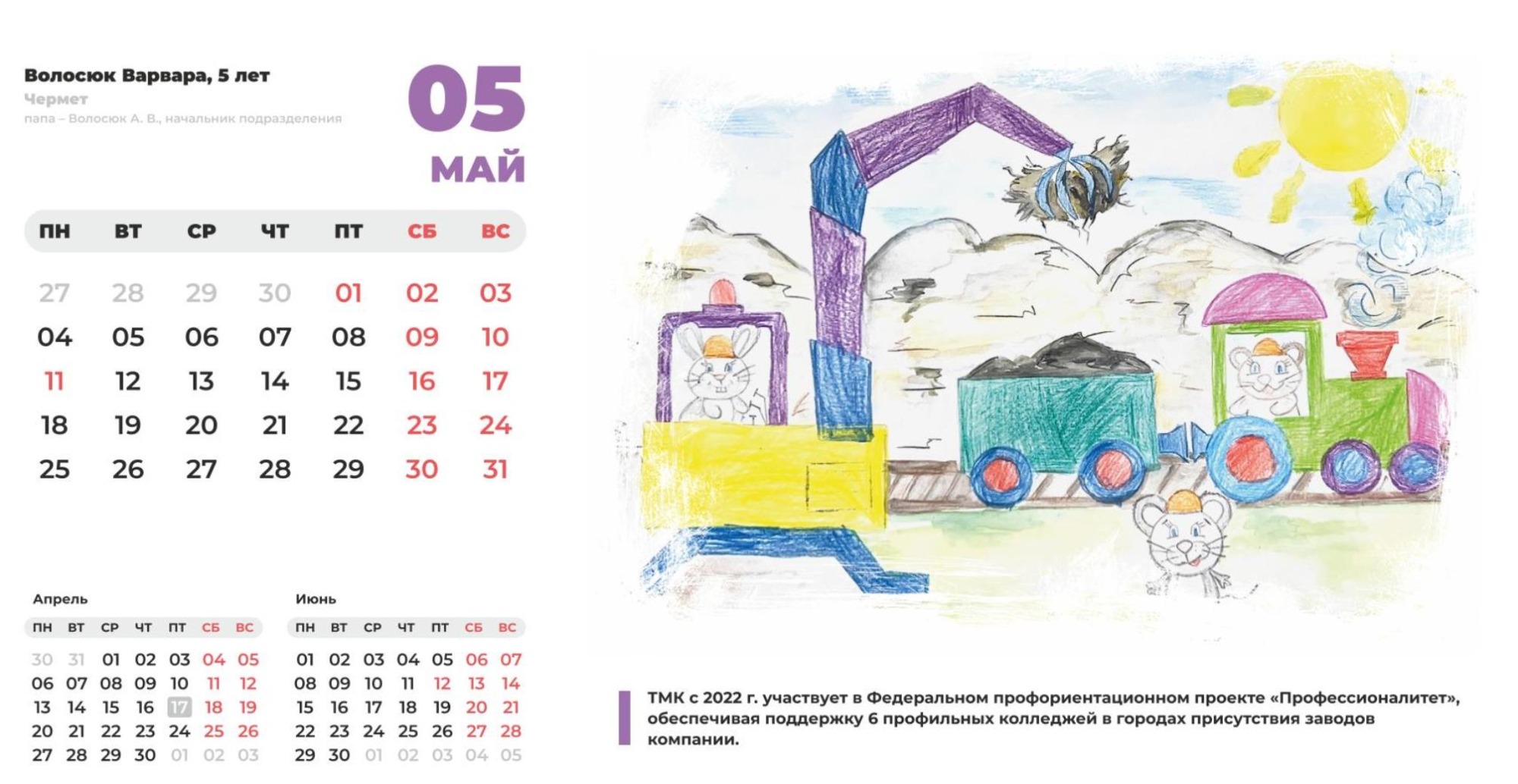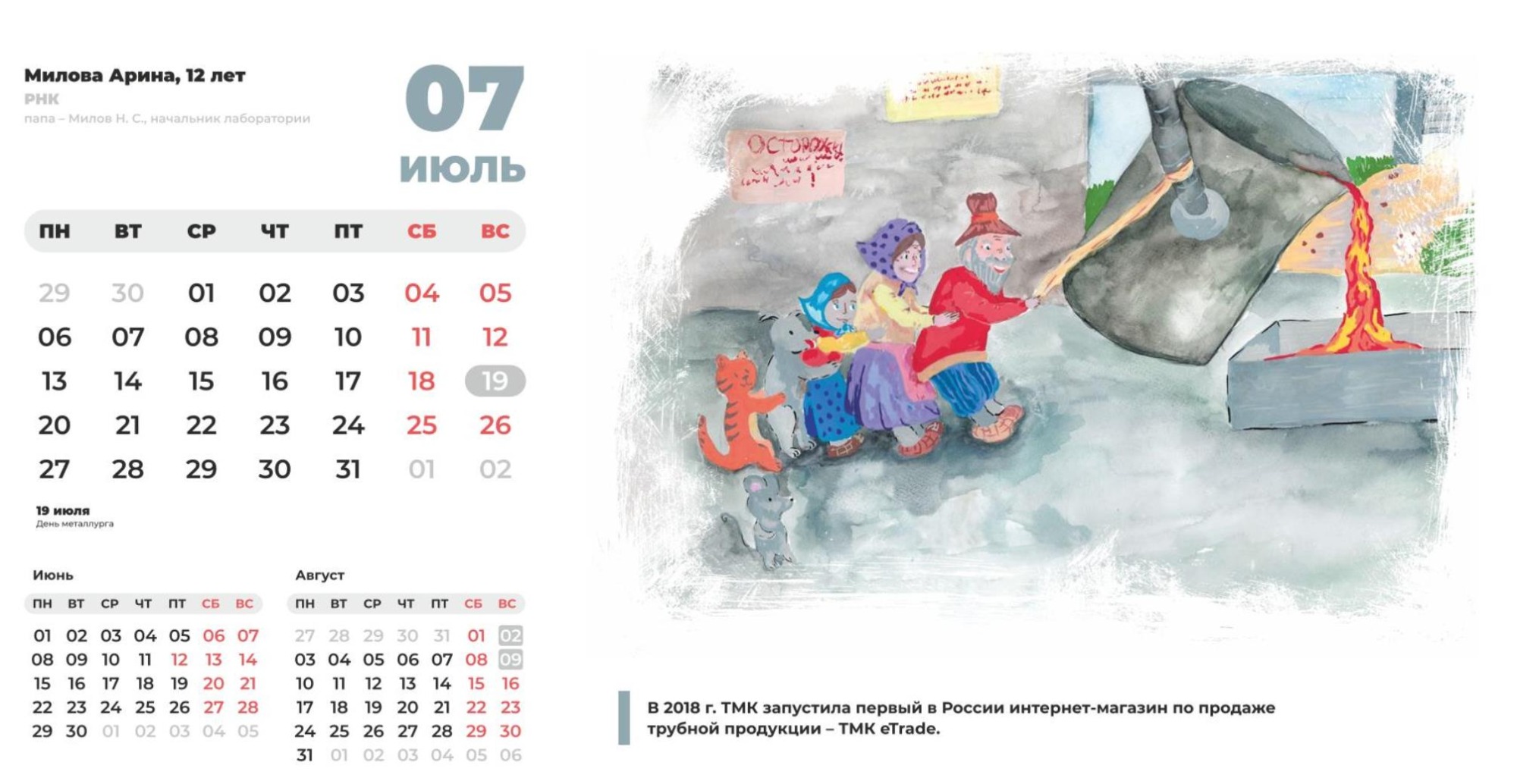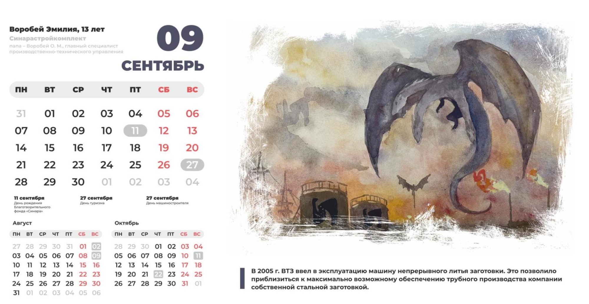 Особенность календаря в том, что все иллюстрации создают дети сотрудников предприятий ТМК. Настольный календарь с рисунками юных художников выпускается с 2021 года. Проект позволяет ребятам приобщиться к той части жизни родителей, которая от них обычно закрыта, познакомиться с заводами и рабочими специальностями.