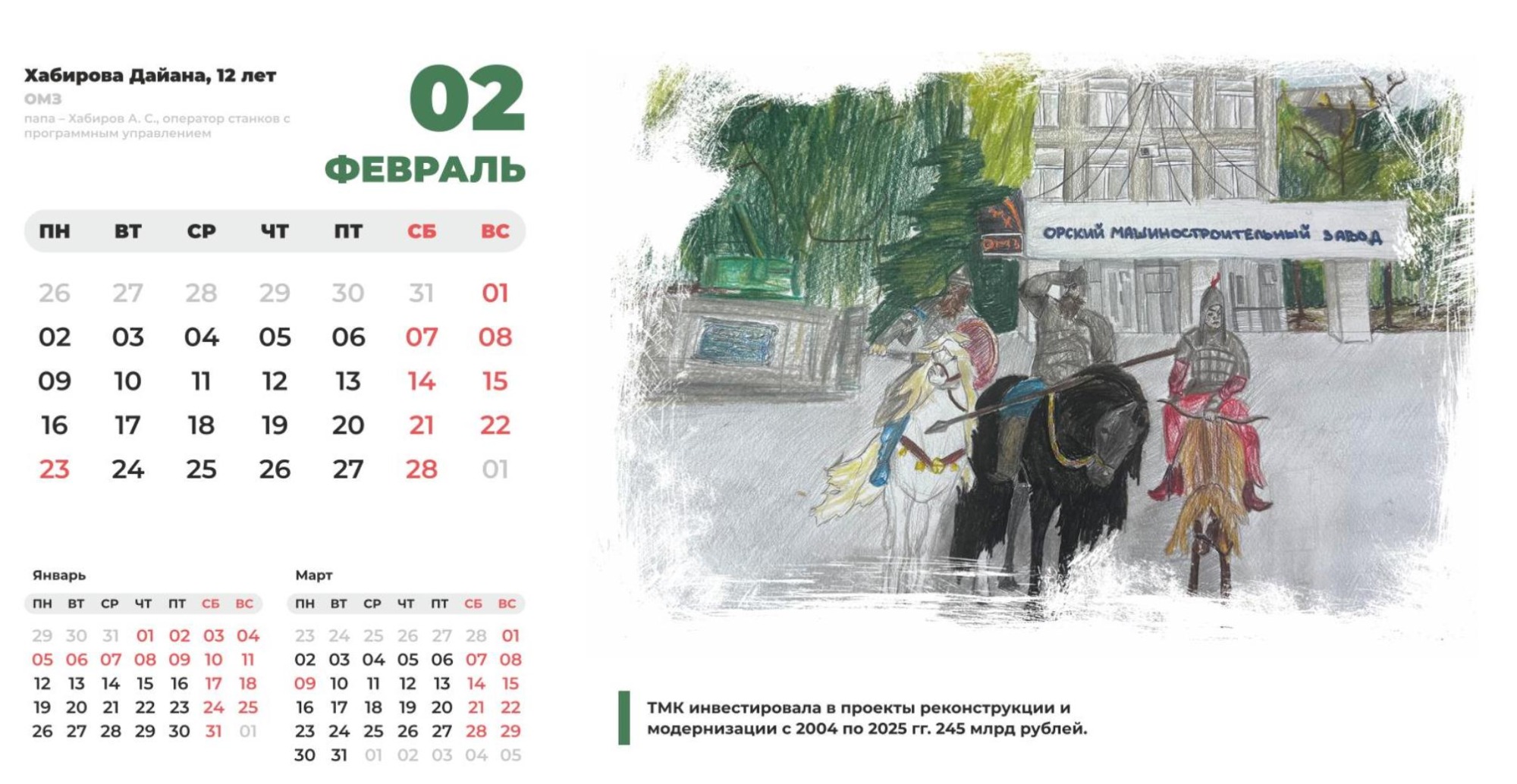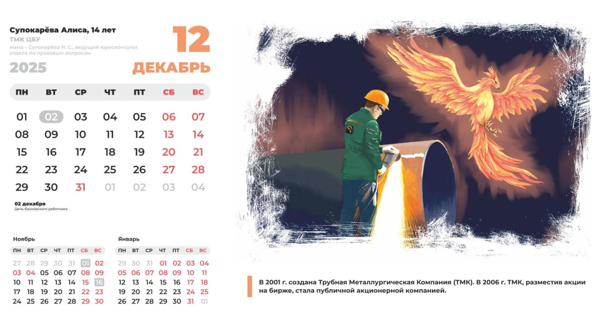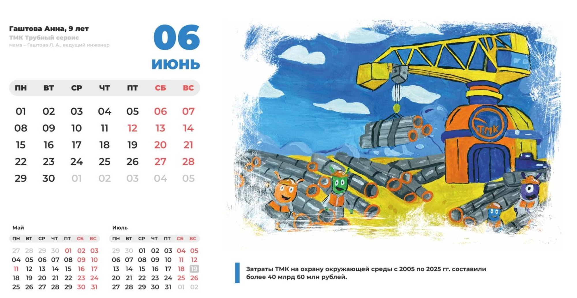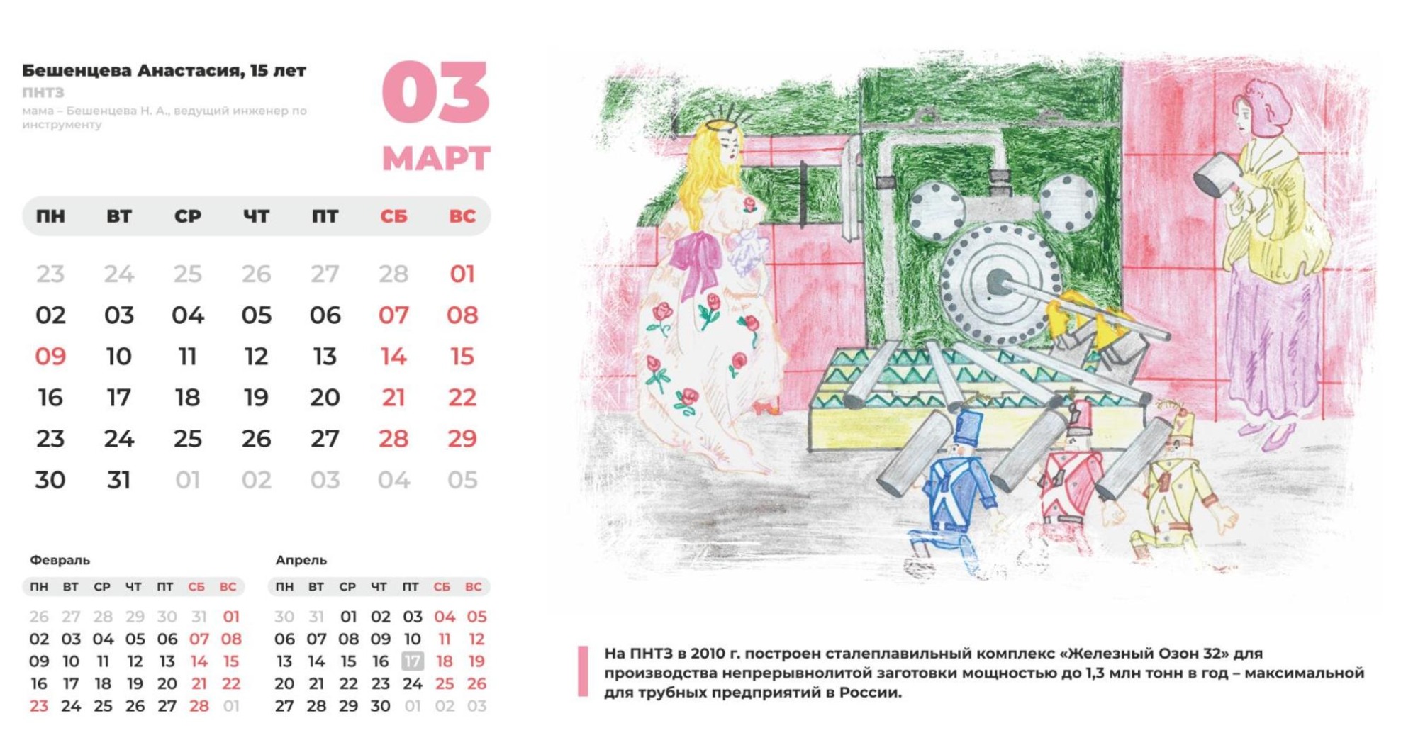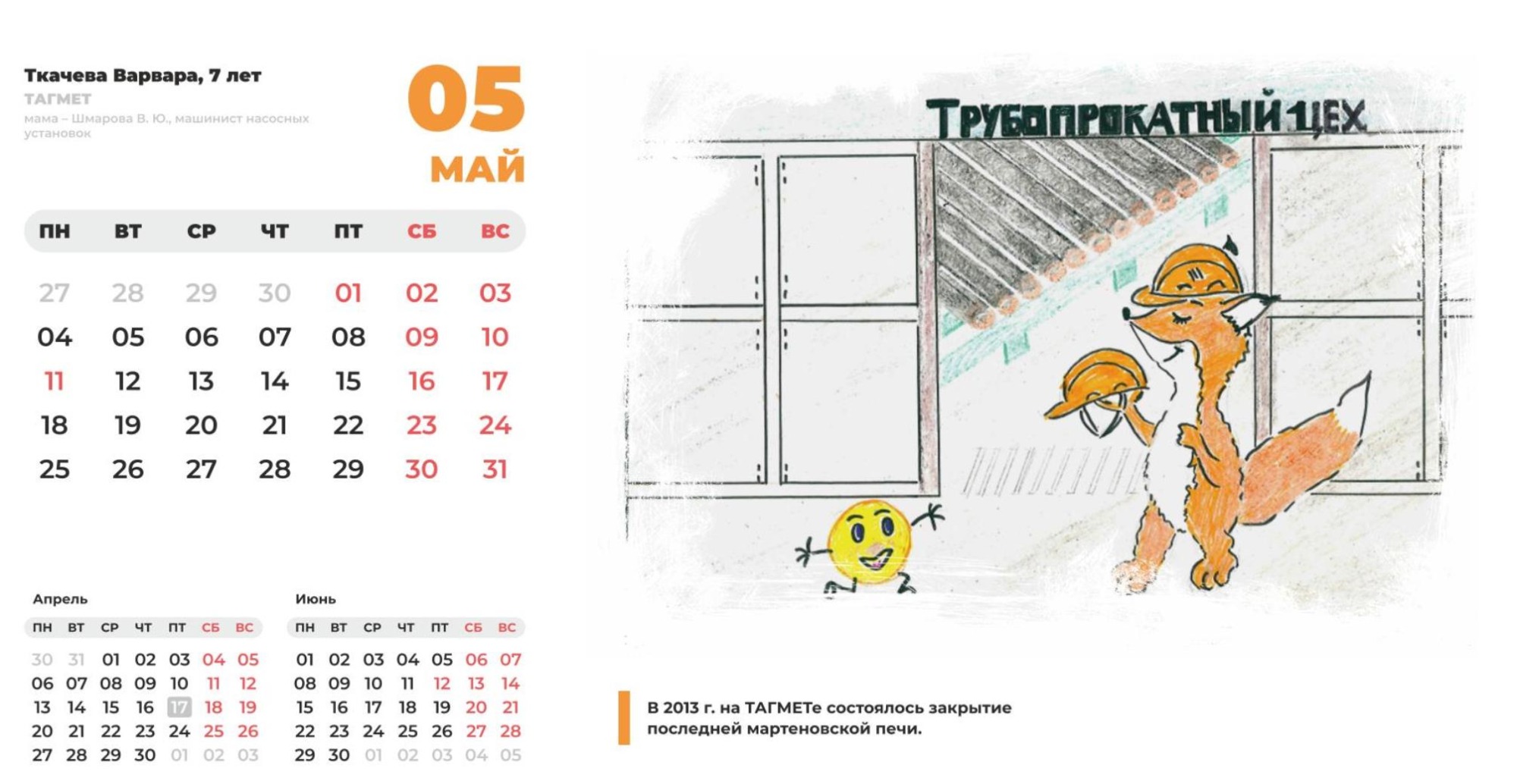 Особенность календаря в том, что все иллюстрации создают дети сотрудников предприятий ТМК. Настольный календарь с рисунками юных художников выпускается с 2021 года. Проект позволяет ребятам приобщиться к той части жизни родителей, которая от них обычно закрыта, познакомиться с заводами и рабочими специальностями.