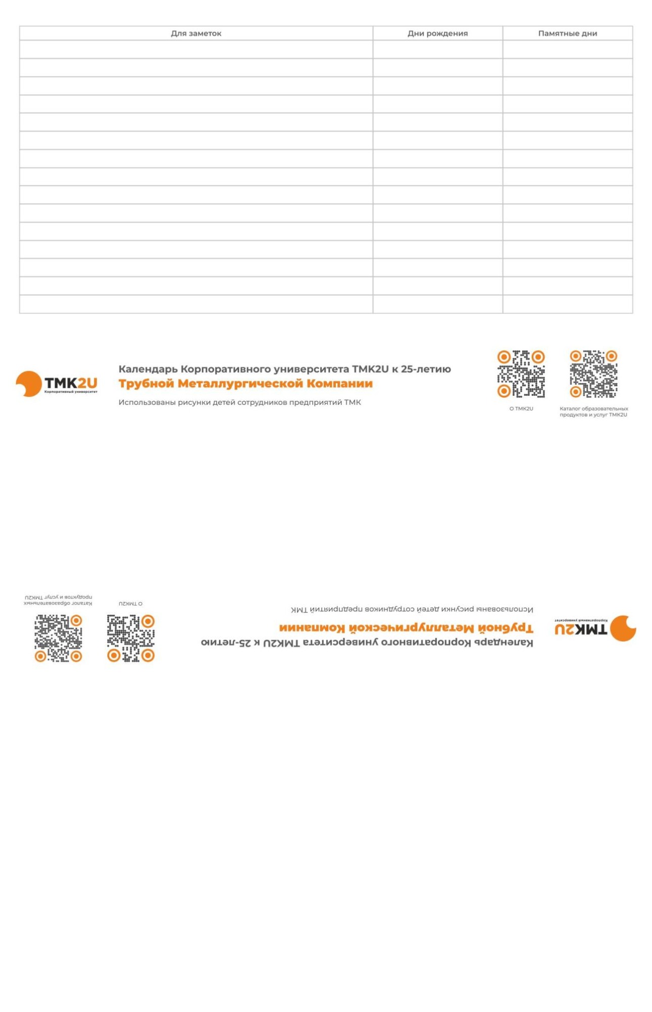 - В календарь добавляют приветственный текст и QR-коды, ведущие на каталог образовательных продуктов и на лендинг Корпоративного университета TMK2U.