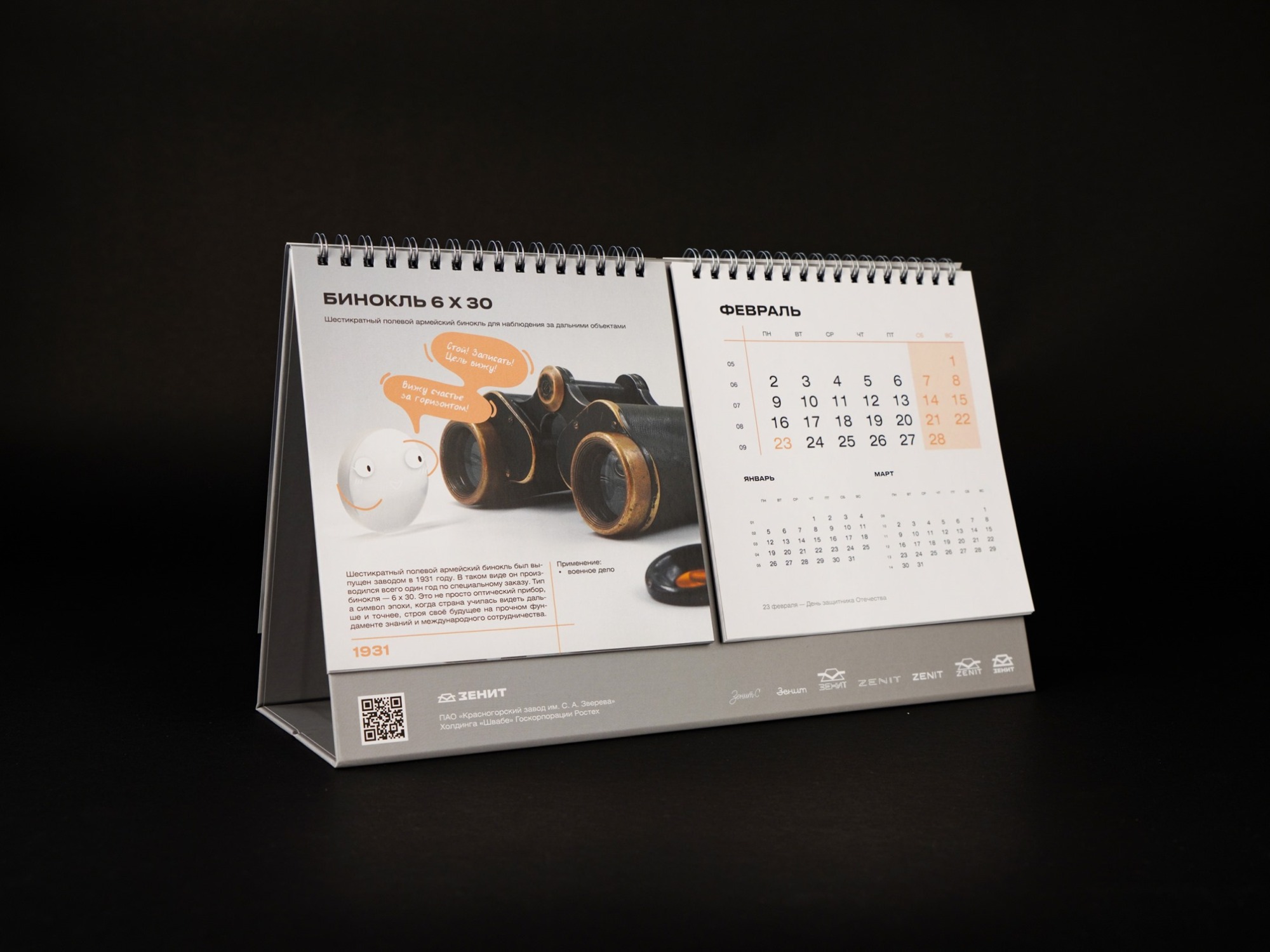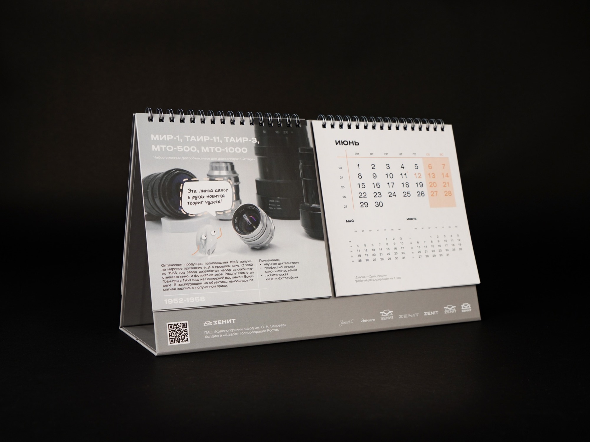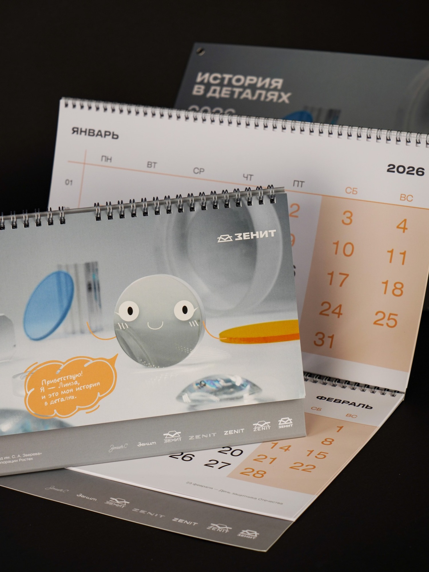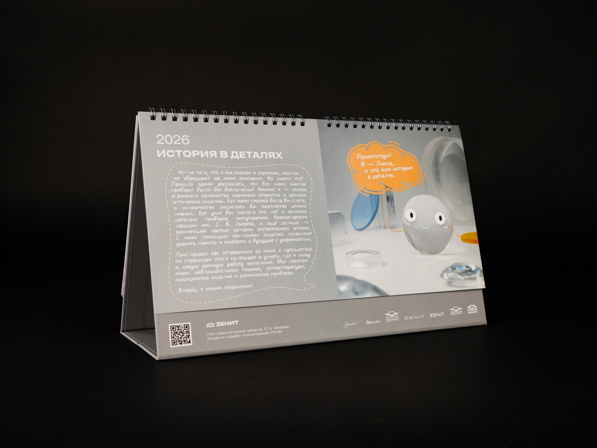 Макет календаря полностью изготовлен работниками отдела: от концепции до макета. Для его разработки были использованы архивные материалы и проведена профессиональная фотосъёмка экспонатов музея ПАО КМЗ вместе с главным персонажем – деталью Линзой.
