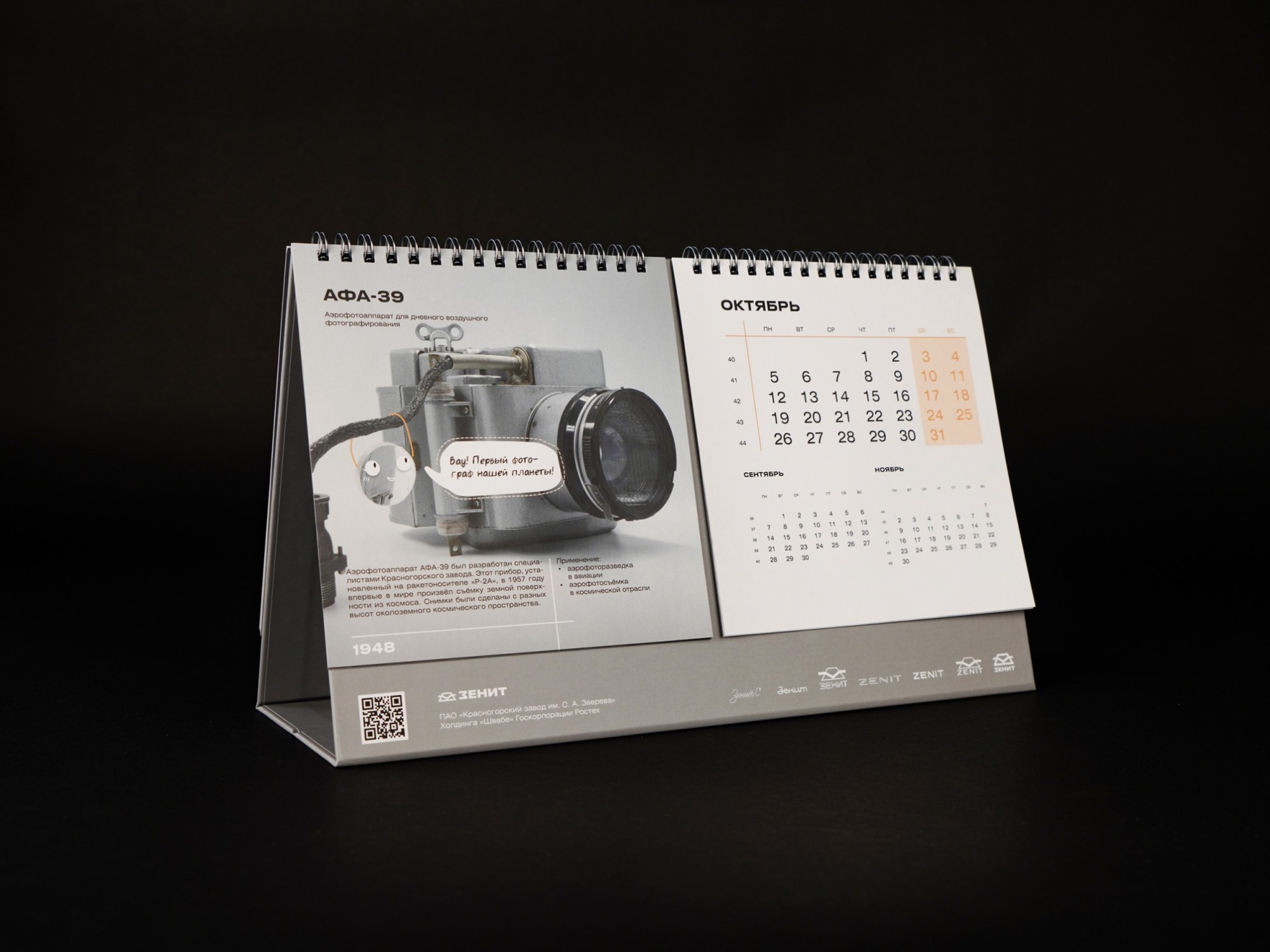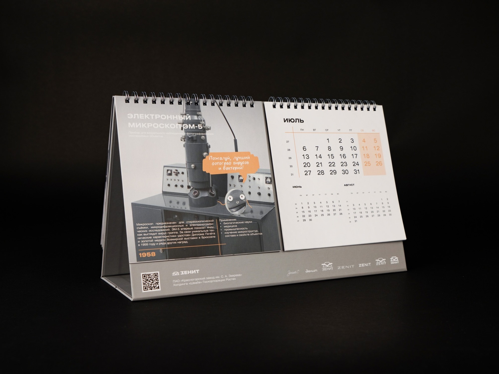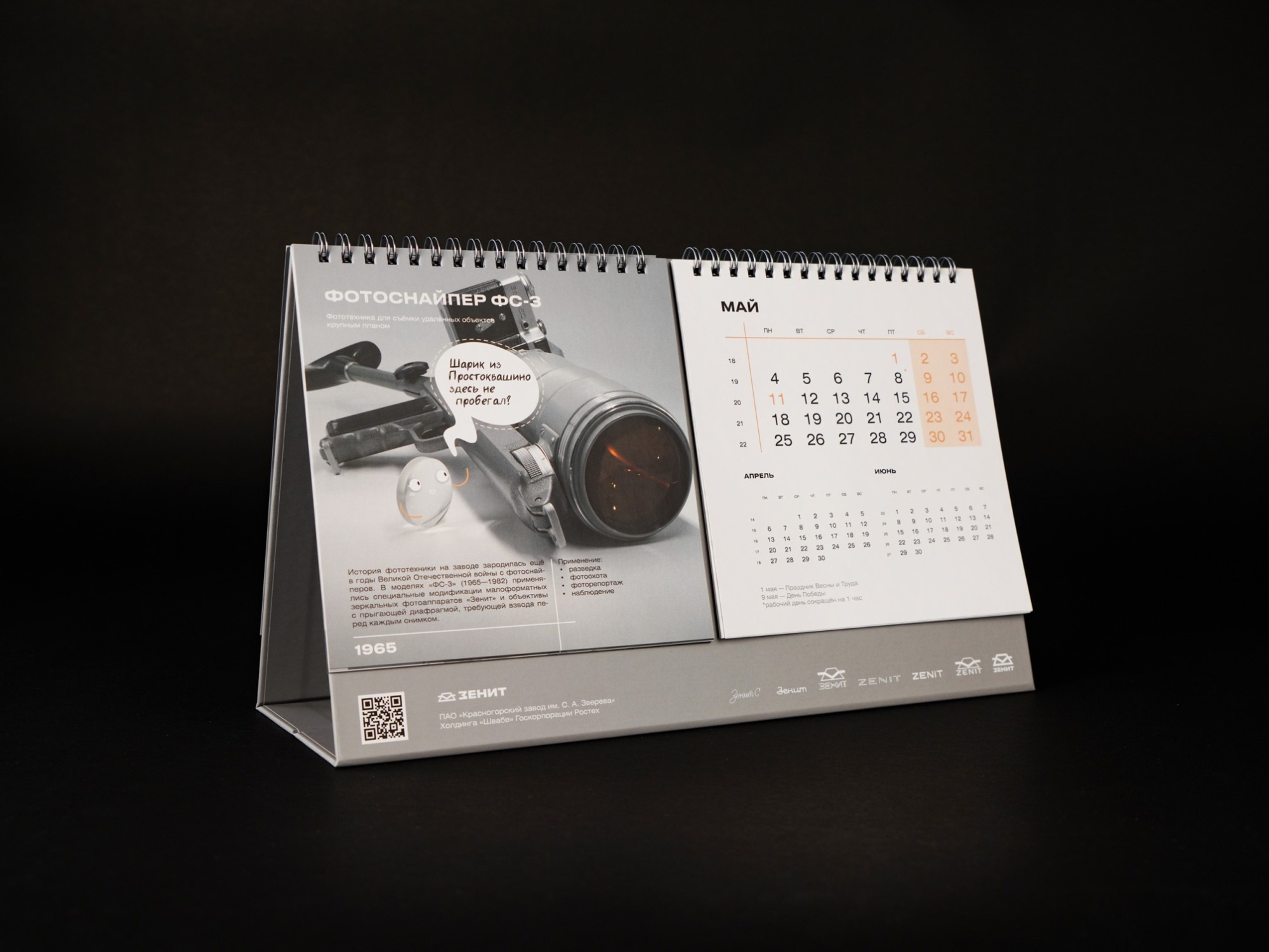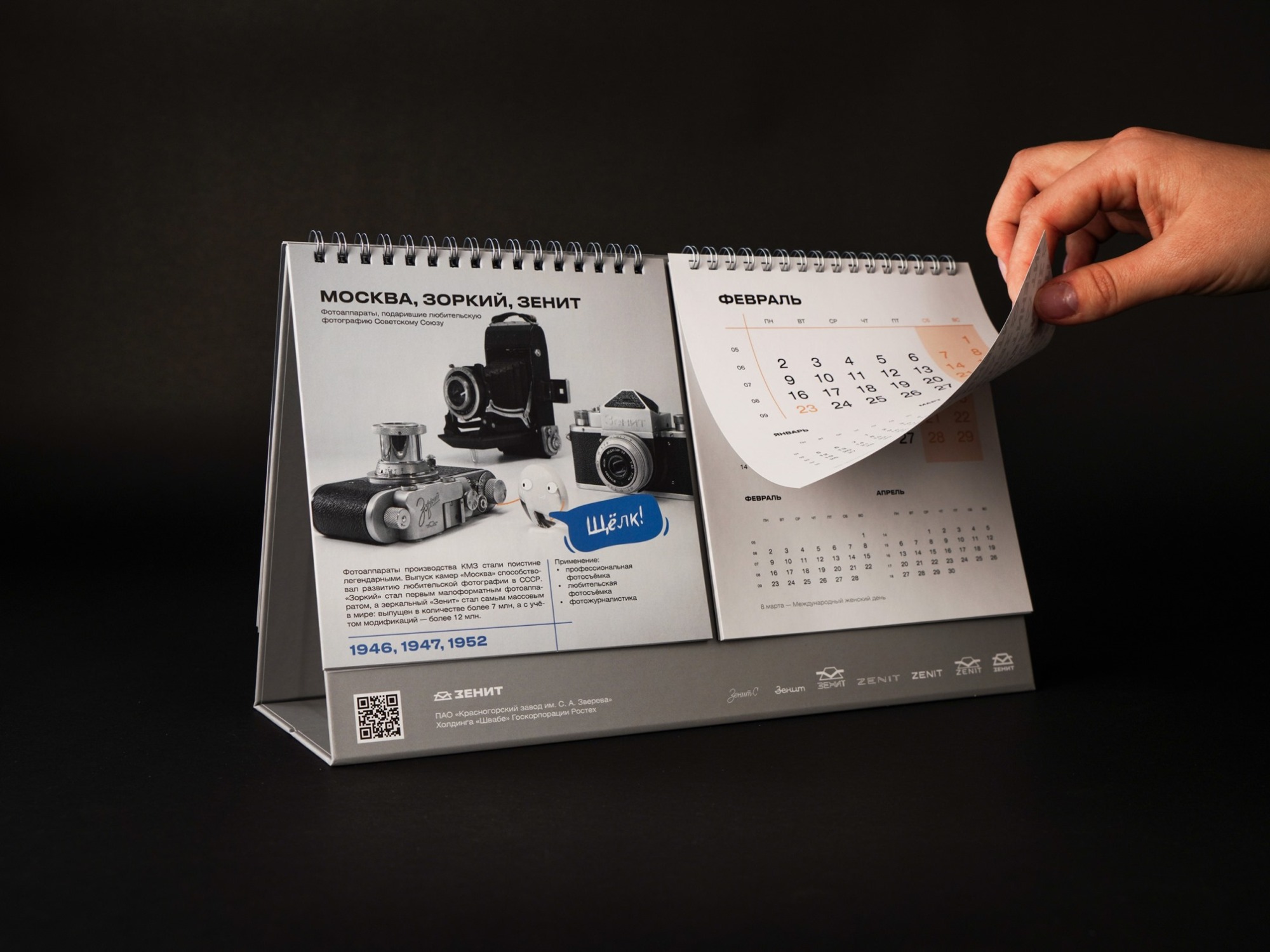 Макет календаря полностью изготовлен работниками отдела: от концепции до макета. Для его разработки были использованы архивные материалы и проведена профессиональная фотосъёмка экспонатов музея ПАО КМЗ вместе с главным персонажем – деталью Линзой.