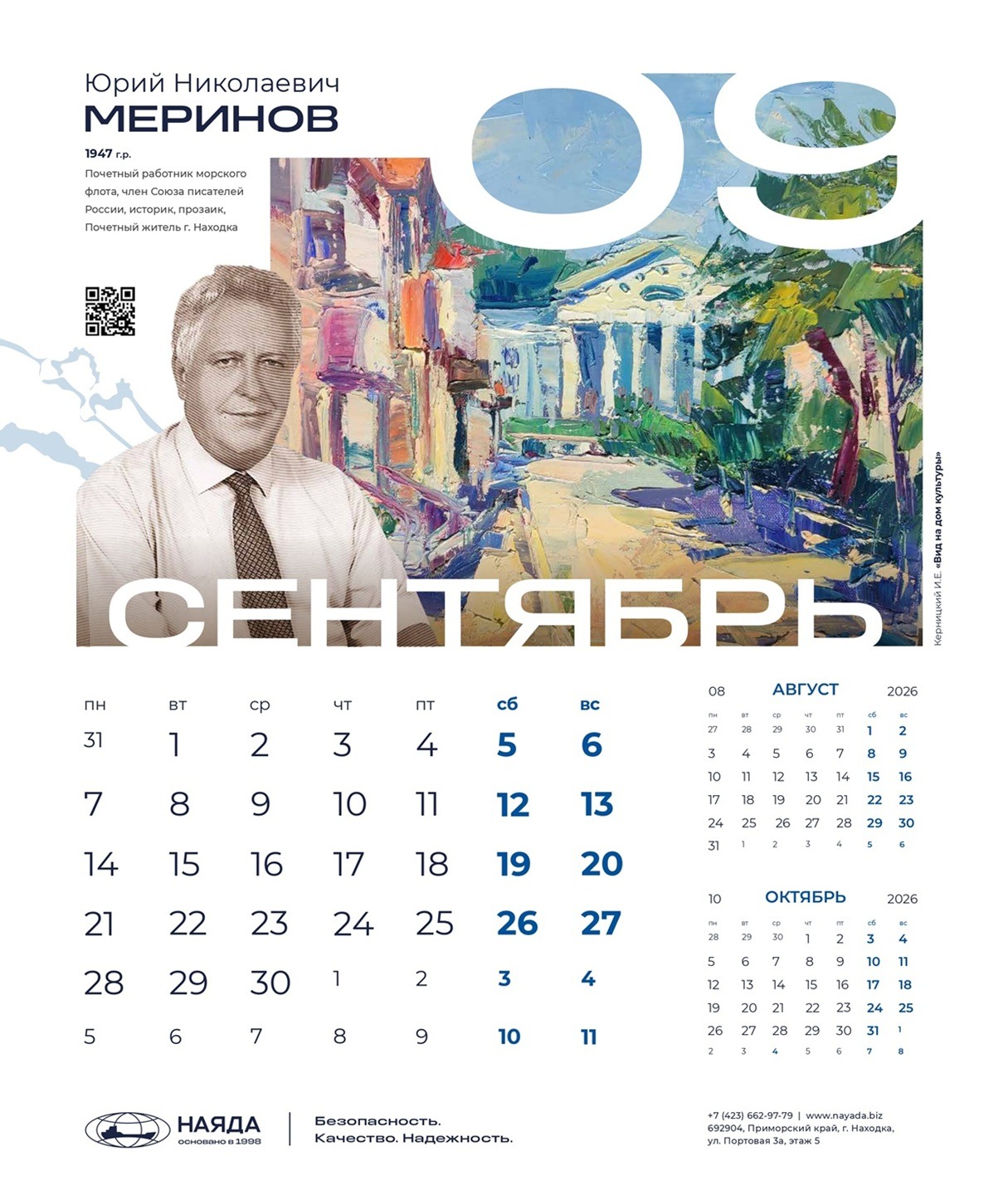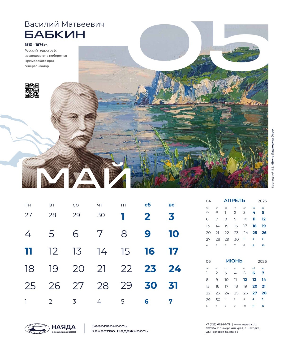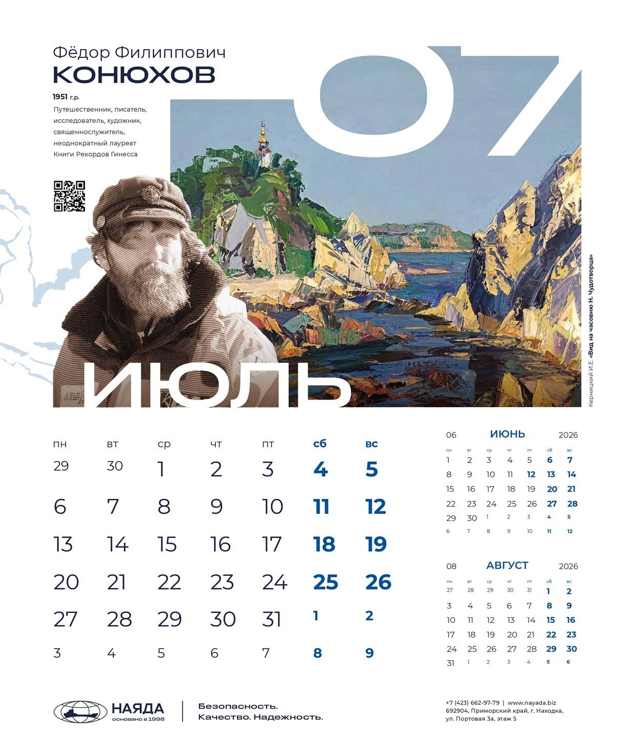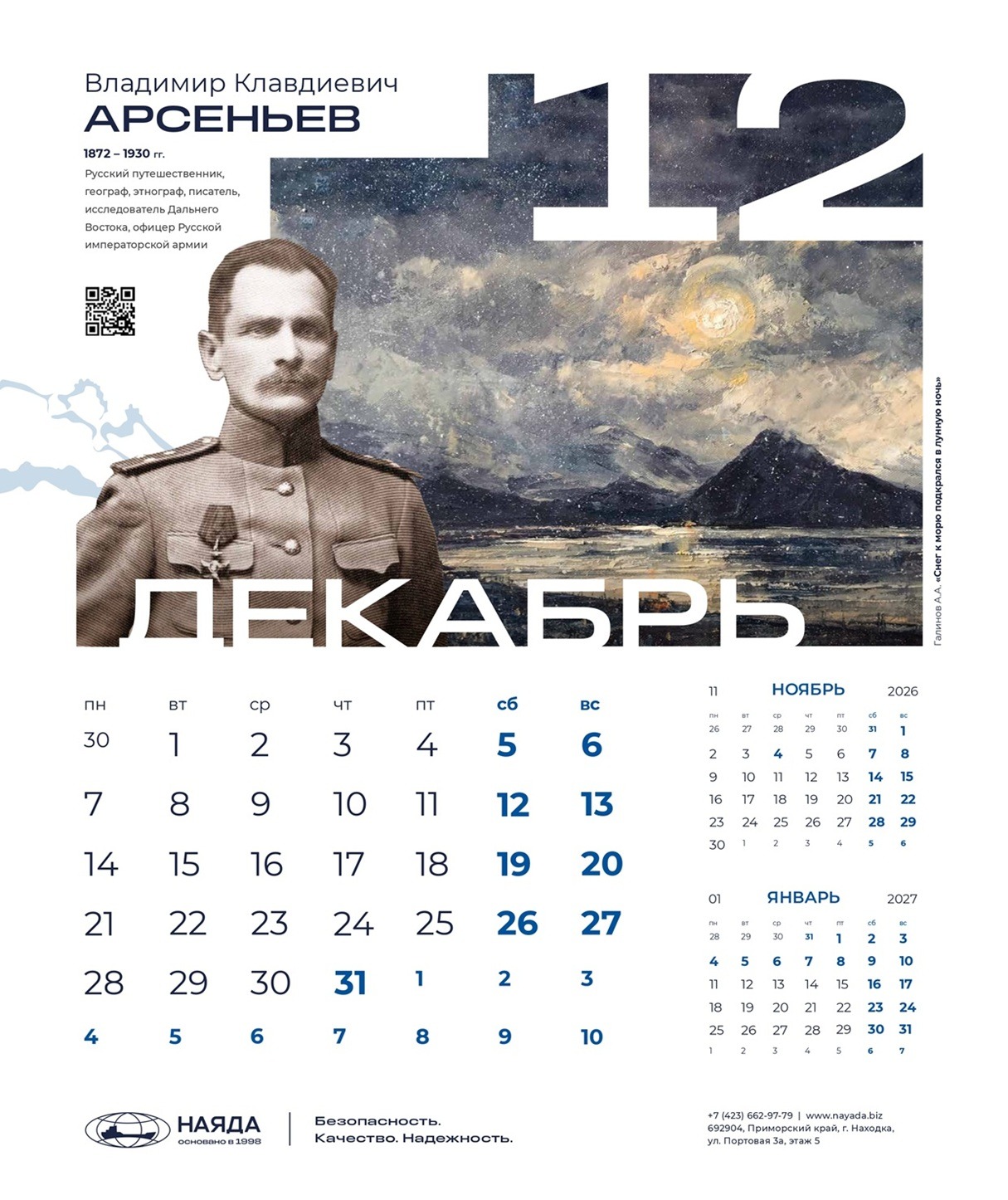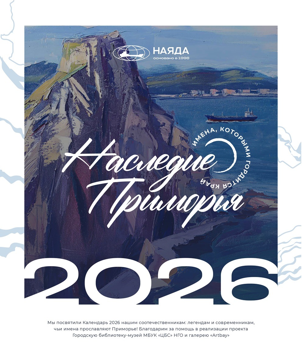 Корпоративный календарь ООО «Наяда», «Наследие Приморья» 2026 посвящен выдающимся личностям Приморья, легендам и современникам, прославившим его своими достижениями. Это уникальные деятели науки, искусства, культуры, краеведы, путешественники, первооткрыватели, чьи имена навечно вписаны в историю региона.