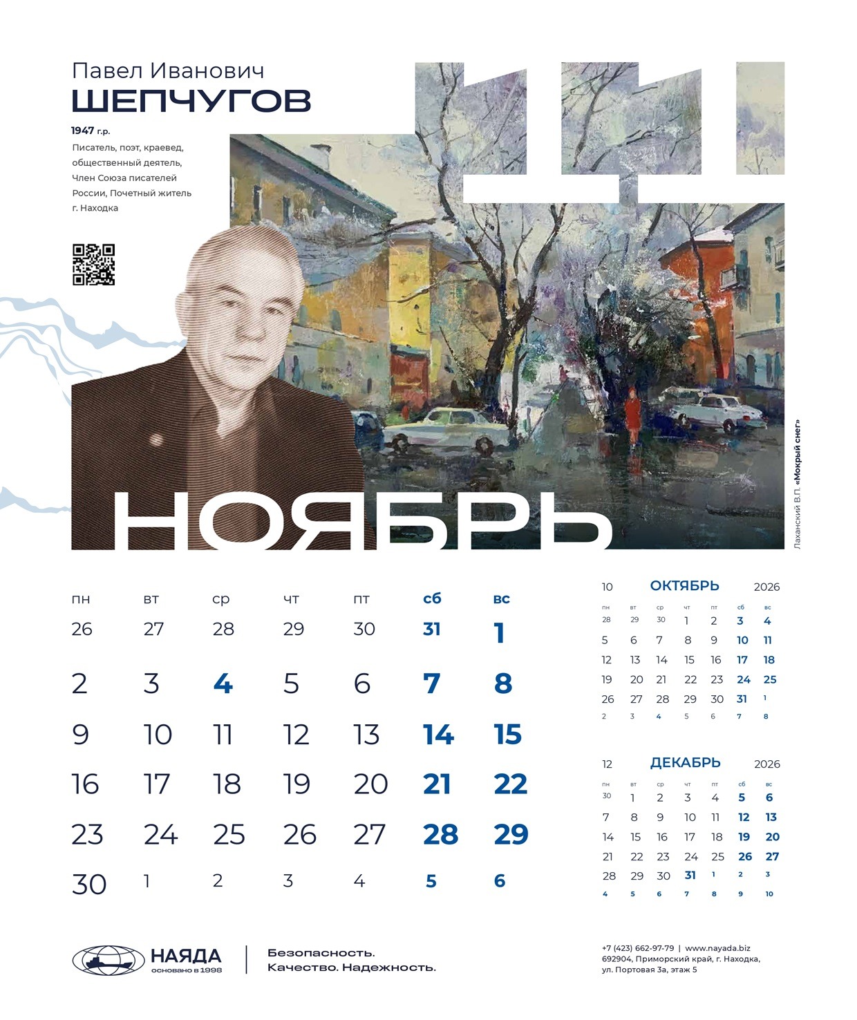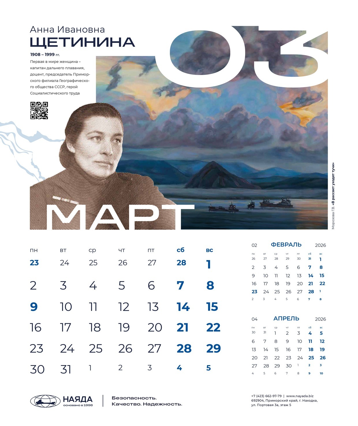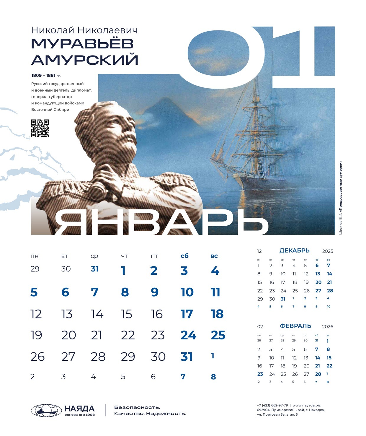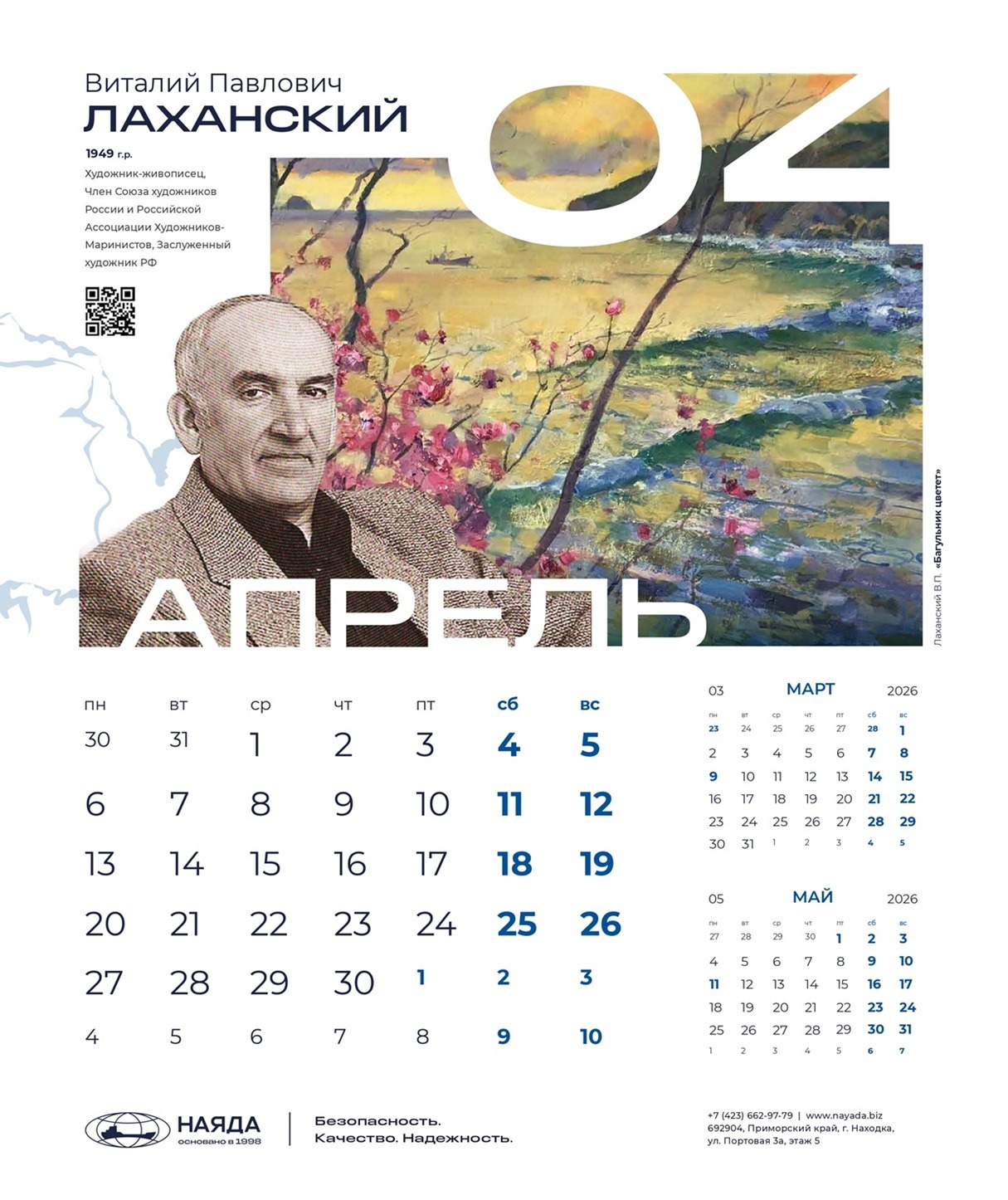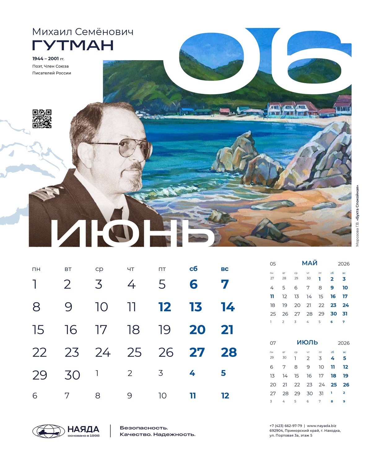 Корпоративный календарь ООО «Наяда», «Наследие Приморья» 2026 посвящен выдающимся личностям Приморья, легендам и современникам, прославившим его своими достижениями. Это уникальные деятели науки, искусства, культуры, краеведы, путешественники, первооткрыватели, чьи имена навечно вписаны в историю региона.