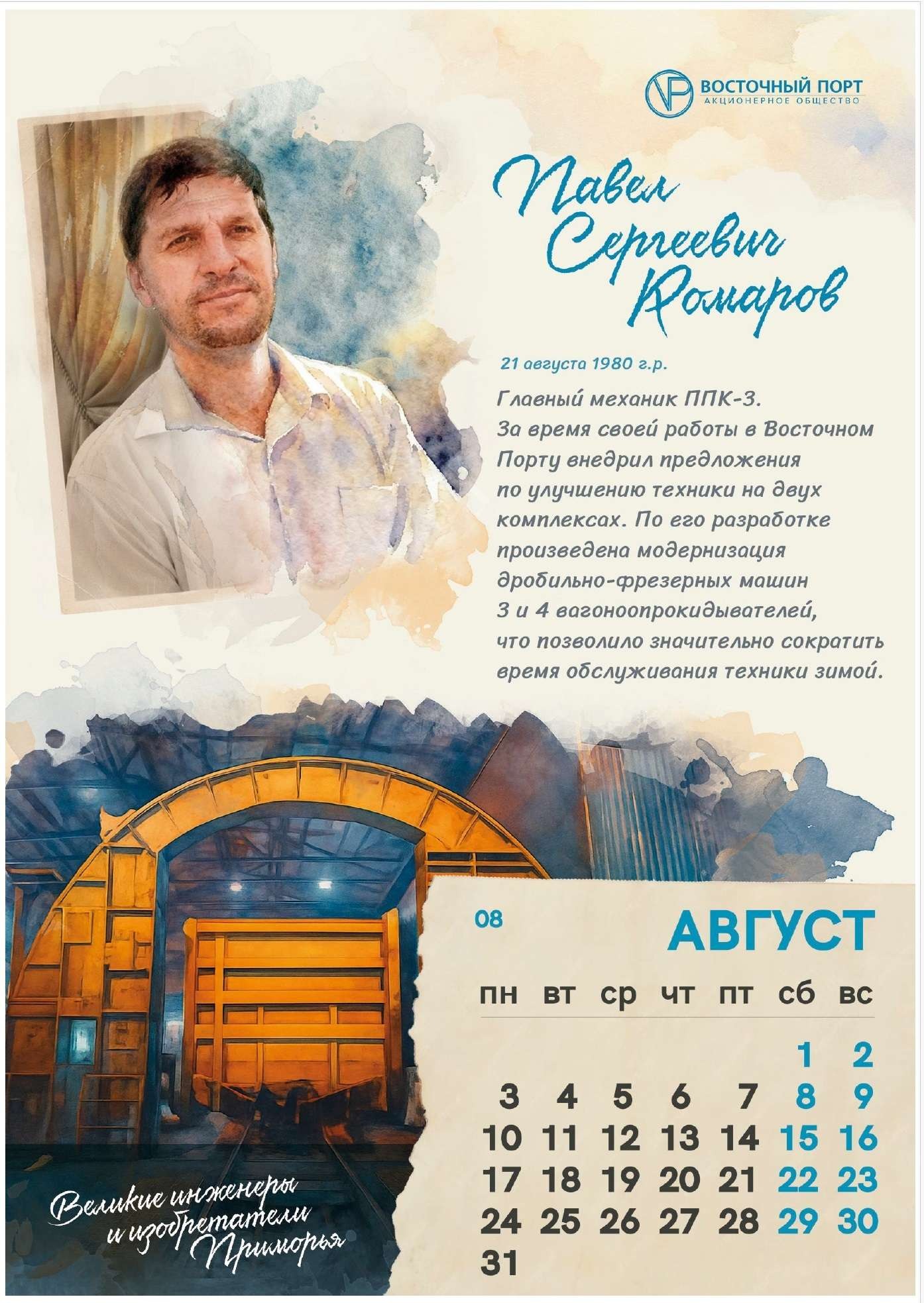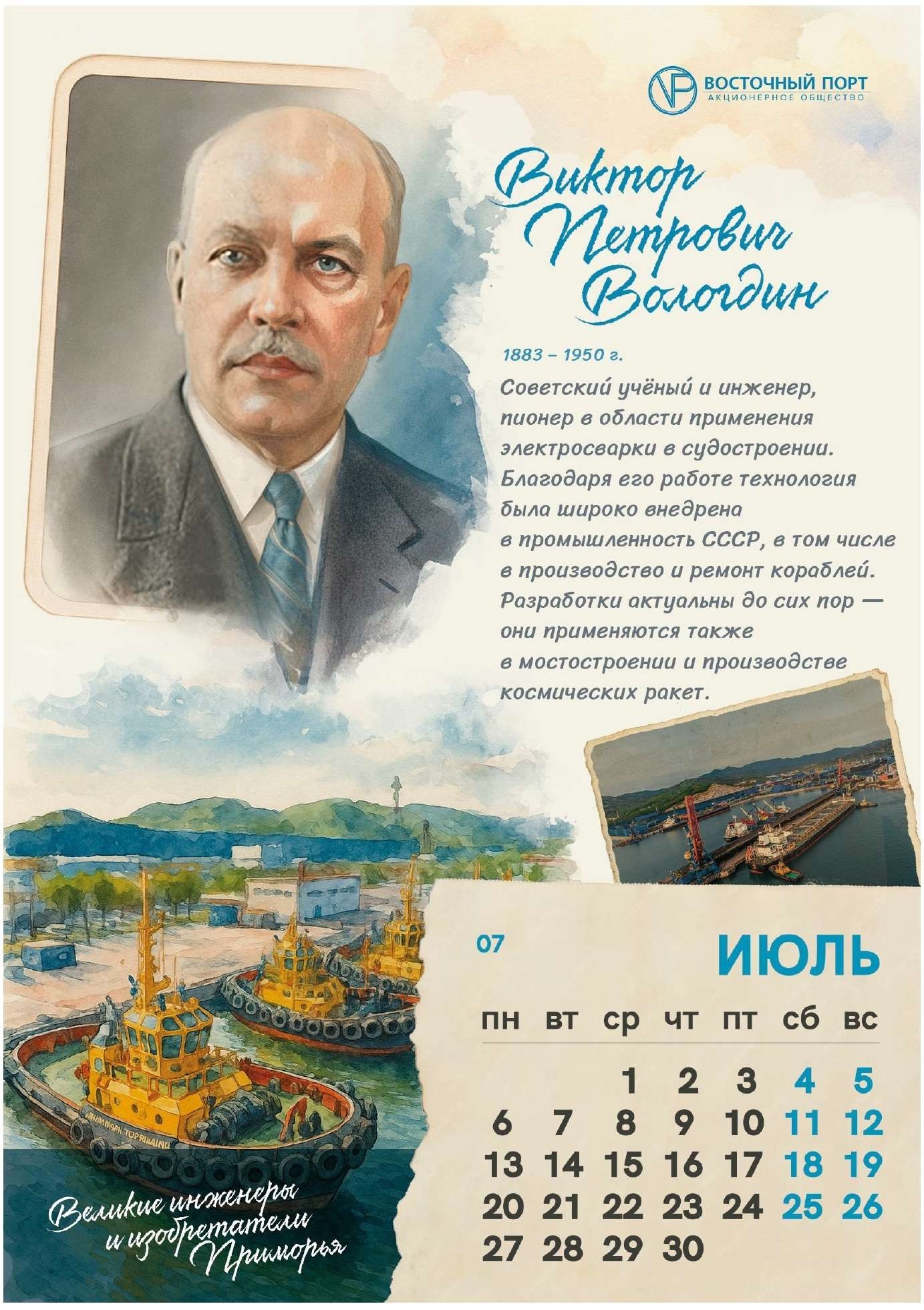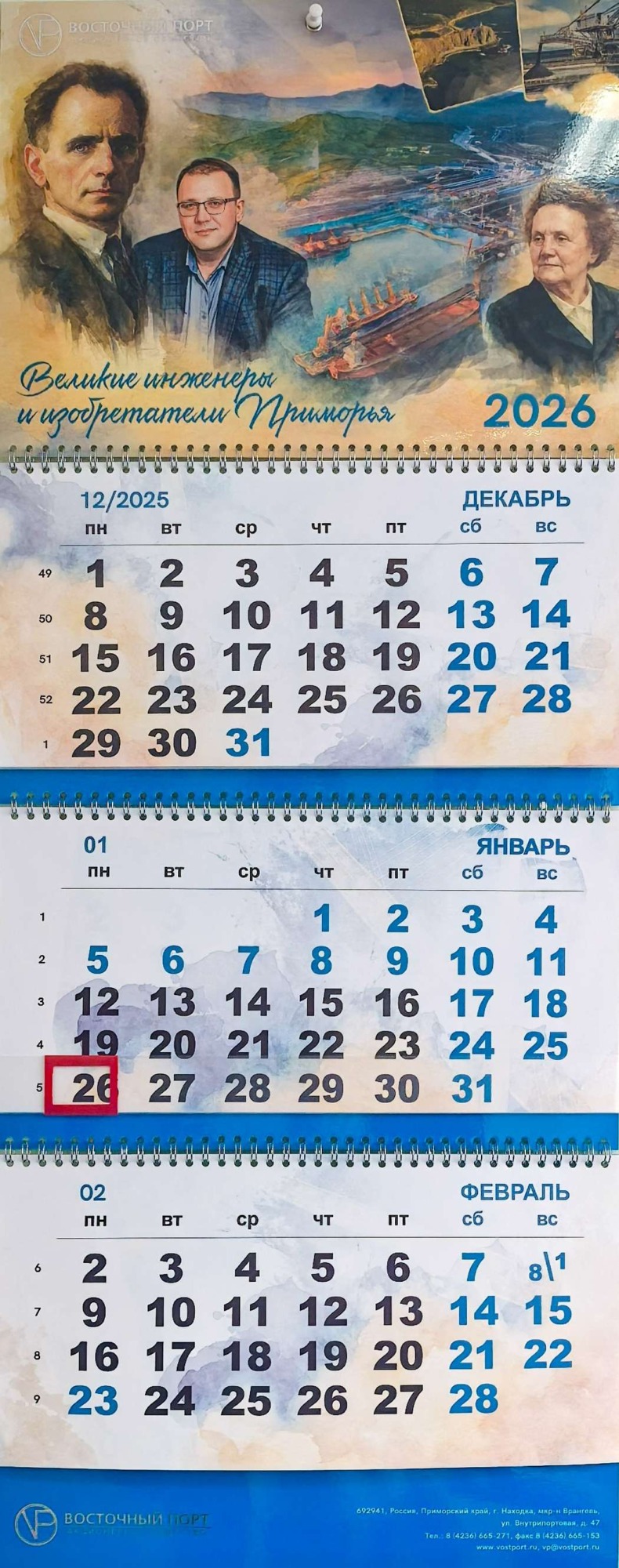 2026 год объявлен в стране Годом единства народов России. А еще он богат на памятные и юбилейные даты, среди которых немало важных вех в истории науки и инженерии. И «Восточный Порт» решил объединить эти направления и посвятить календарь людям, которые внесли значительный вклад в изучение, развитие и единение Приморского края. В этом году страницы украсили портреты великих инженеров и изобретателей региона, фамилии которых известны всей России. А компанию им составили наши «портовики»-новаторы, благодаря разработкам которых предприятие продолжает развиваться и идти в ногу со временем. Исследователь Владимир Арсеньев, ученый Виктор Вологдин, капитан плавучего крана Иван Корыстылев, академик Михаил Агеев и главный инженер Порта Вячеслав Кайсин.
