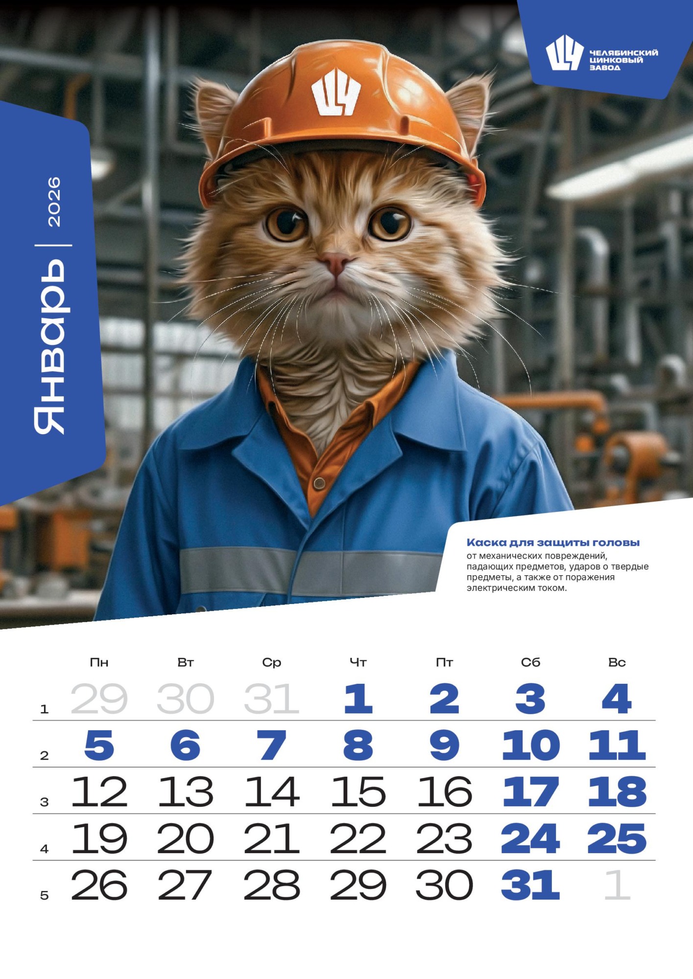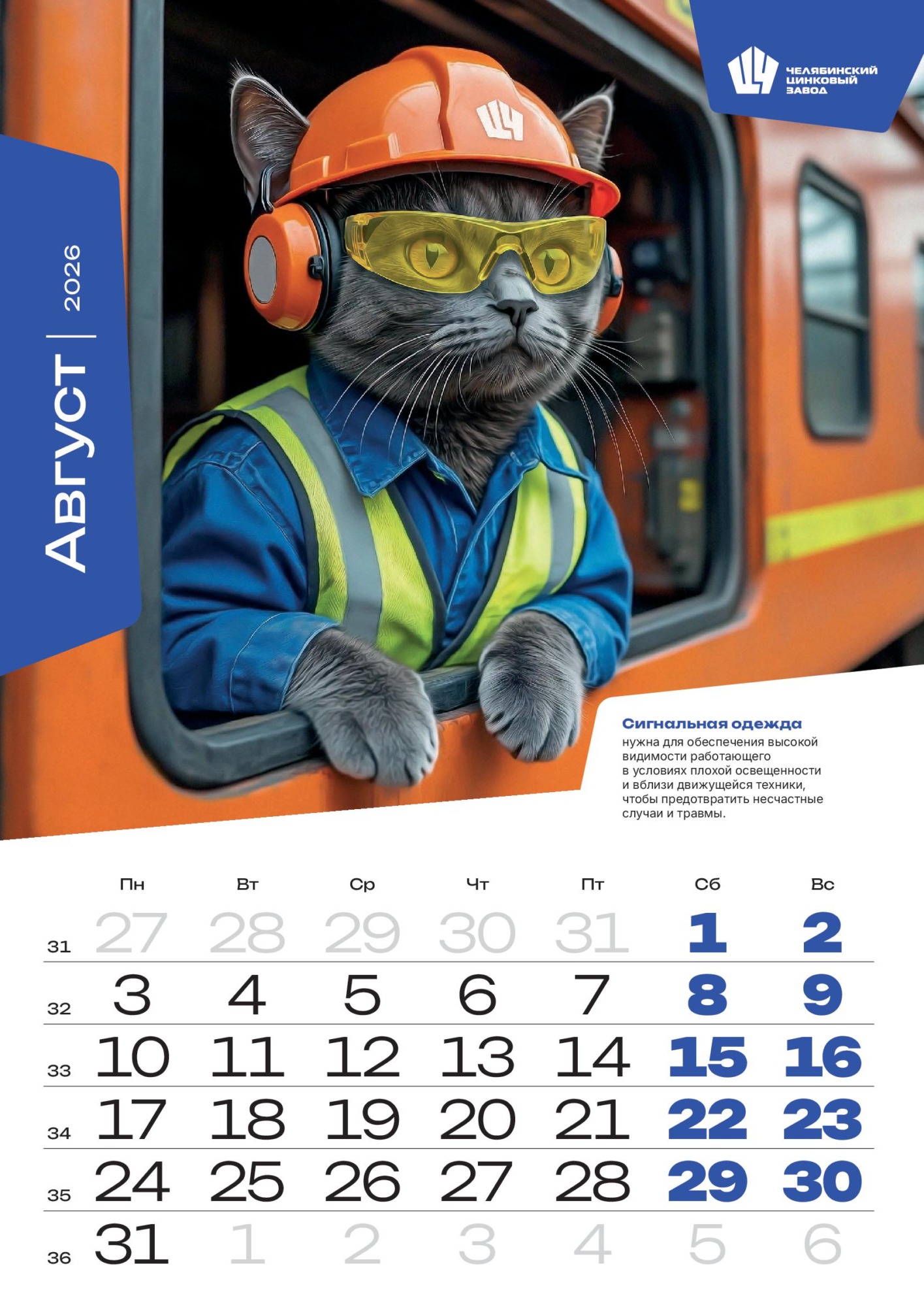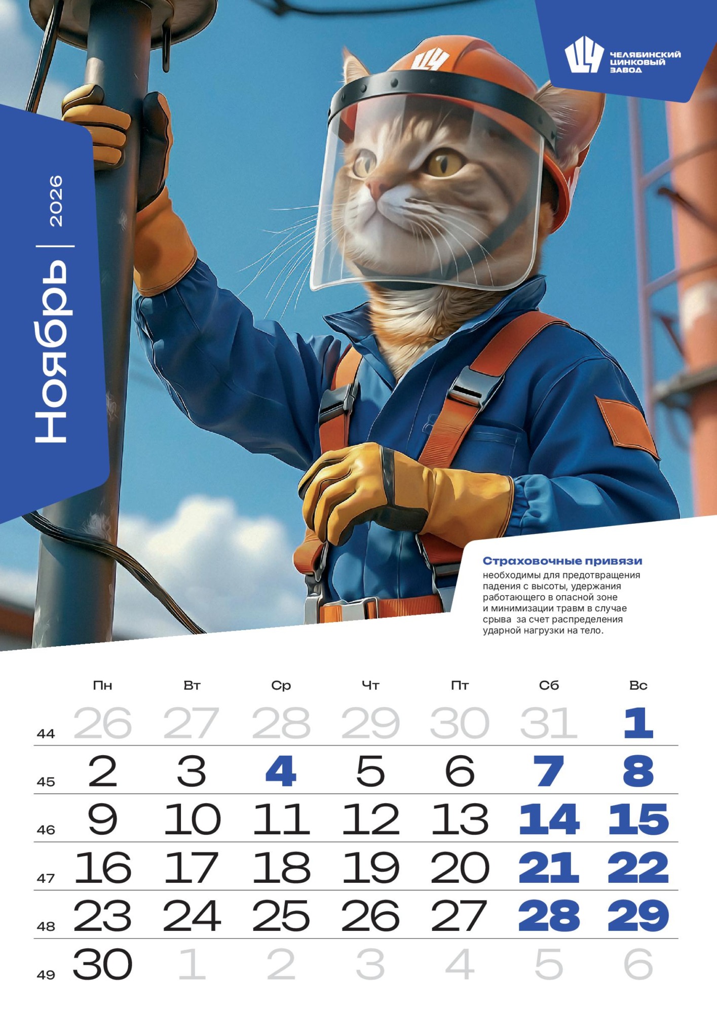 Это не просто календарь, а ежедневное напоминание о ценности человеческой жизни через призму юмора и милых образов. На каждой странице – харизматичный кот, экипированный по всем правилам: от каски и защитных очков до спецобуви и страховочной привязи.