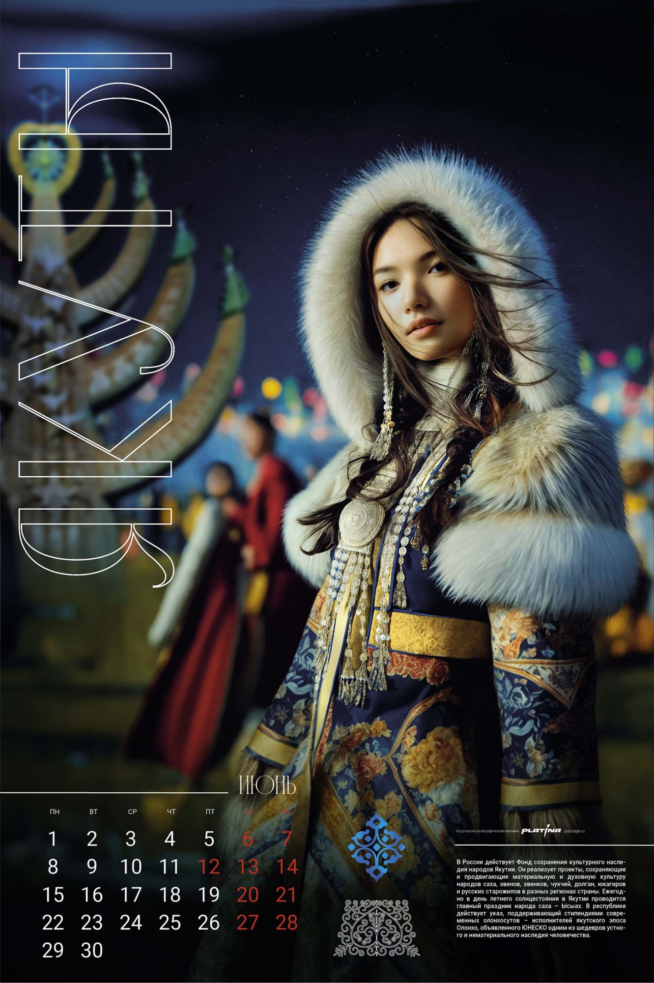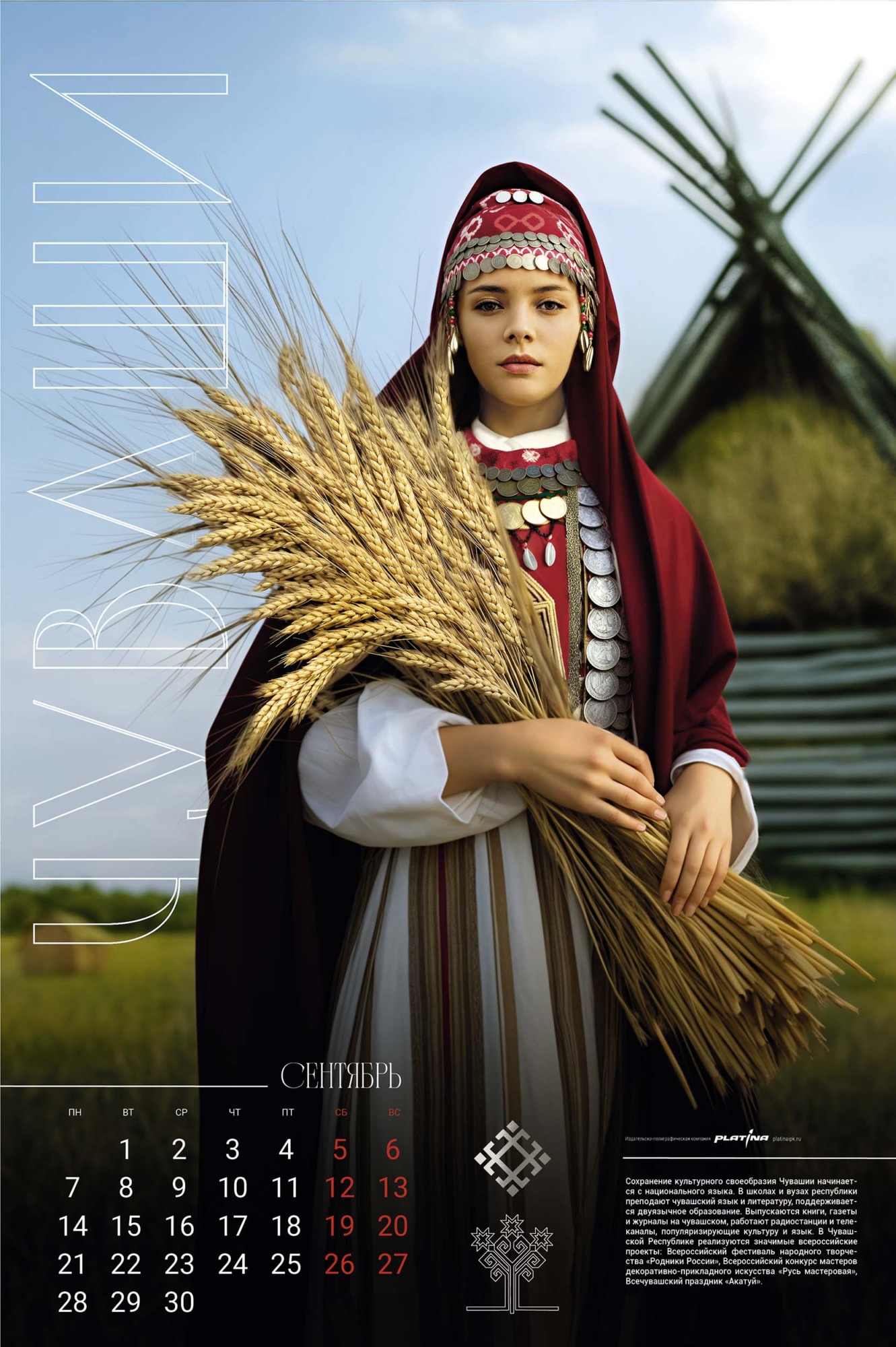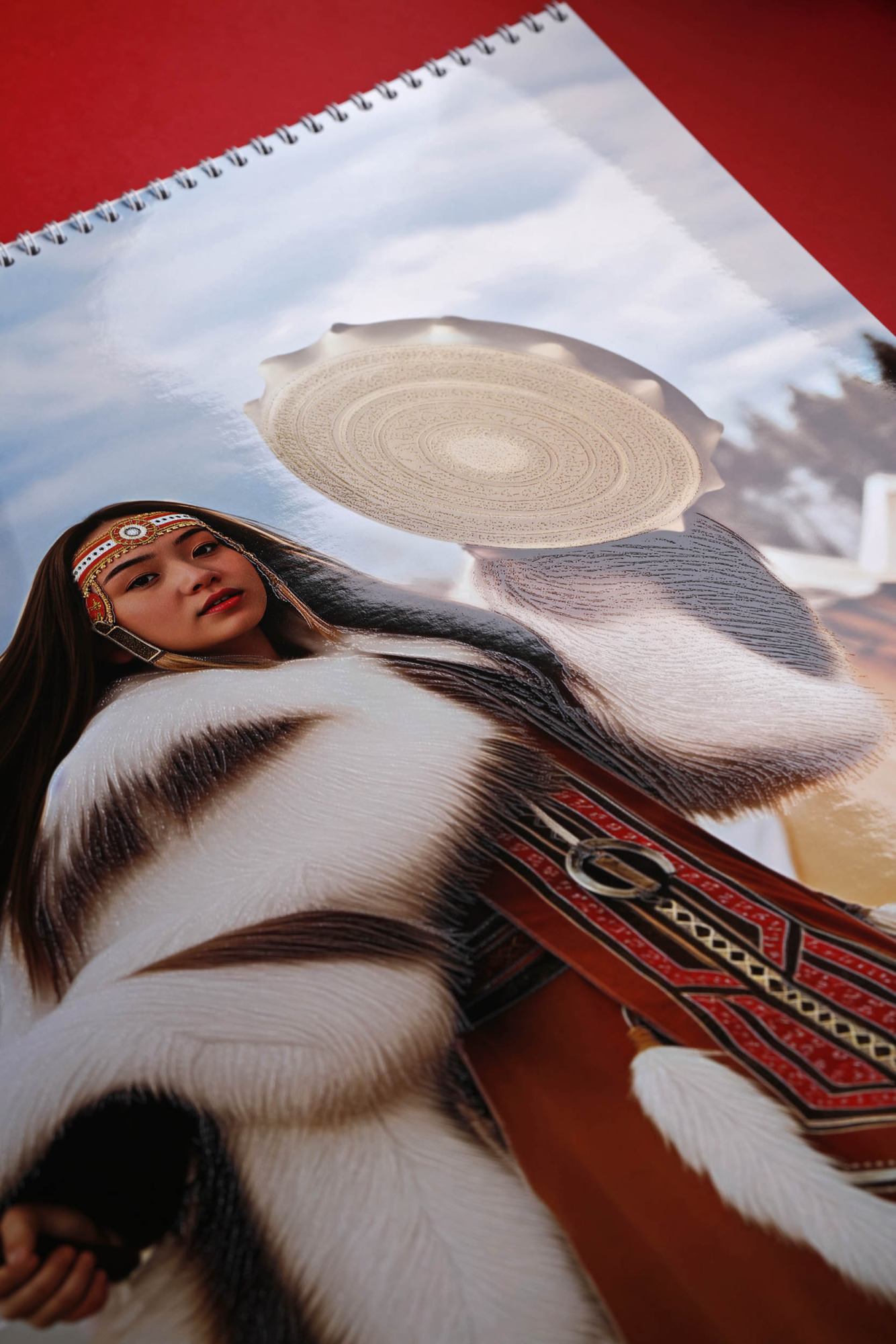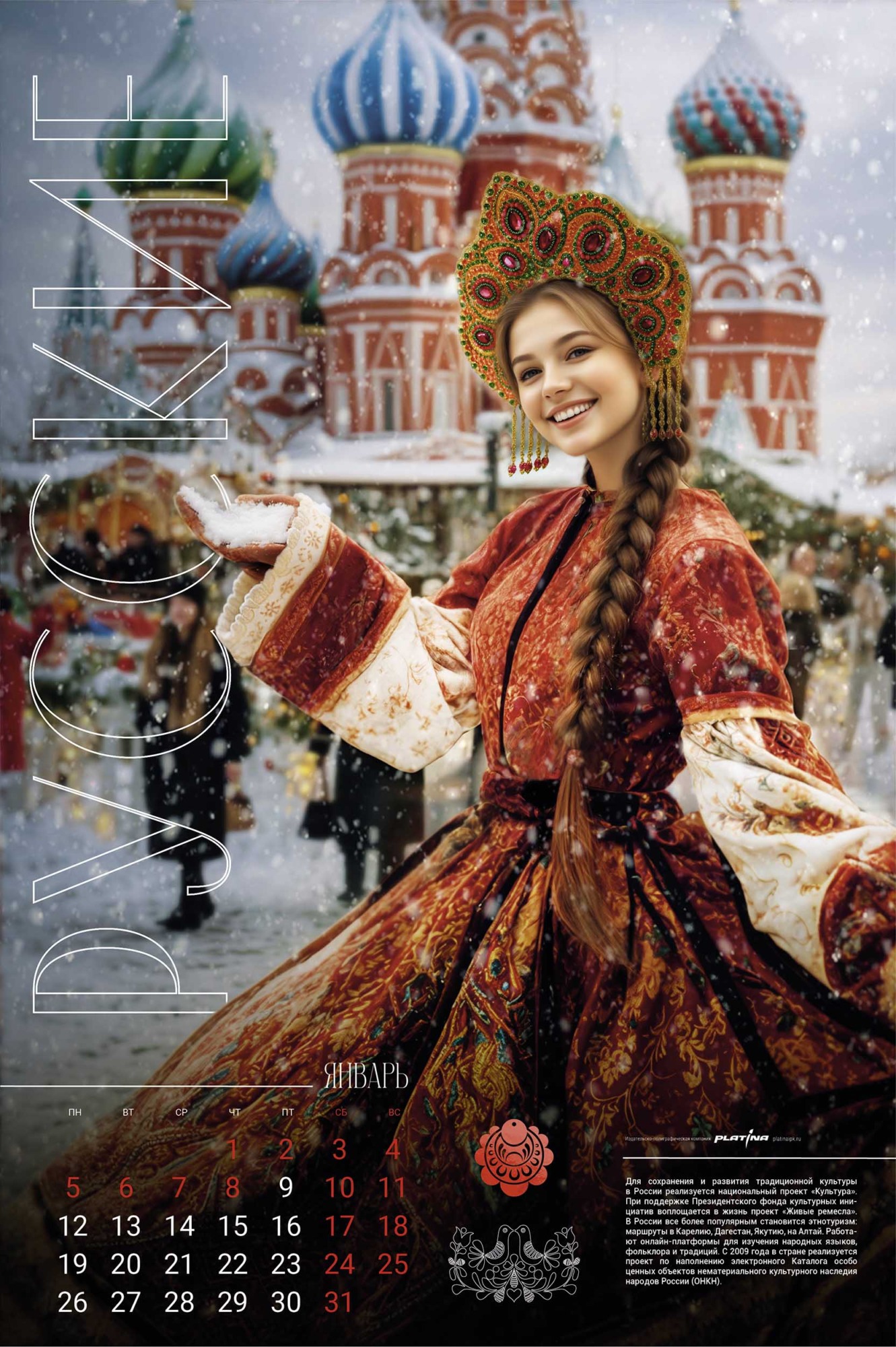 Каждый месяц календаря знакомит нас с представительницей одного из народов страны. При создании проекта была проведена большая работа по поиску аутентичных костюмов и составлению образов, раскрывающих национальные особенности. Иллюстрации были сгенерированы с использованием искусственного интеллекта, после чего прошли этап тщательной художественной пост-обработки и доработки дизайнером для достижения большей выразительности и достоверности.