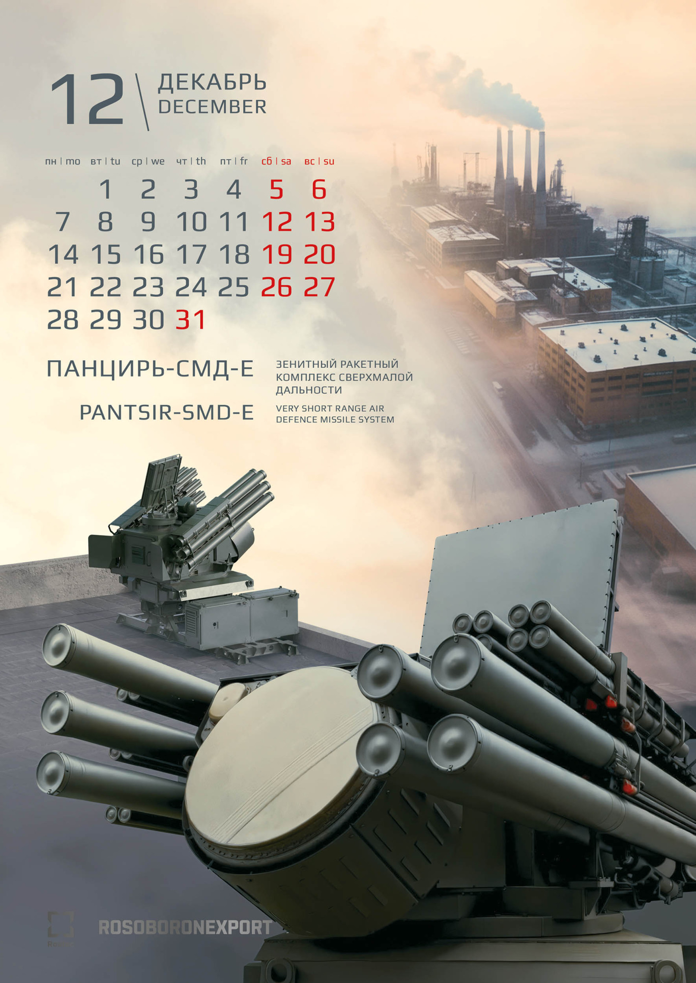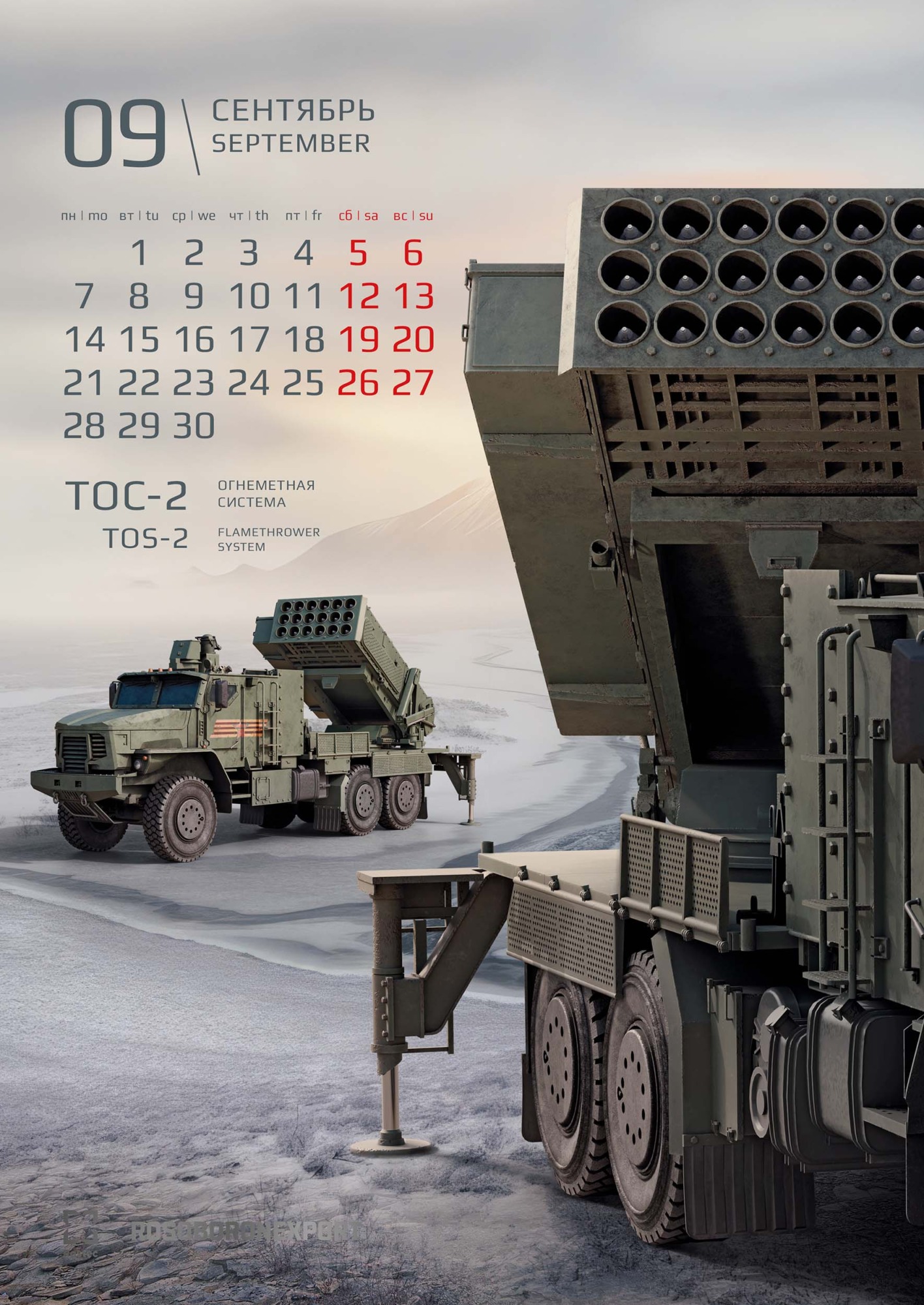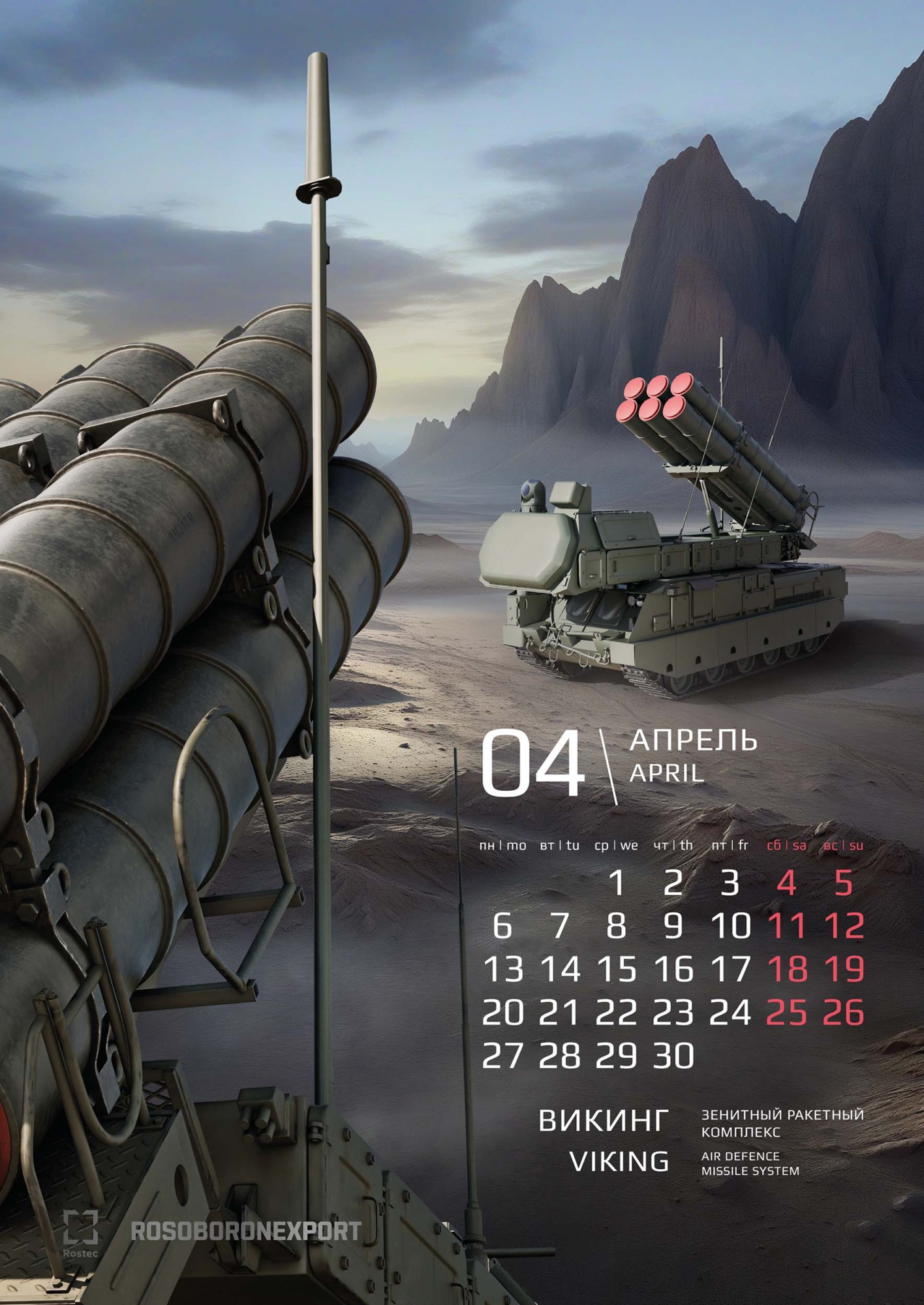 Визуальная концепция календаря построена на композиционном приеме – сложно выстроенном объединении переднего и дальнего планов. Реализация этой идеи стала возможной благодаря масштабной подготовительной работе – специально для календаря были созданы высокодетализированные 3D-макеты техники. Благодаря этому решению нам удалось добиться впечатляющего эффекта трехмерности и глубины изображения. Зритель буквально погружается в пространство кадра, ощущая реальный масштаб и физическую мощь боевых машин. Сдержанная, но насыщенная цветовая гамма подчеркивает эстетику современных технологий и строгость военного дела. «Вау-эффект» от календаря создается разнообразием полиграфических отделок на обложке. В ее дизайне использованы сразу три вида лака: глянцевый, объемный и абразивный, а также два вида тиснения: серебряное и голографическое.