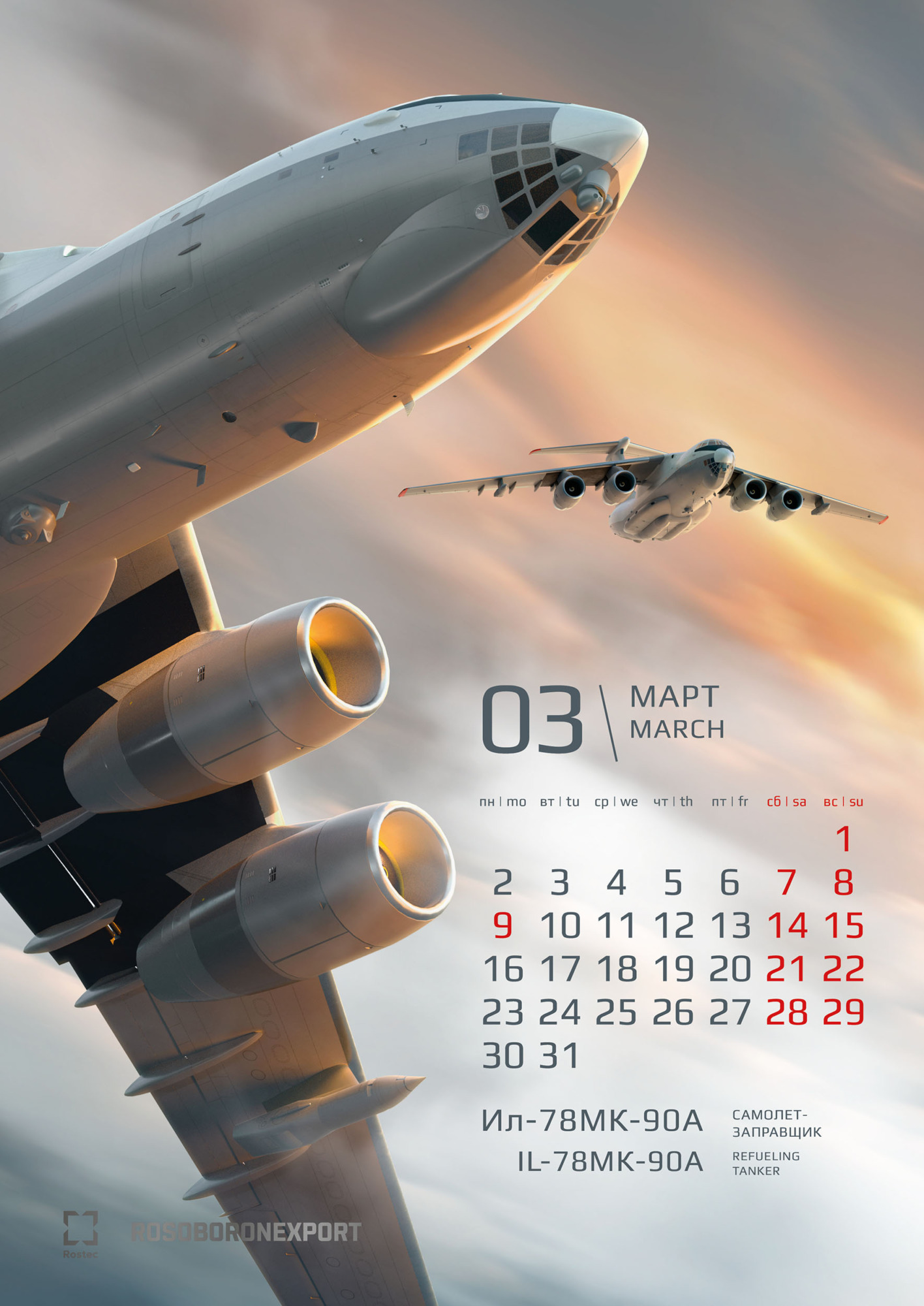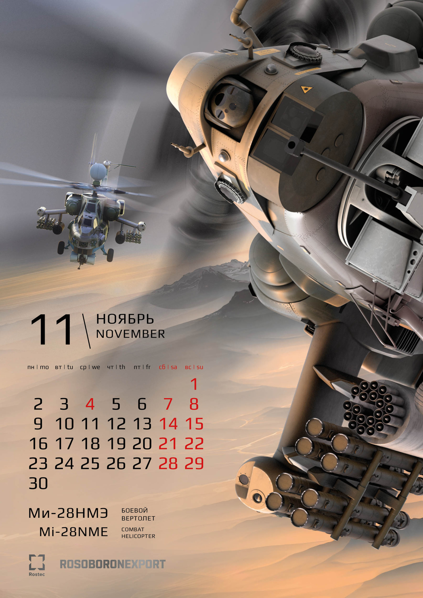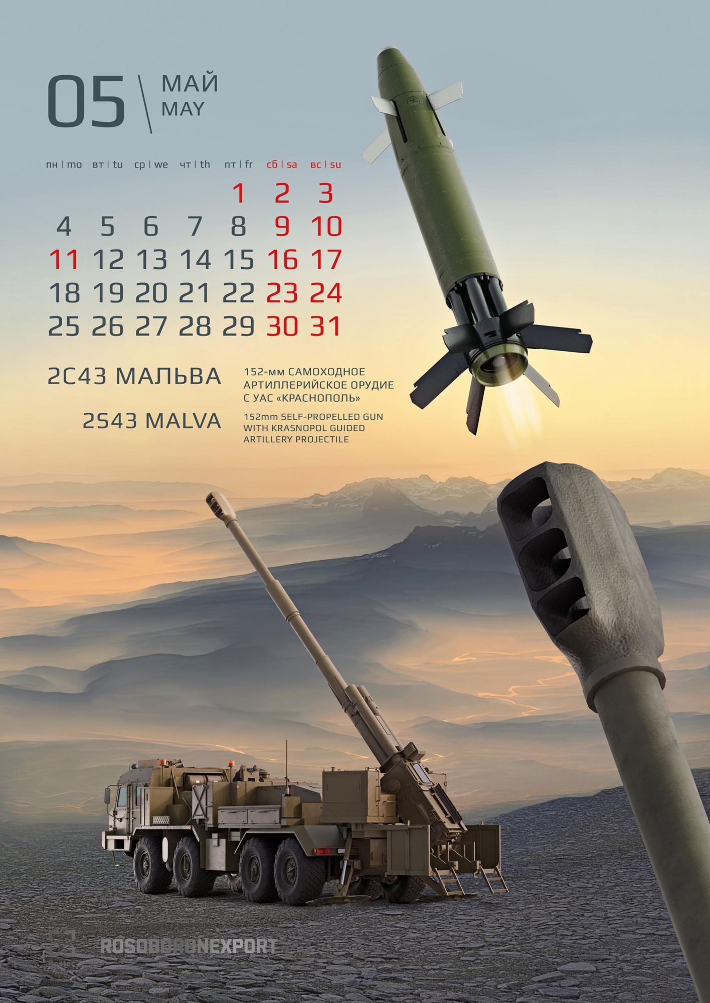Визуальная концепция календаря построена на композиционном приеме – сложно выстроенном объединении переднего и дальнего планов. Реализация этой идеи стала возможной благодаря масштабной подготовительной работе – специально для календаря были созданы высокодетализированные 3D-макеты техники. Благодаря этому решению нам удалось добиться впечатляющего эффекта трехмерности и глубины изображения. Зритель буквально погружается в пространство кадра, ощущая реальный масштаб и физическую мощь боевых машин. Сдержанная, но насыщенная цветовая гамма подчеркивает эстетику современных технологий и строгость военного дела. «Вау-эффект» от календаря создается разнообразием полиграфических отделок на обложке. В ее дизайне использованы сразу три вида лака: глянцевый, объемный и абразивный, а также два вида тиснения: серебряное и голографическое.