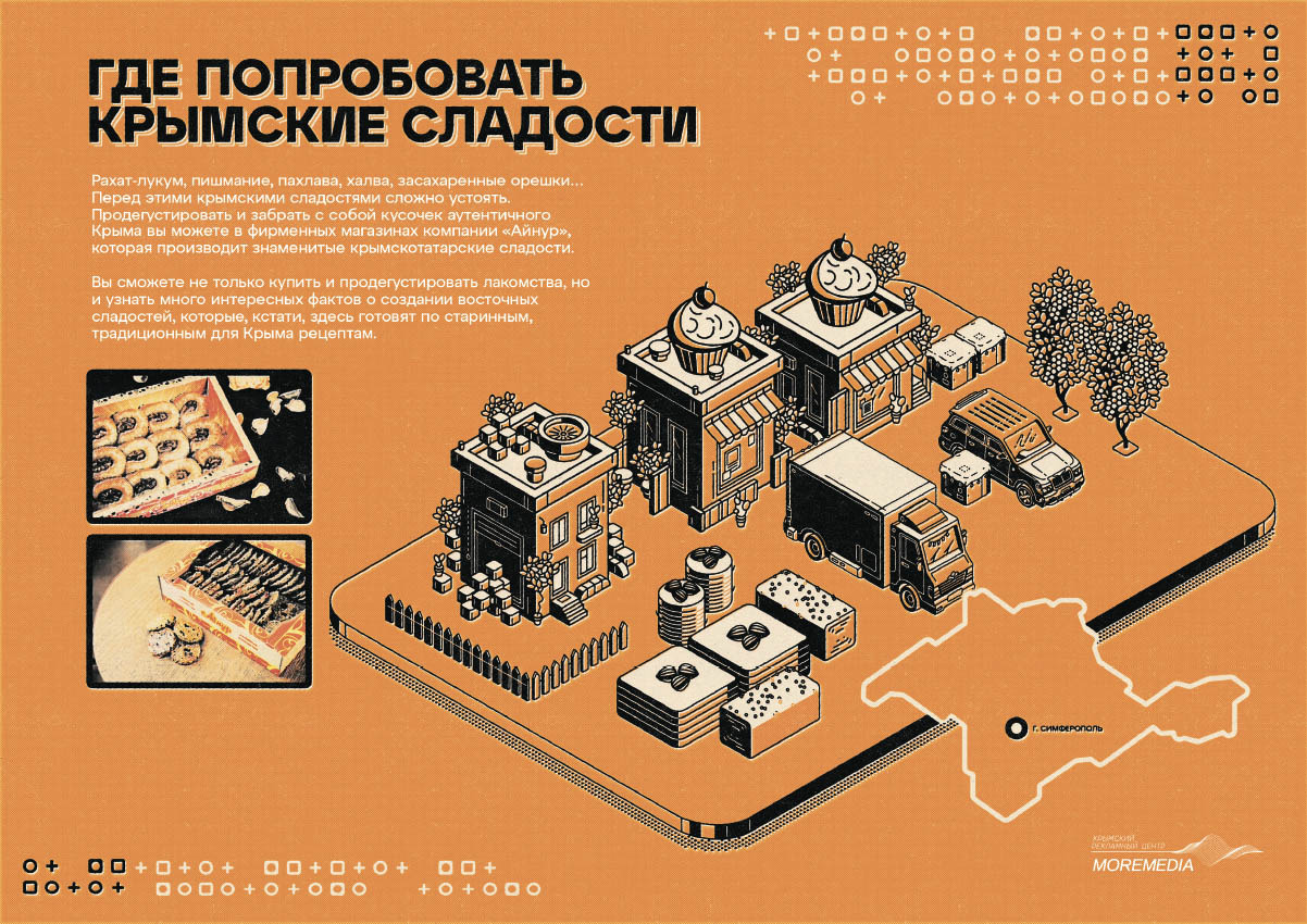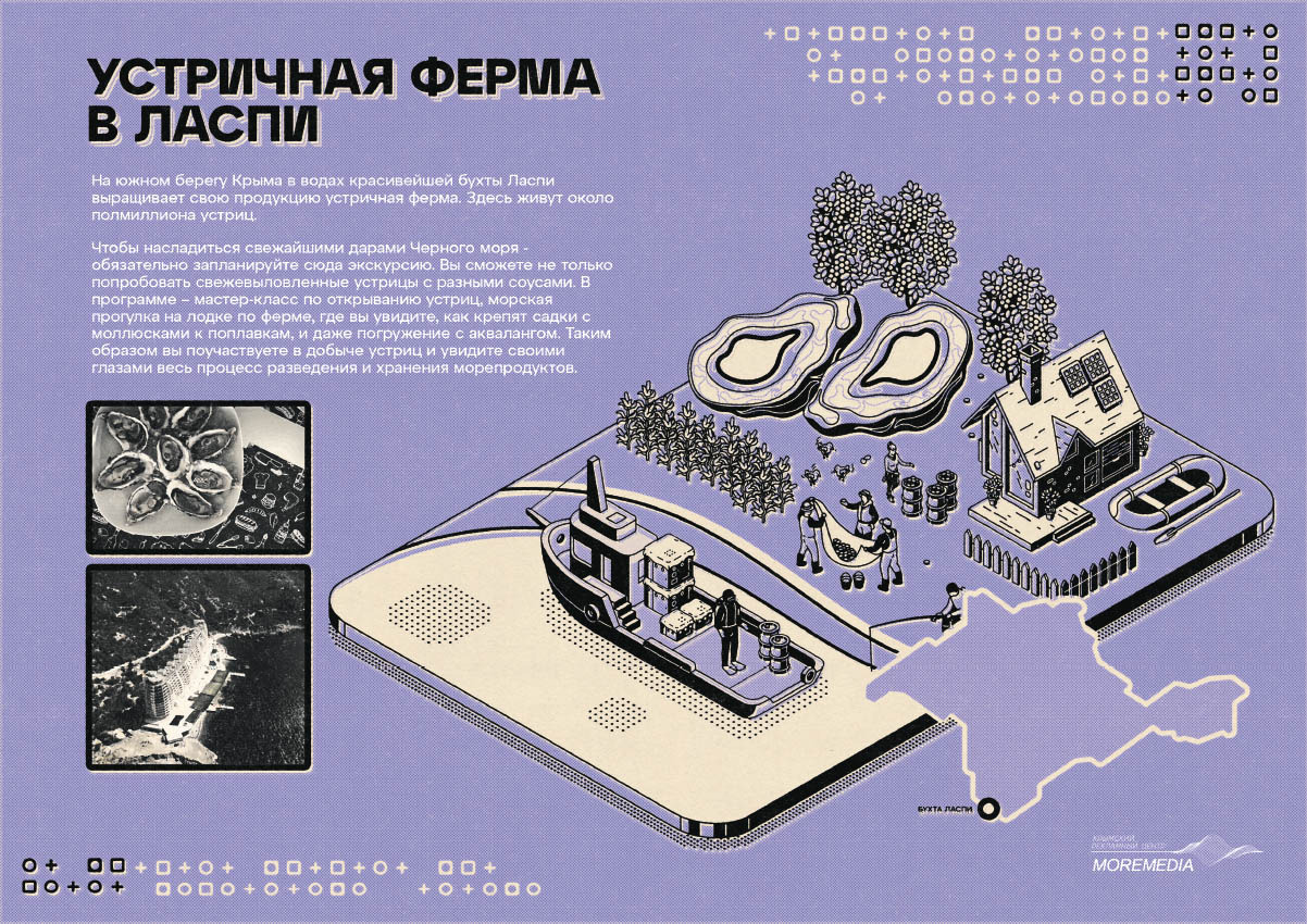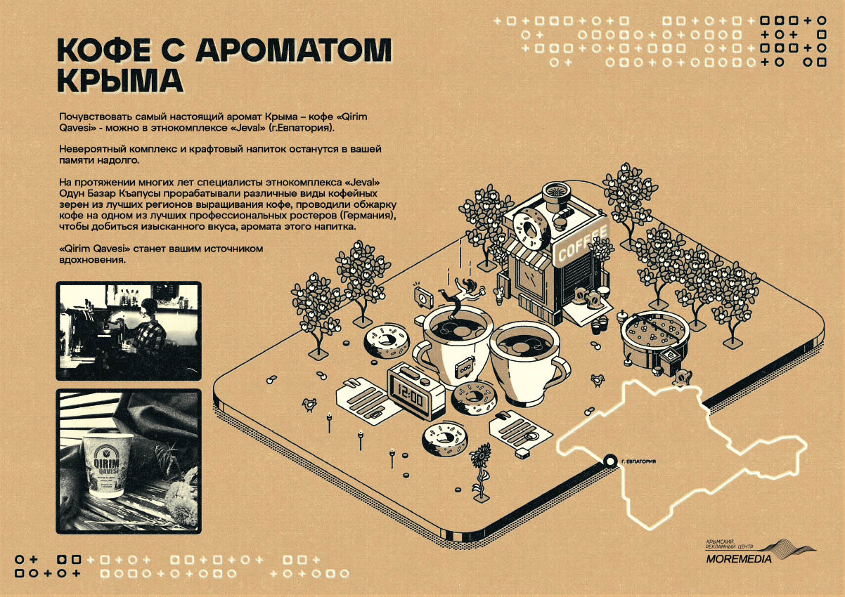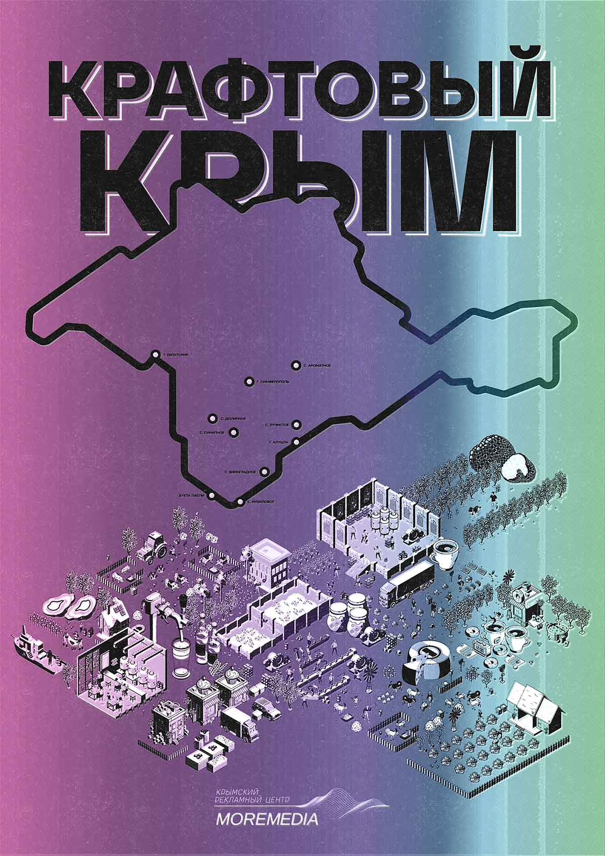 Работа над проектом включала отбор локаций, разработку единого визуального стиля и создание авторских иллюстраций. В результате получился яркий, наглядный гид по крафтовому Крыму.