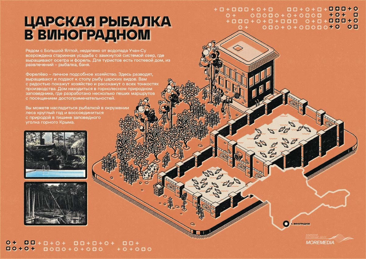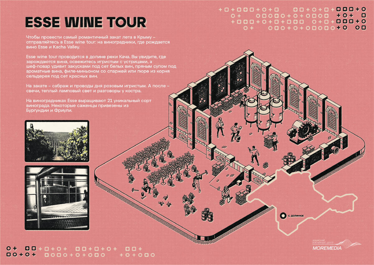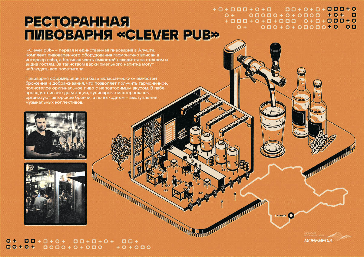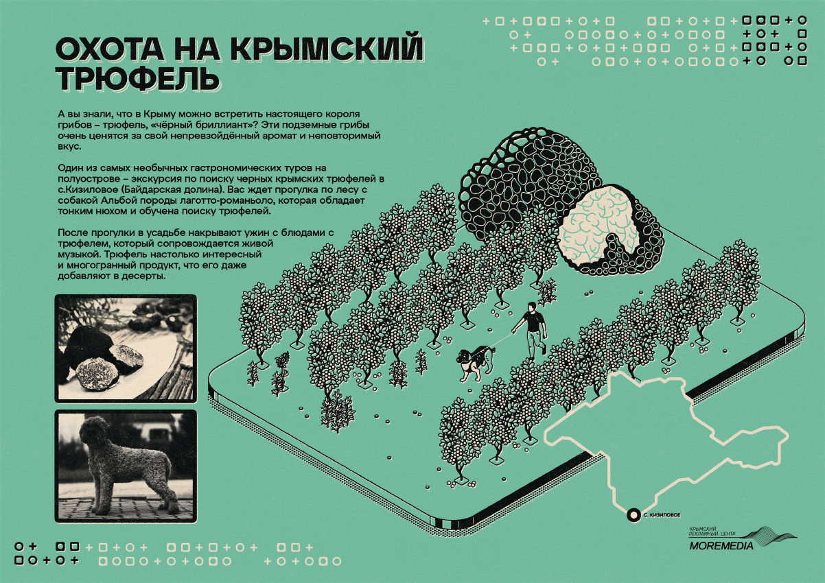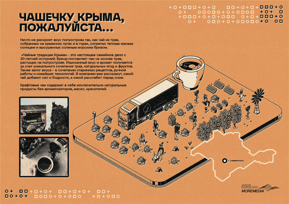 Работа над проектом включала отбор локаций, разработку единого визуального стиля и создание авторских иллюстраций. В результате получился яркий, наглядный гид по крафтовому Крыму.