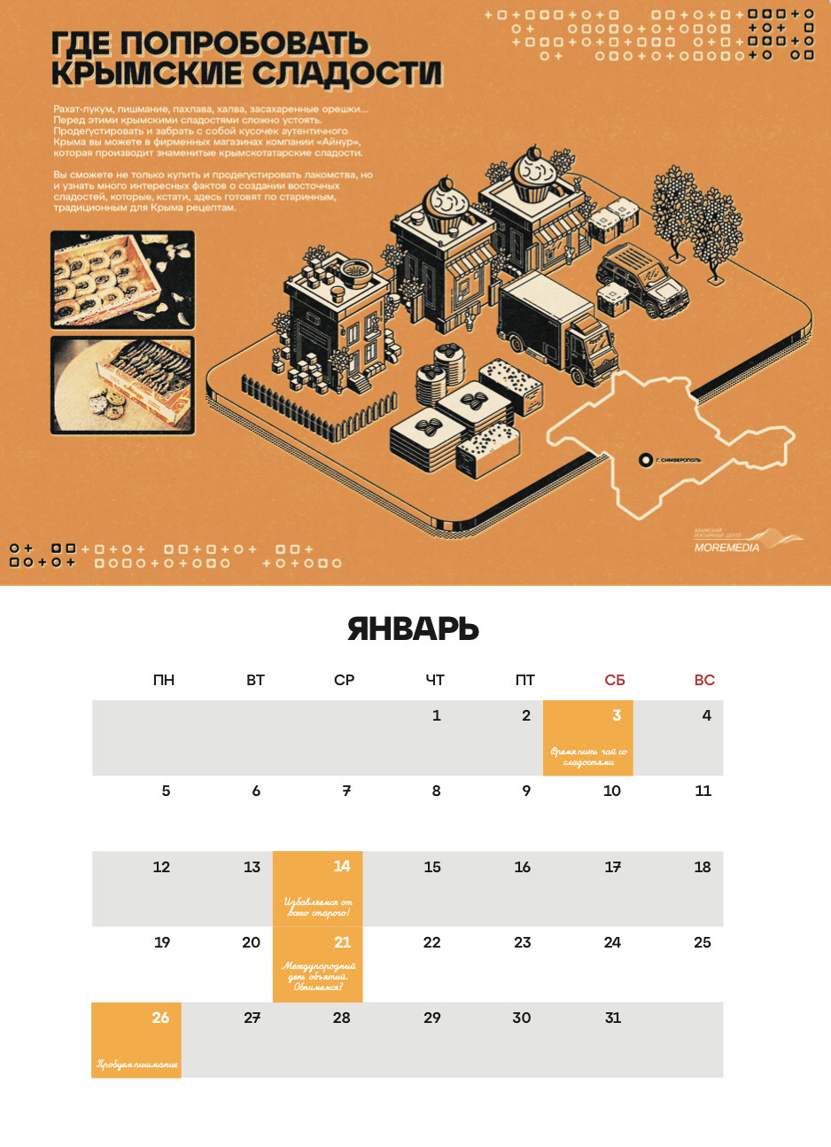 Календарь «Крафтовый Крым» создан для продвижения полуострова через локальные бренды и впечатления. Задача – показать Крым живым и «вкусным»: через людей, места и малые производства.