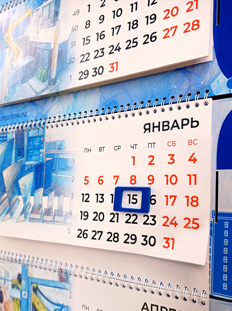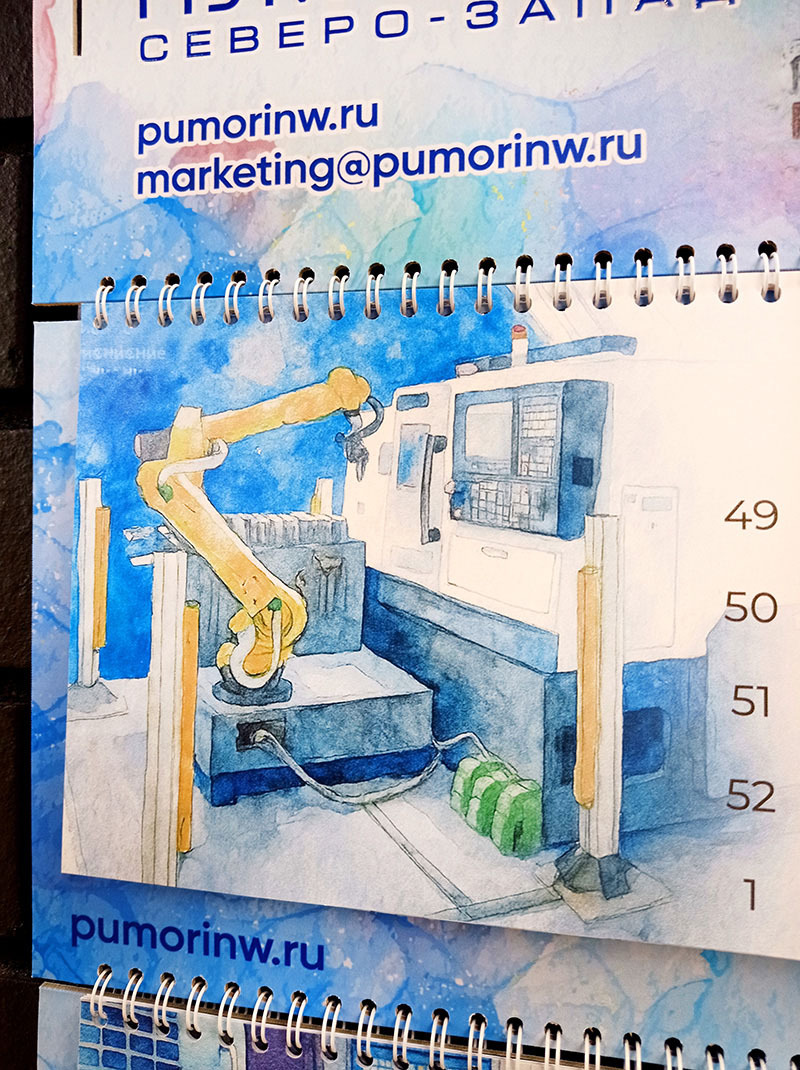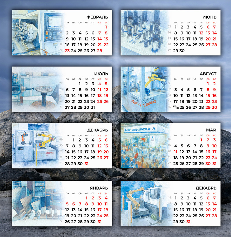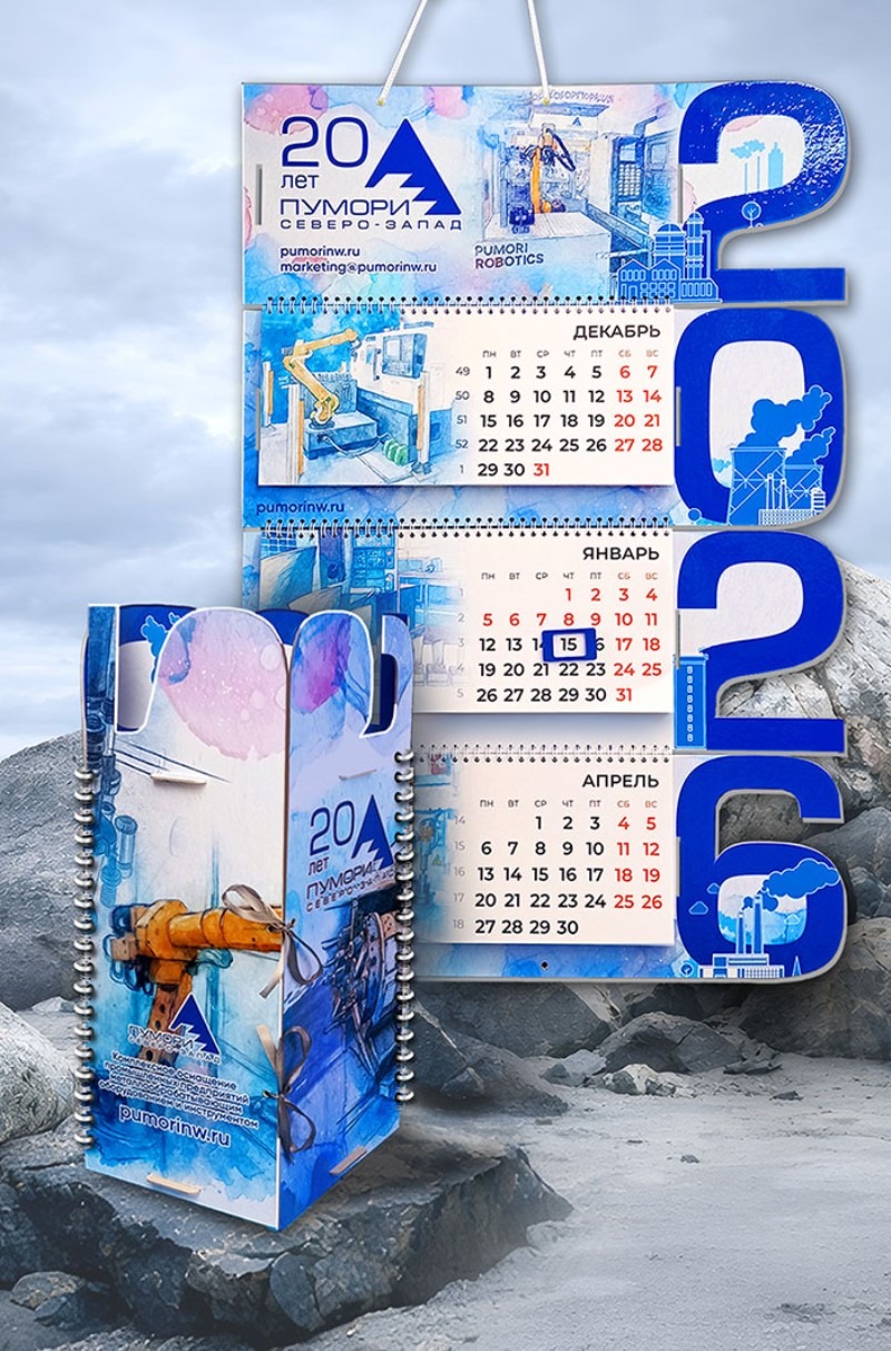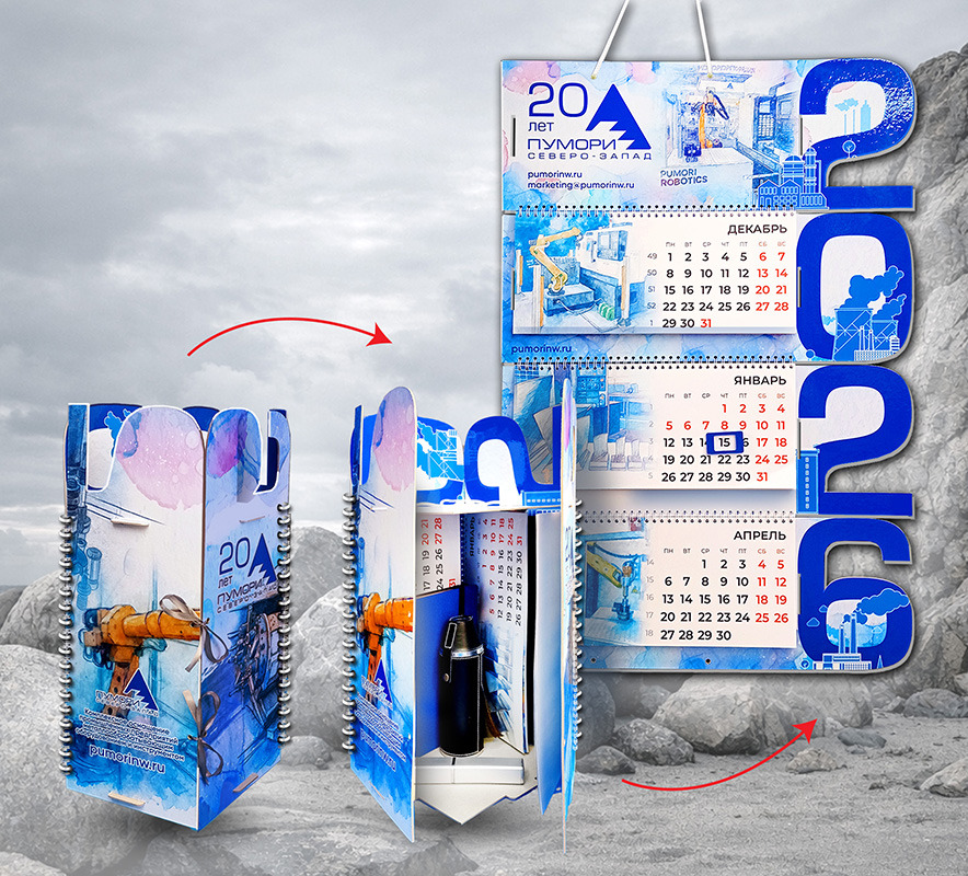 При выполнении заказа дизайнеры ООО «Лабиринт» объединили три идеи: вырубка «2026» акцентирует внимание на четкости планов компании на следующий год, а рисованный стиль календаря подчеркивает созидательную сторону производства: «Пумори» изготавливают станки от чертежа до готового изделия – так же, как художники пишут картины – от замысла к реализации, и в каждом из этих этапов присутствуют и высокое мастерство, и красота. Третья идея – функциональность во всем. Именно поэтому был выбран именно футляр – одновременно упаковка для подарка и календарь – польза и экономия времени налицо.