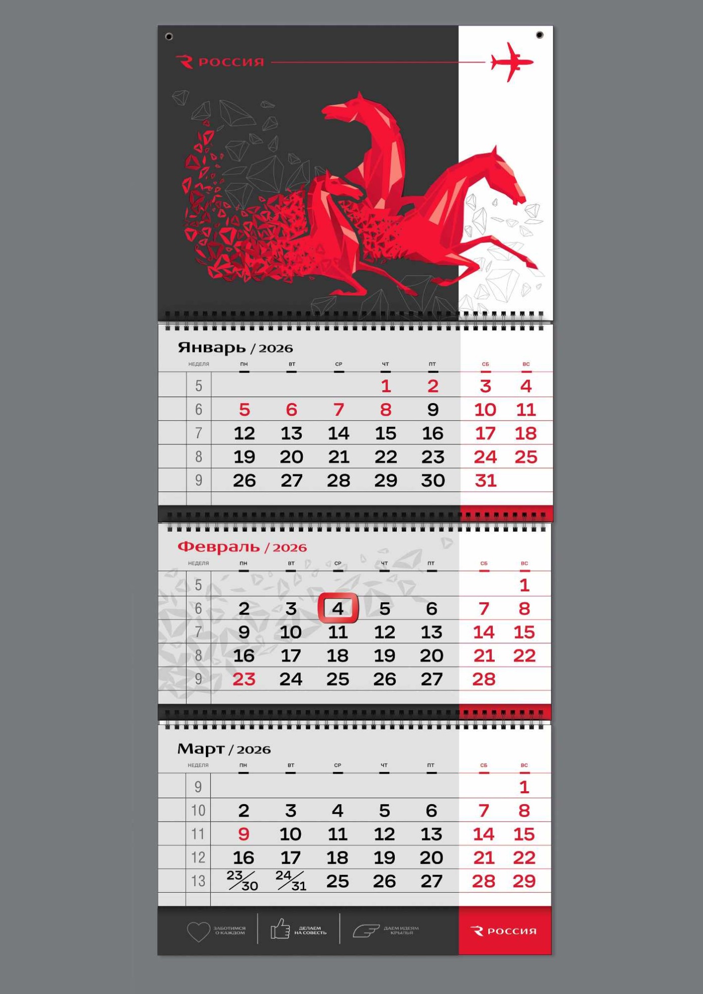 Календарь авиакомпании «Россия» – синтез фирменной айдентики, художественной метафоры и высокотехнологичного полиграфического исполнения. Концепция строится на визуальном сопоставлении динамики воздушного флота и символа национальной силы – тройки лошадей, чьи образы интегрированы с элементами ливреи самолетов. Такое решение формирует цельный визуальный код бренда: движение, мощь, масштаб, устремленность вперед.