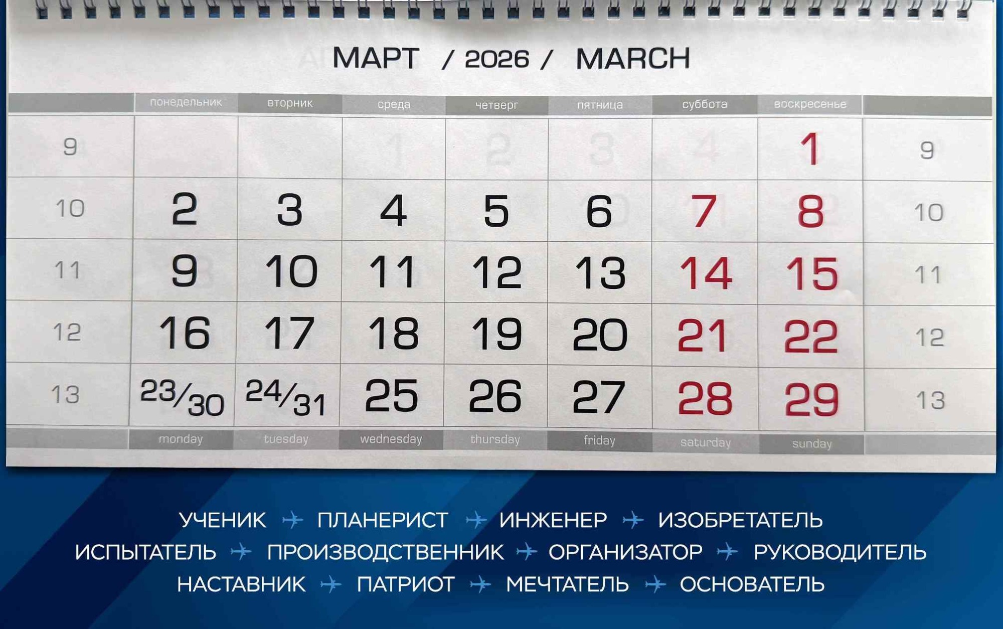 Календарь отпечатан на фольгированном картоне, что придает ему солидность, долговечность и символический блеск авиационного металла. Это – метафора прочности и высоты достижений.