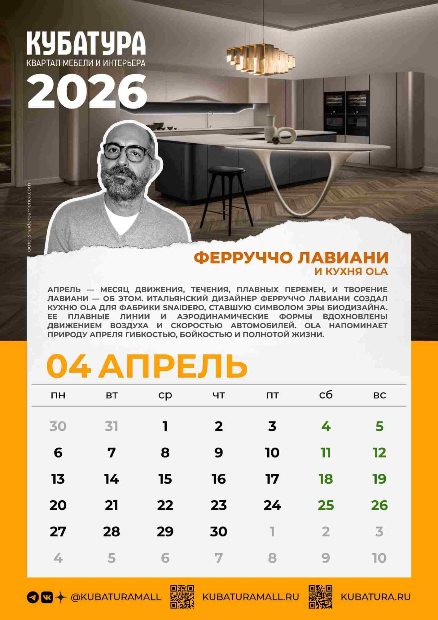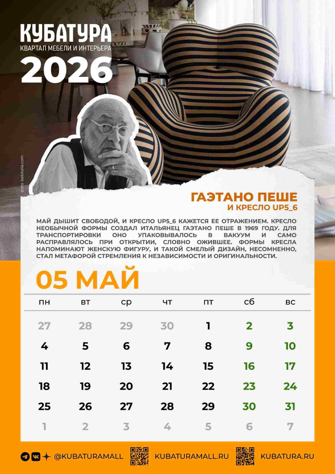Темой корпоративного календаря-2026 Санкт-Петербургского центра мебели и интерьера «Кубатура» стали «Легенды дизайна». Каждый месяц посвящен знаковым работам выдающихся дизайнеров мира и сопровождается небольшой историей их создания.