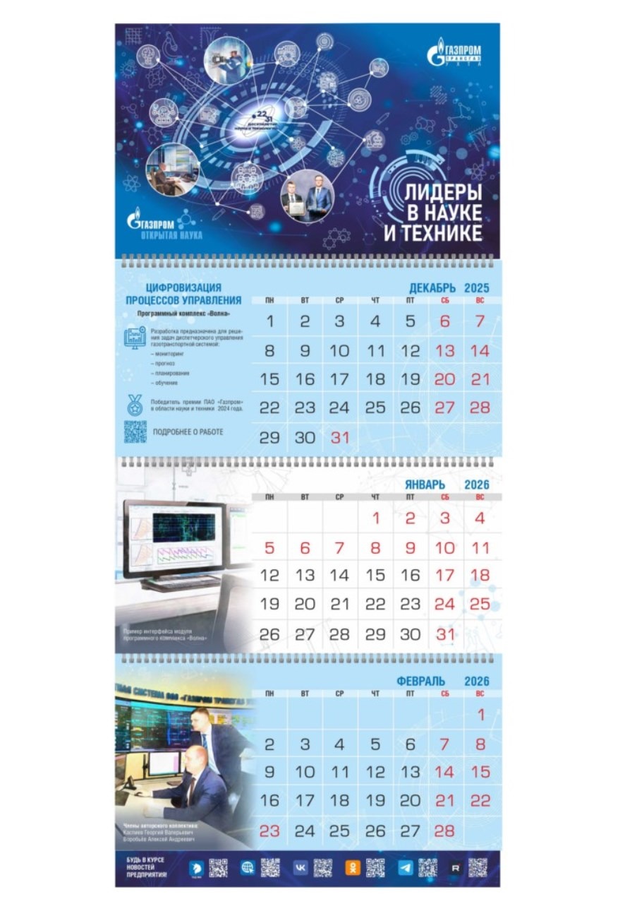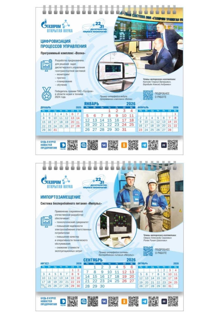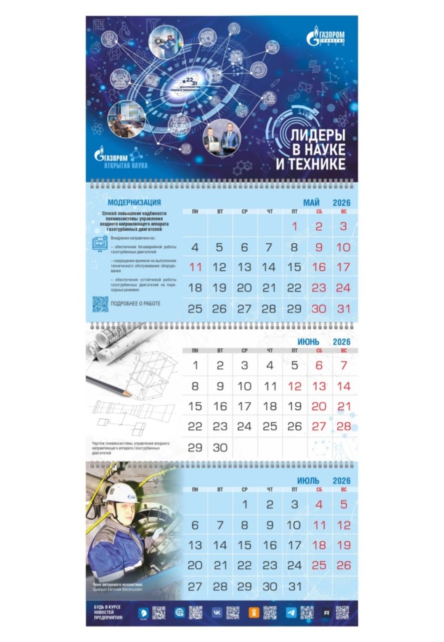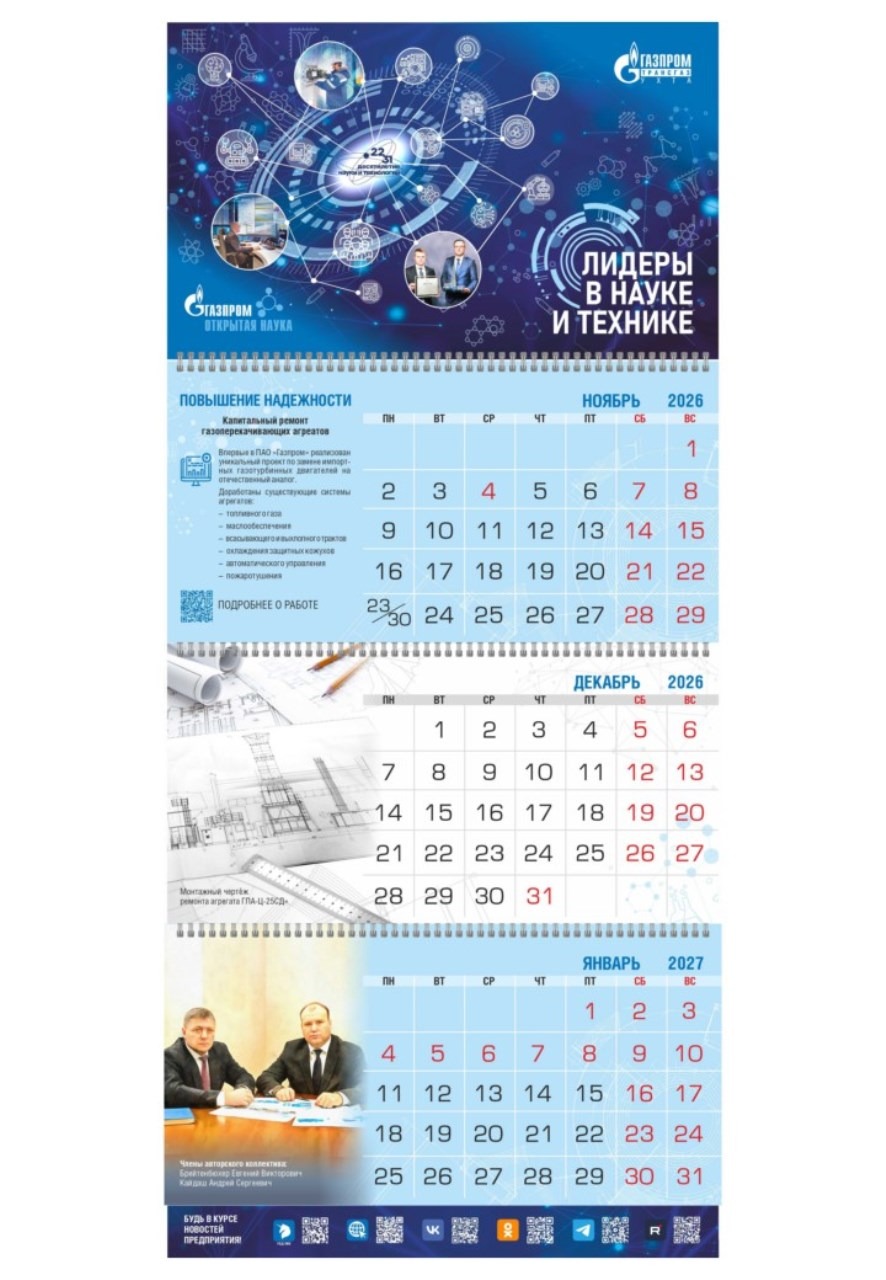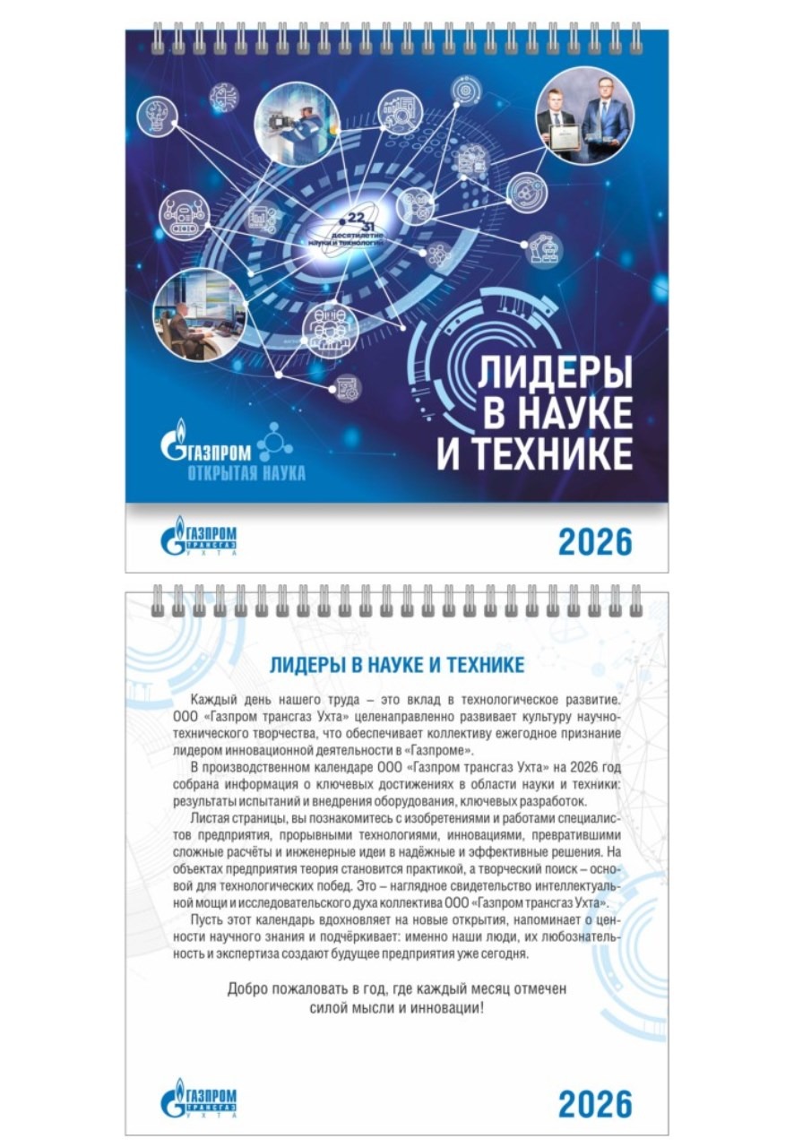 В производственном календаре ООО «Газпром трансгаз Ухта» на 2026 год собрана информация о ключевых достижениях в области науки и техники: результаты испытаний и внедрения оборудования, ключевых разработок.