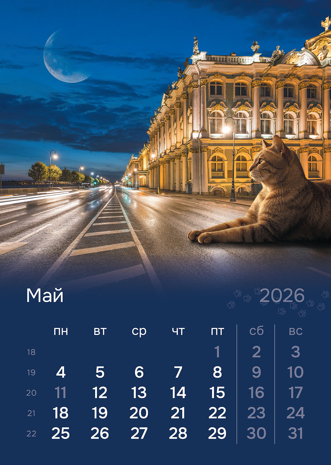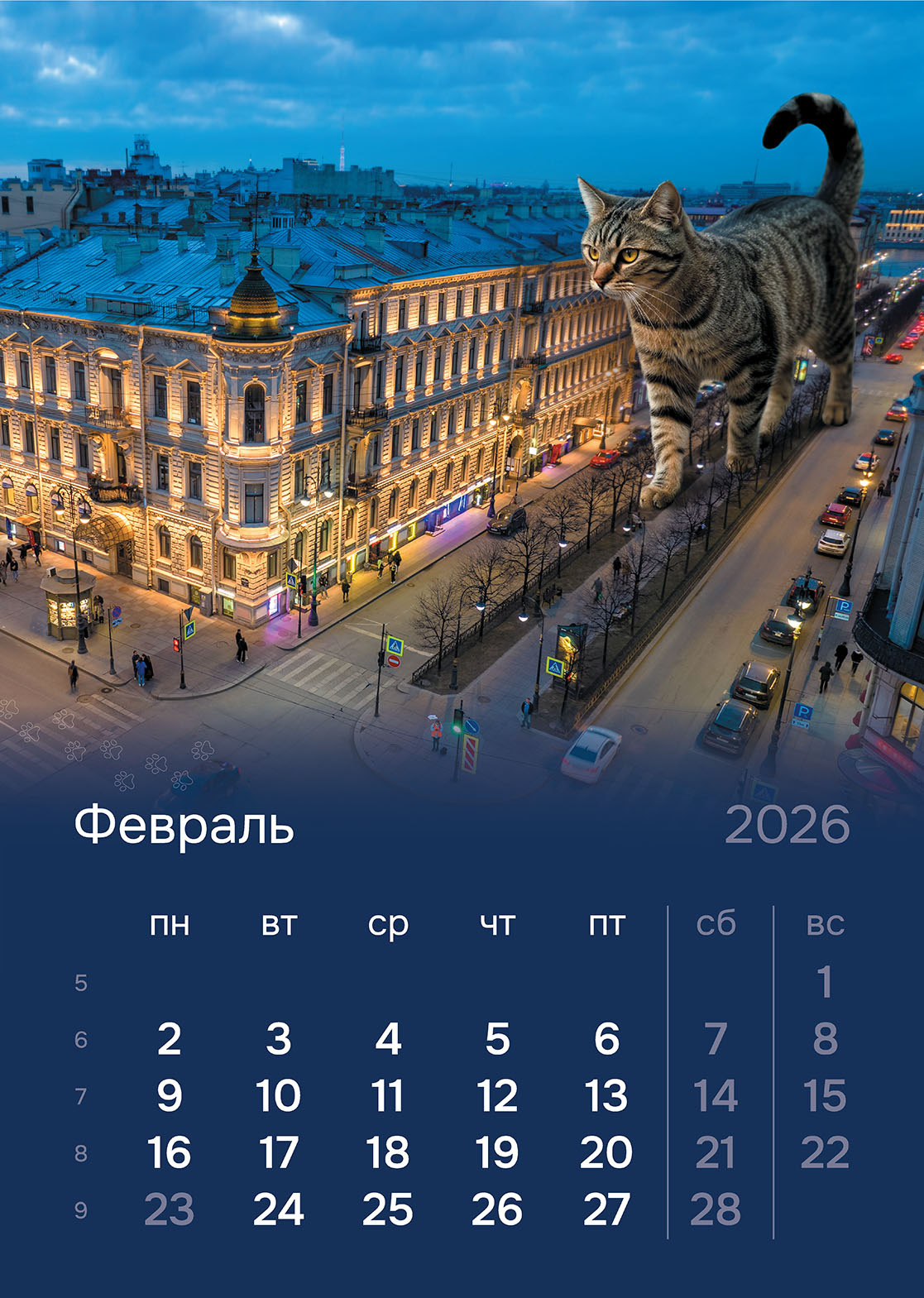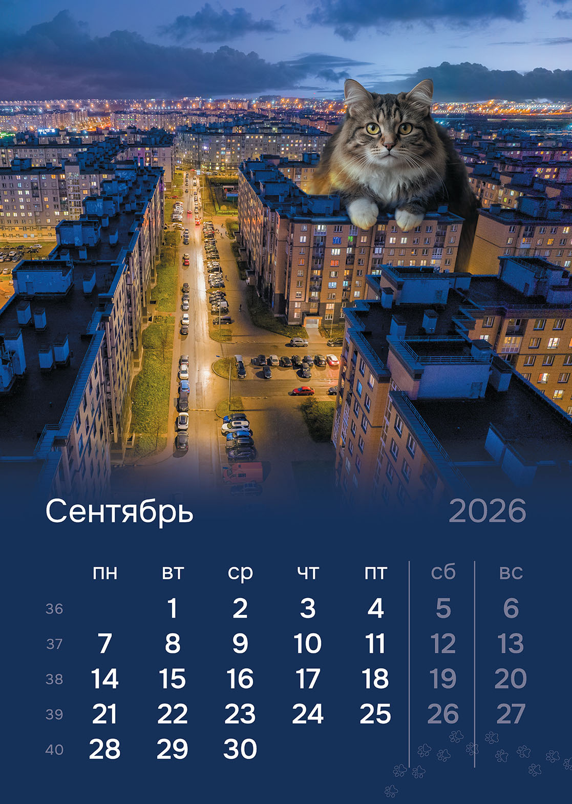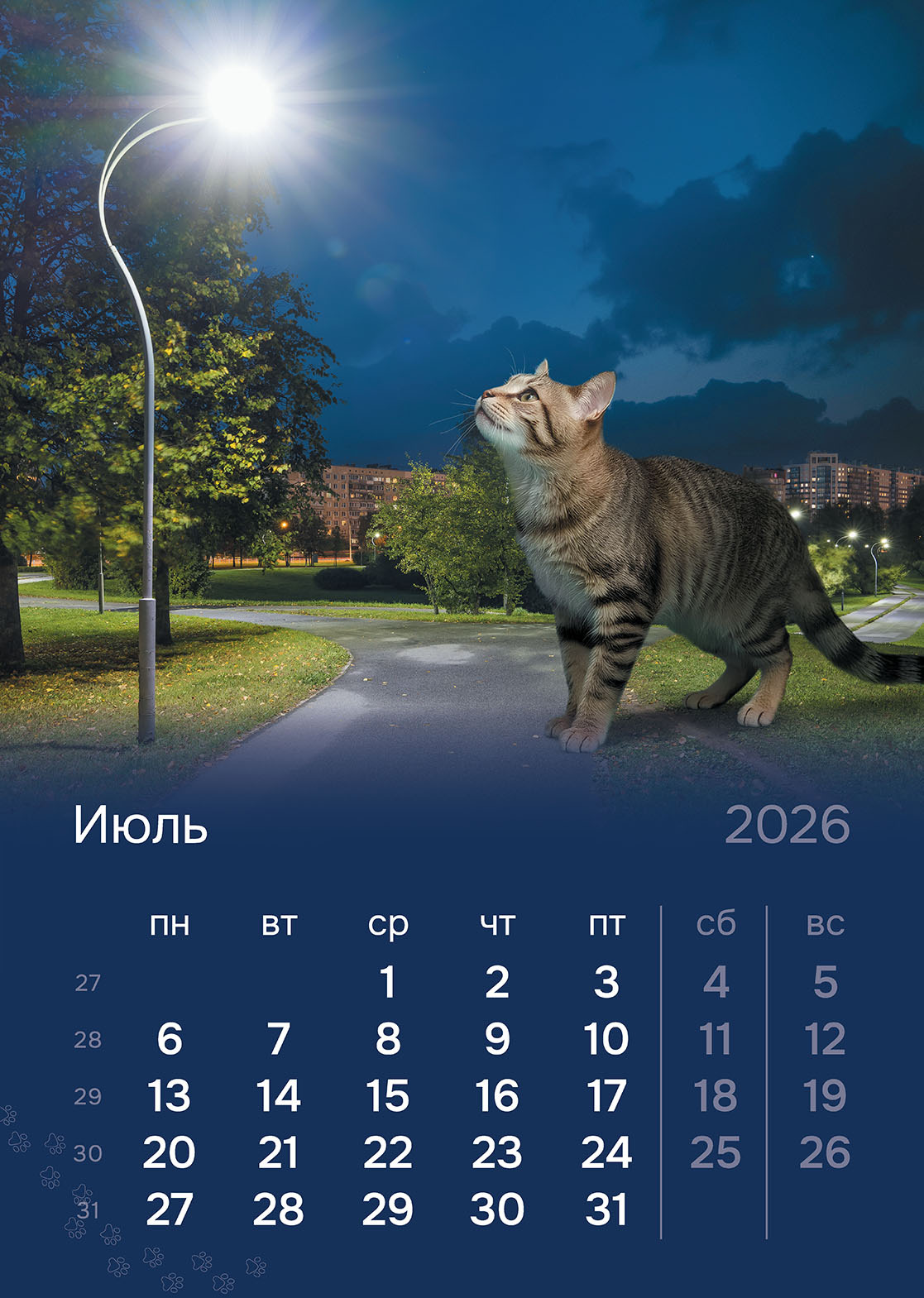 Формат календаря – 420×549 мм, вертикальный; 13 полос (обложка + 12 месяцев), крепление на пружину. Содержание максимально визуальное: крупные городские сцены, единая синяя ночная палитра и акцент на освещении. Текст сведён к современной удобной календарной сетке. В дизайне сохранены фирменный цвет и небольшие «пасхалки» – следы лап; характер и образ кота подбираются под настроение каждого месяца.