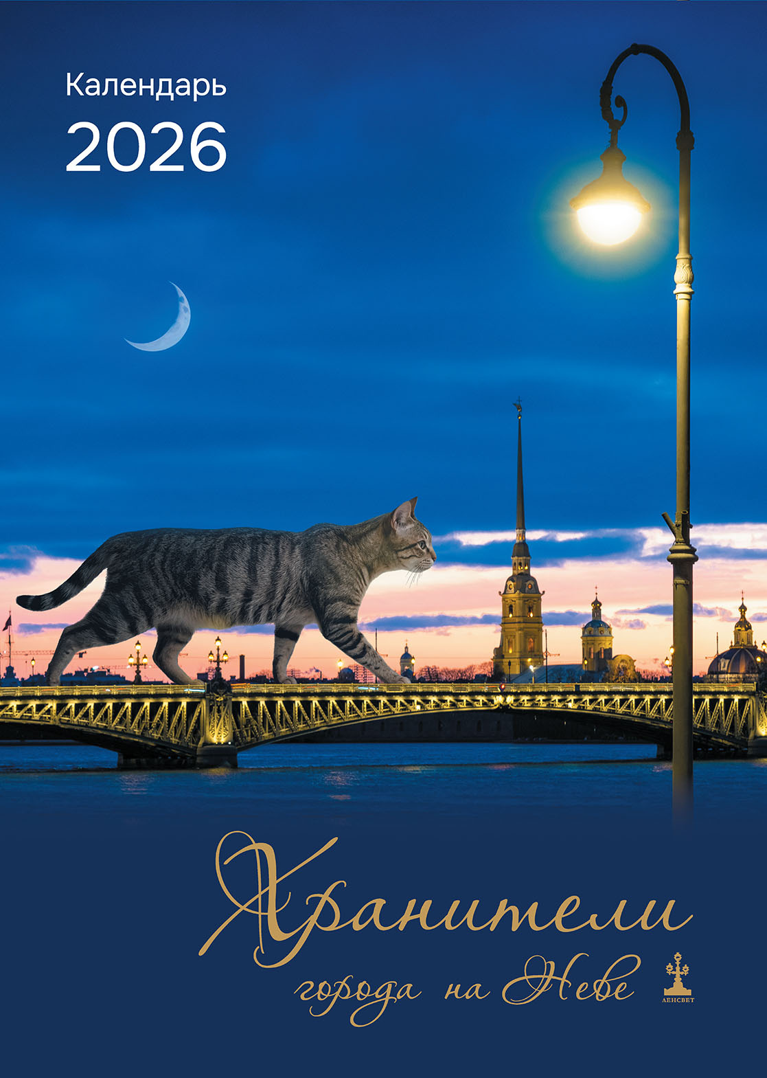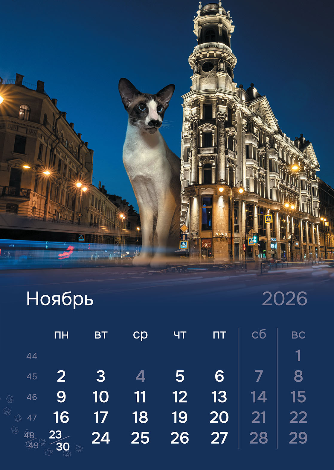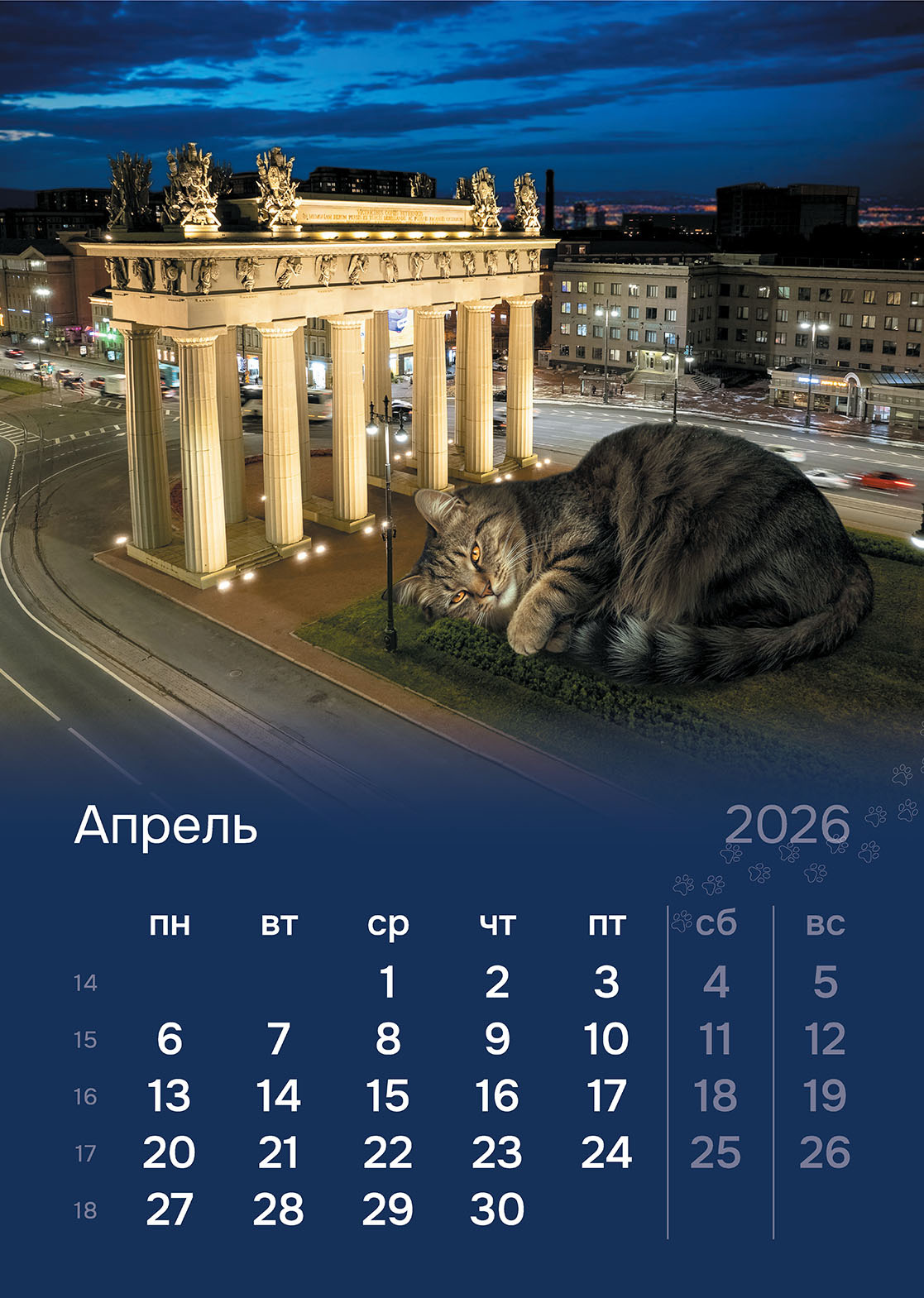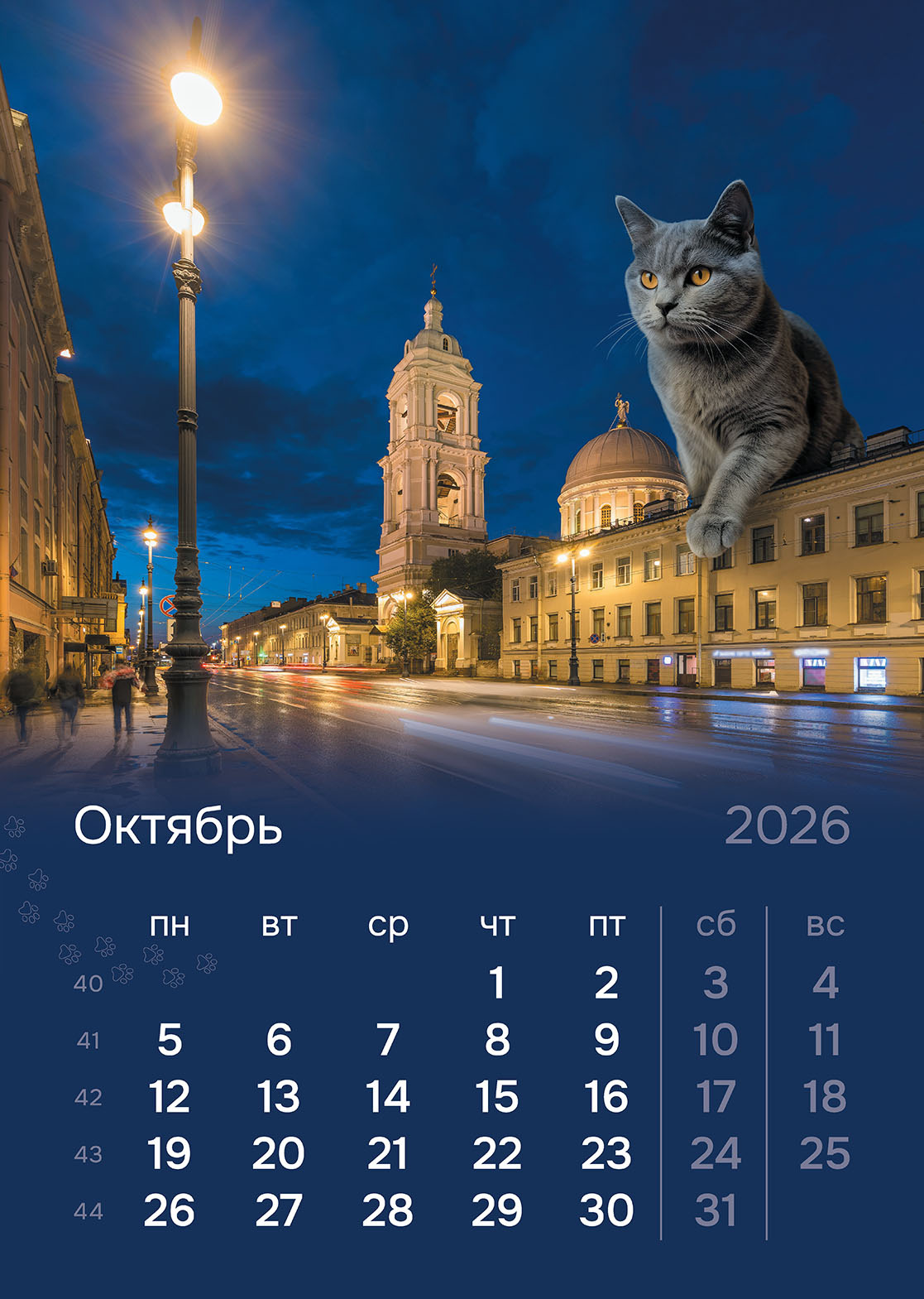 Формат календаря – 420×549 мм, вертикальный; 13 полос (обложка + 12 месяцев), крепление на пружину. Содержание максимально визуальное: крупные городские сцены, единая синяя ночная палитра и акцент на освещении. Текст сведён к современной удобной календарной сетке. В дизайне сохранены фирменный цвет и небольшие «пасхалки» – следы лап; характер и образ кота подбираются под настроение каждого месяца.